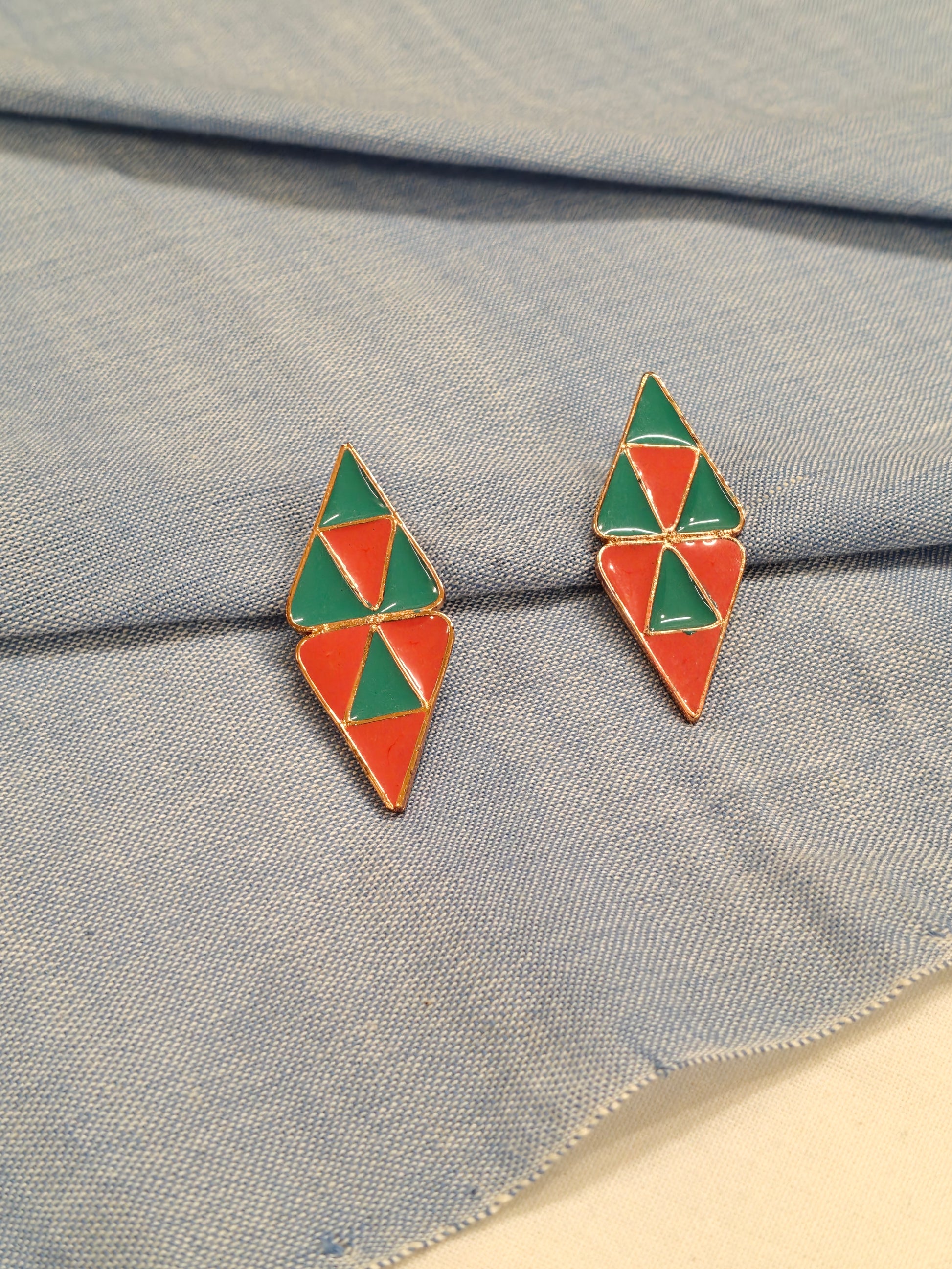Orange green enamel rhombus made by triangles studs earrings - handcrafted in copper - available in copper, silver n gold finish