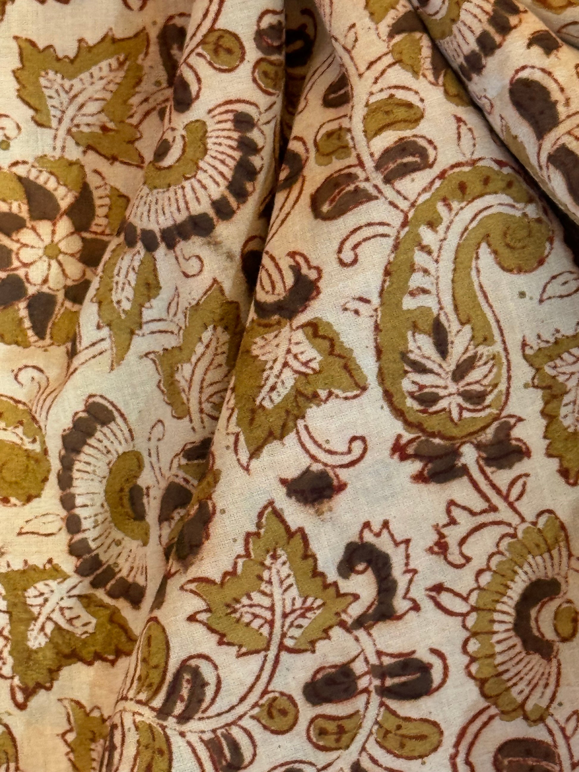Paisley floral motifs hand block printed natural dyed Kalamkari cotton fabric - 63 inches wide panna