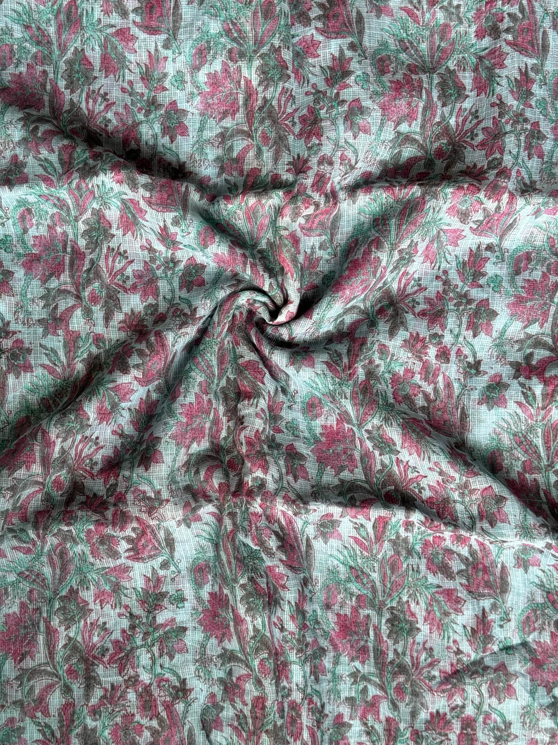 Pastel blue floral hand block printed light and soft kota doria cotton fabric