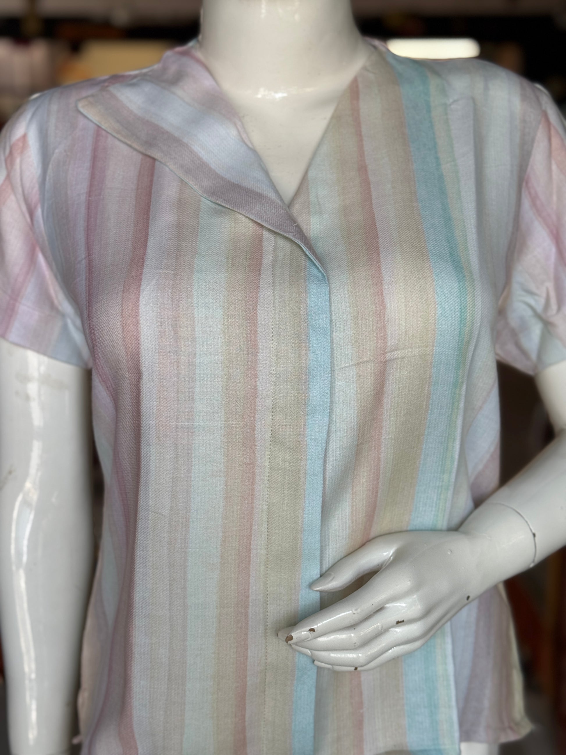 Pastel stripes handwoven soft textured cotton top with shoulder sleeves and asymmetric neckline