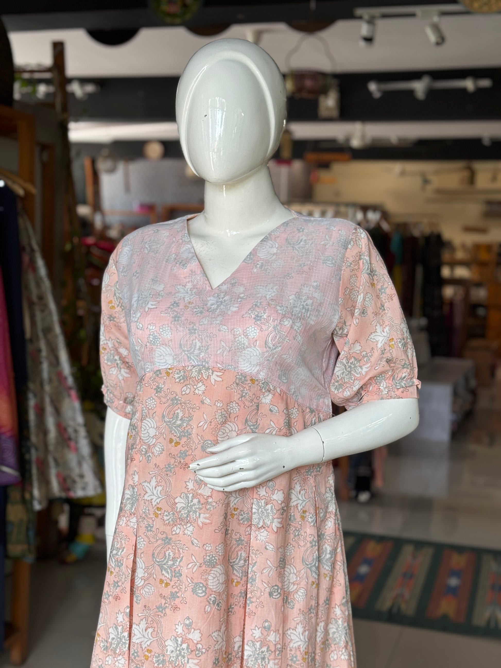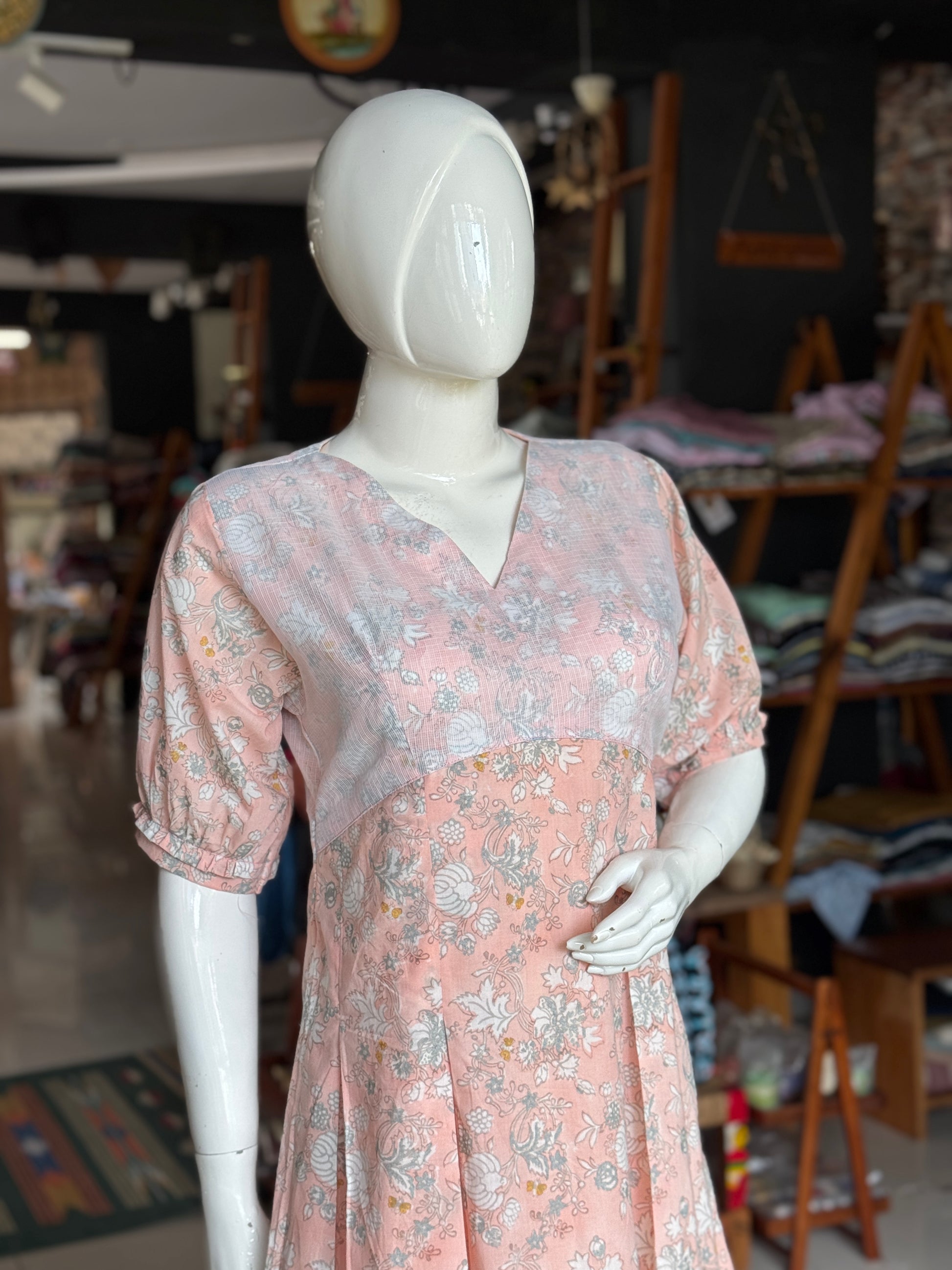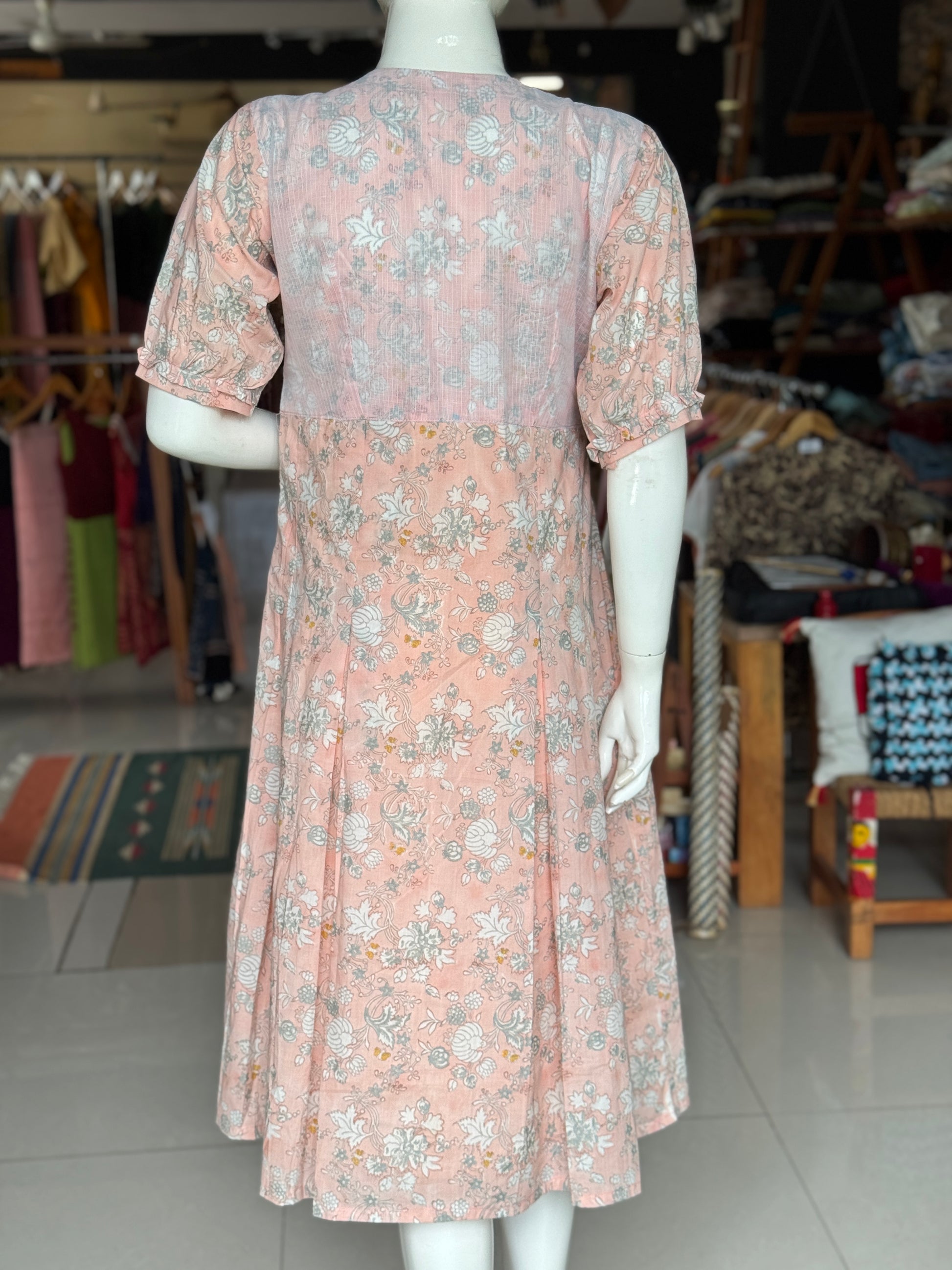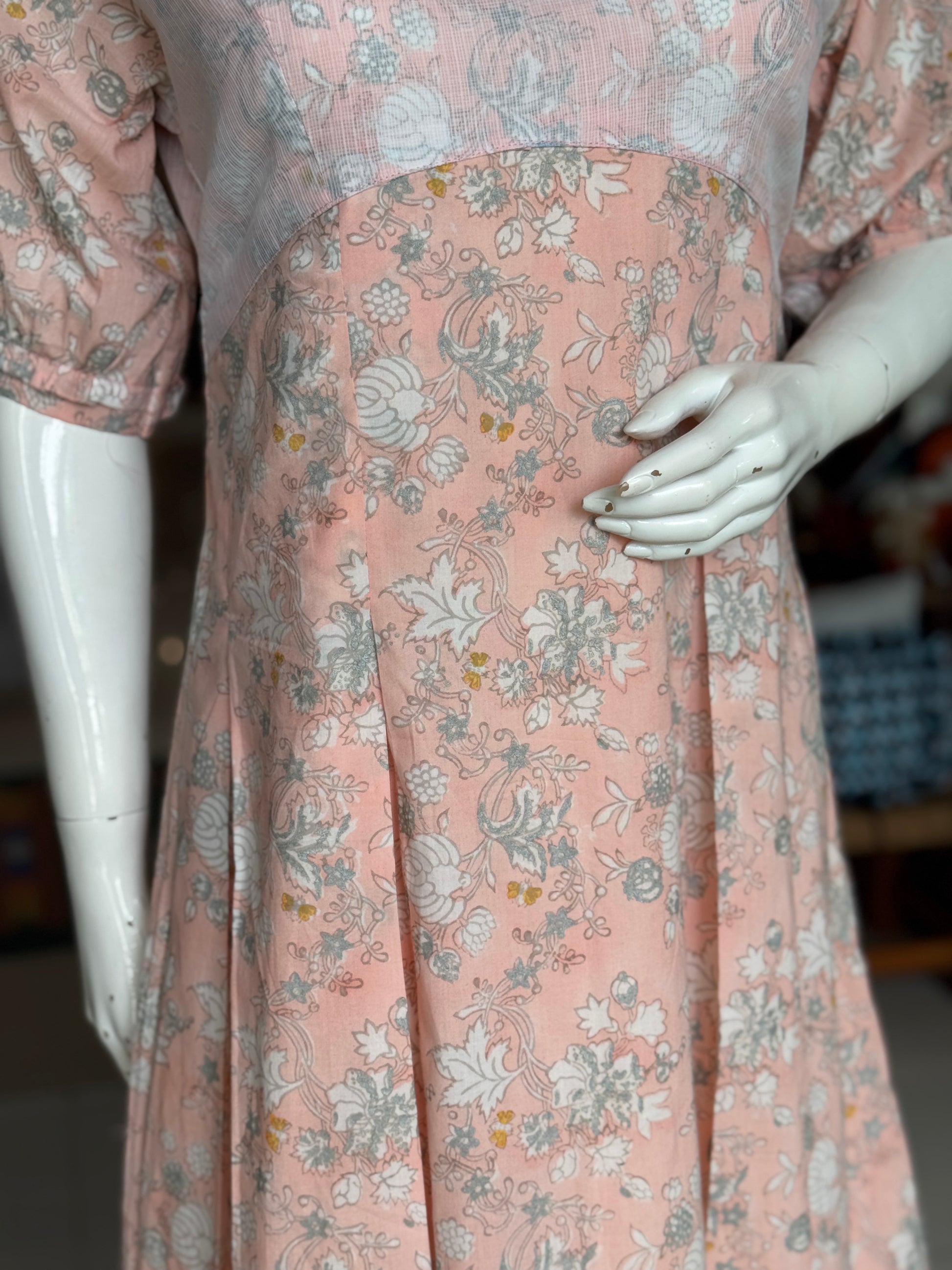 Peach floral hand block printed soft cotton dress with white kota cotton overlay