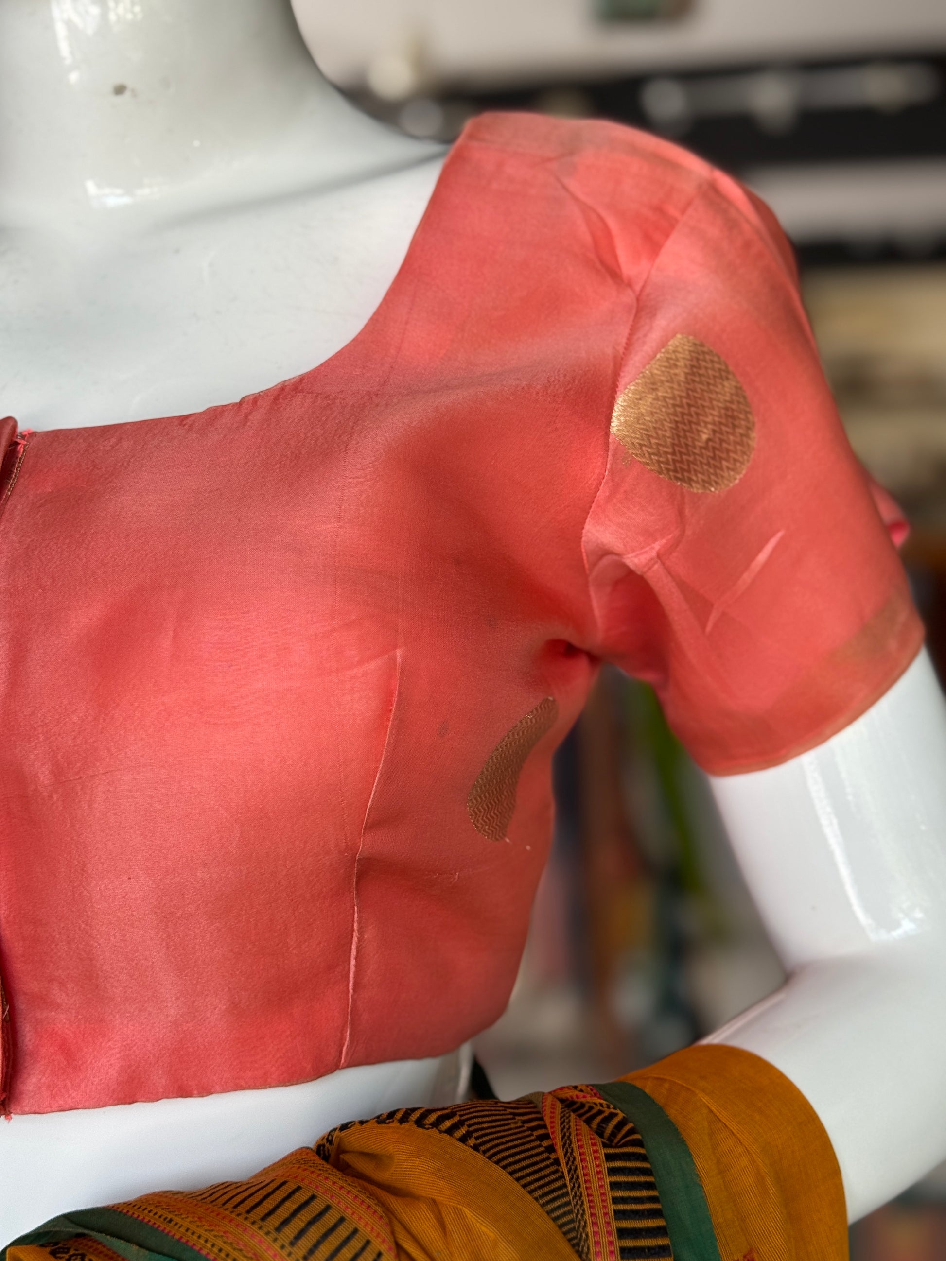 Peach pure silk organza handwoven blouse with gold circle motifs