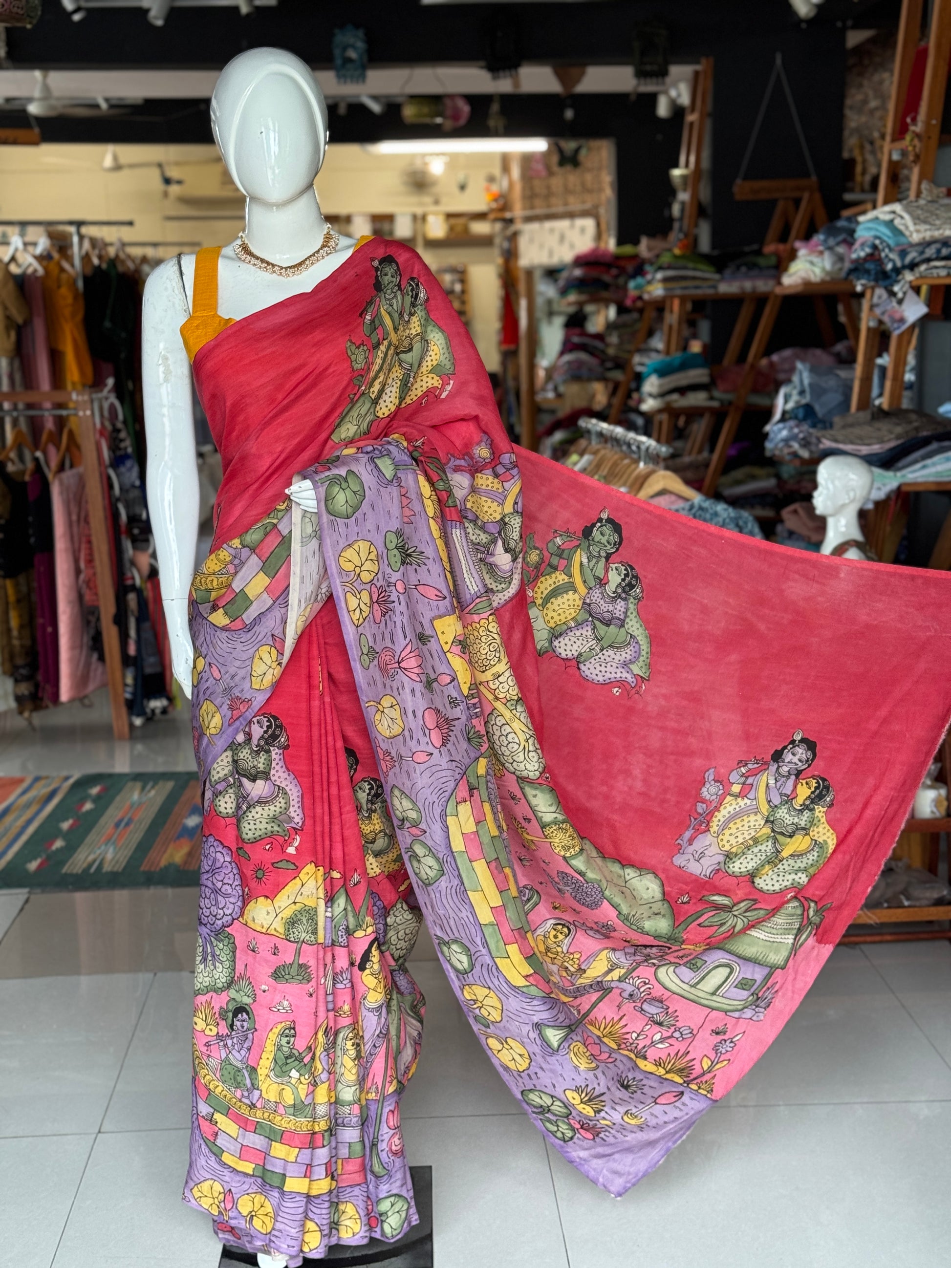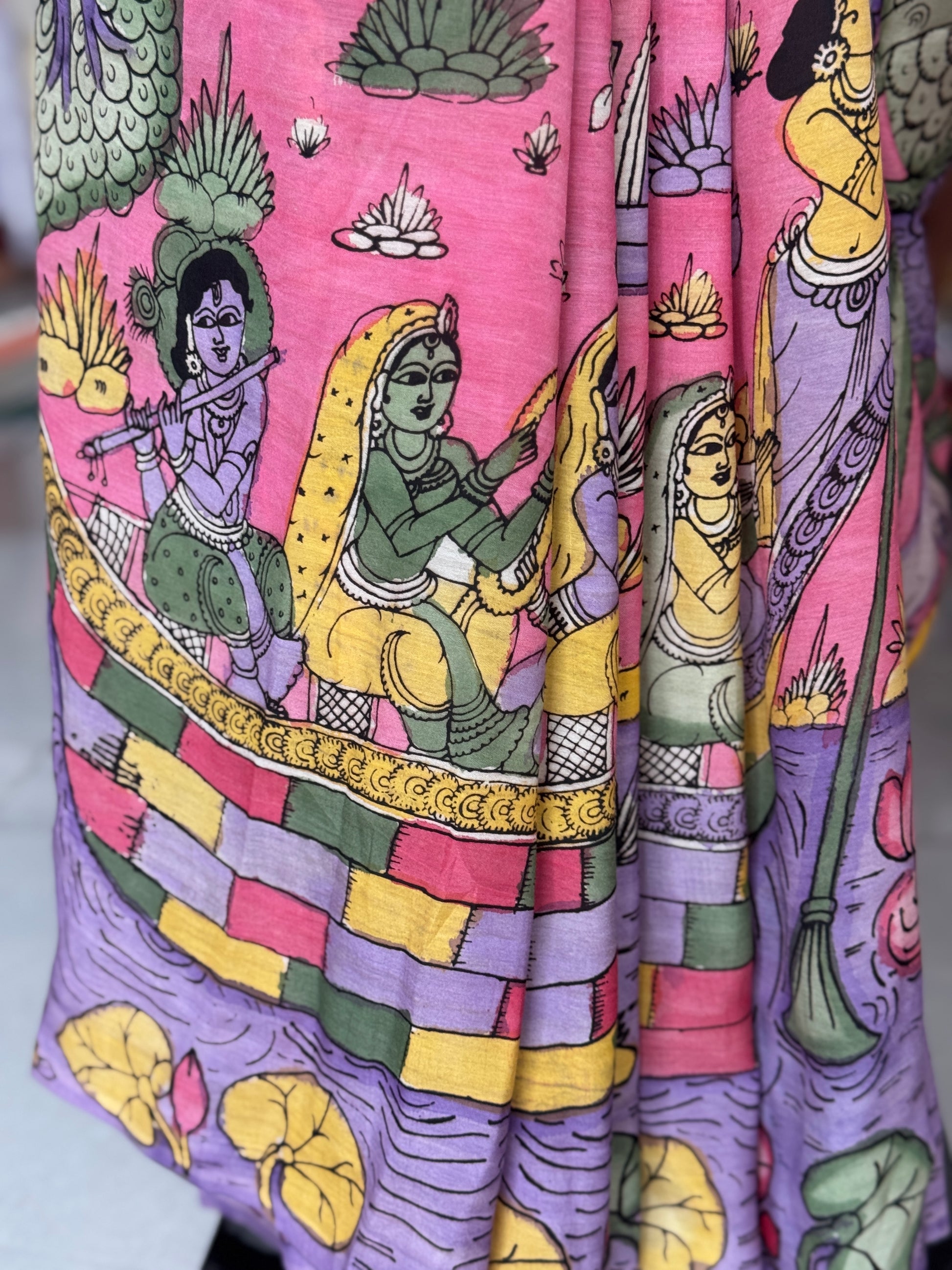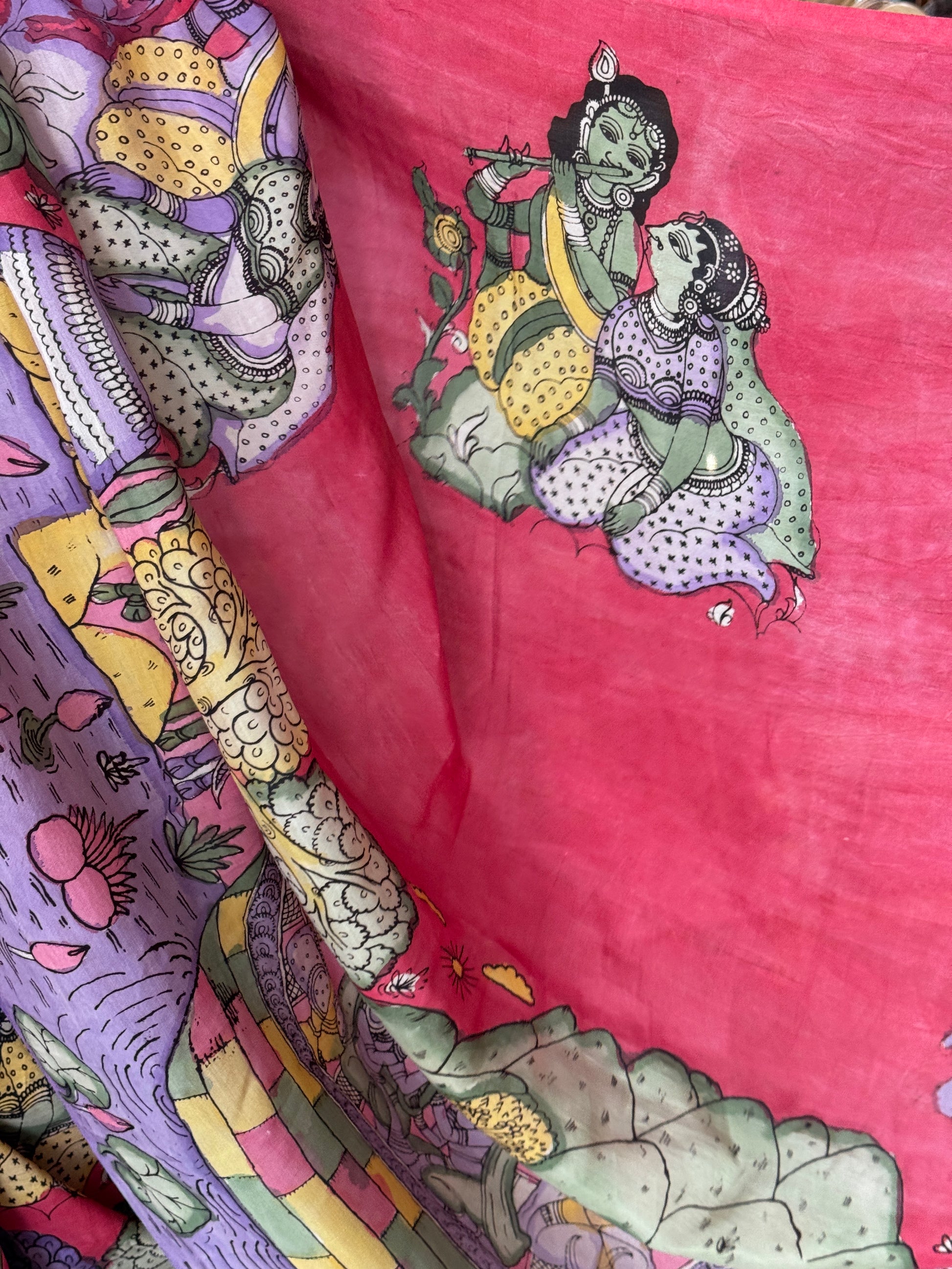 Pink and lavender hand painted pen kalamkari Chennuri silk yardage saree with skirt border and Radha Krishna design