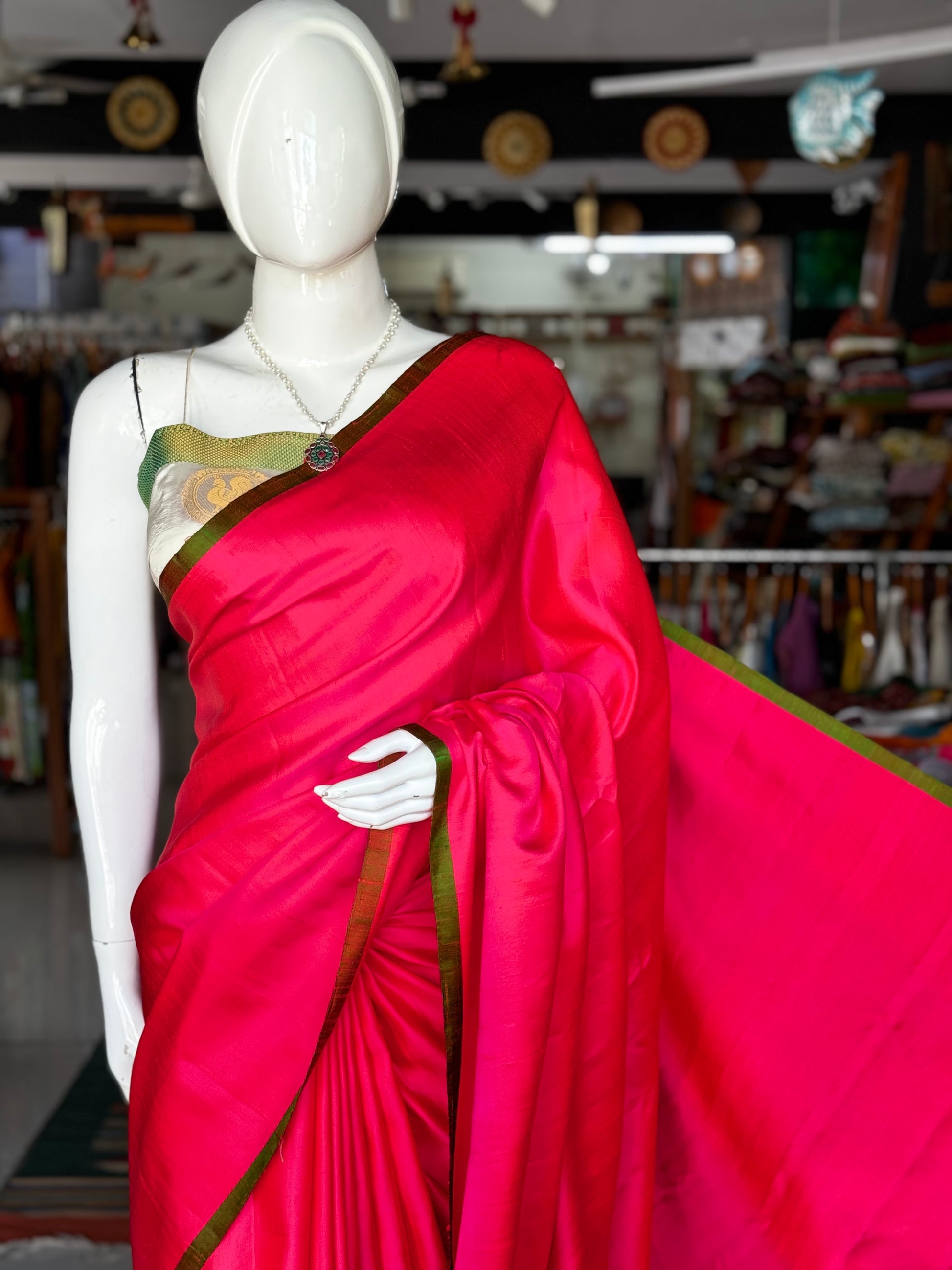 Pink and orange dual tone pure silk twill weave handwoven plain saree with contrast green pallu and border