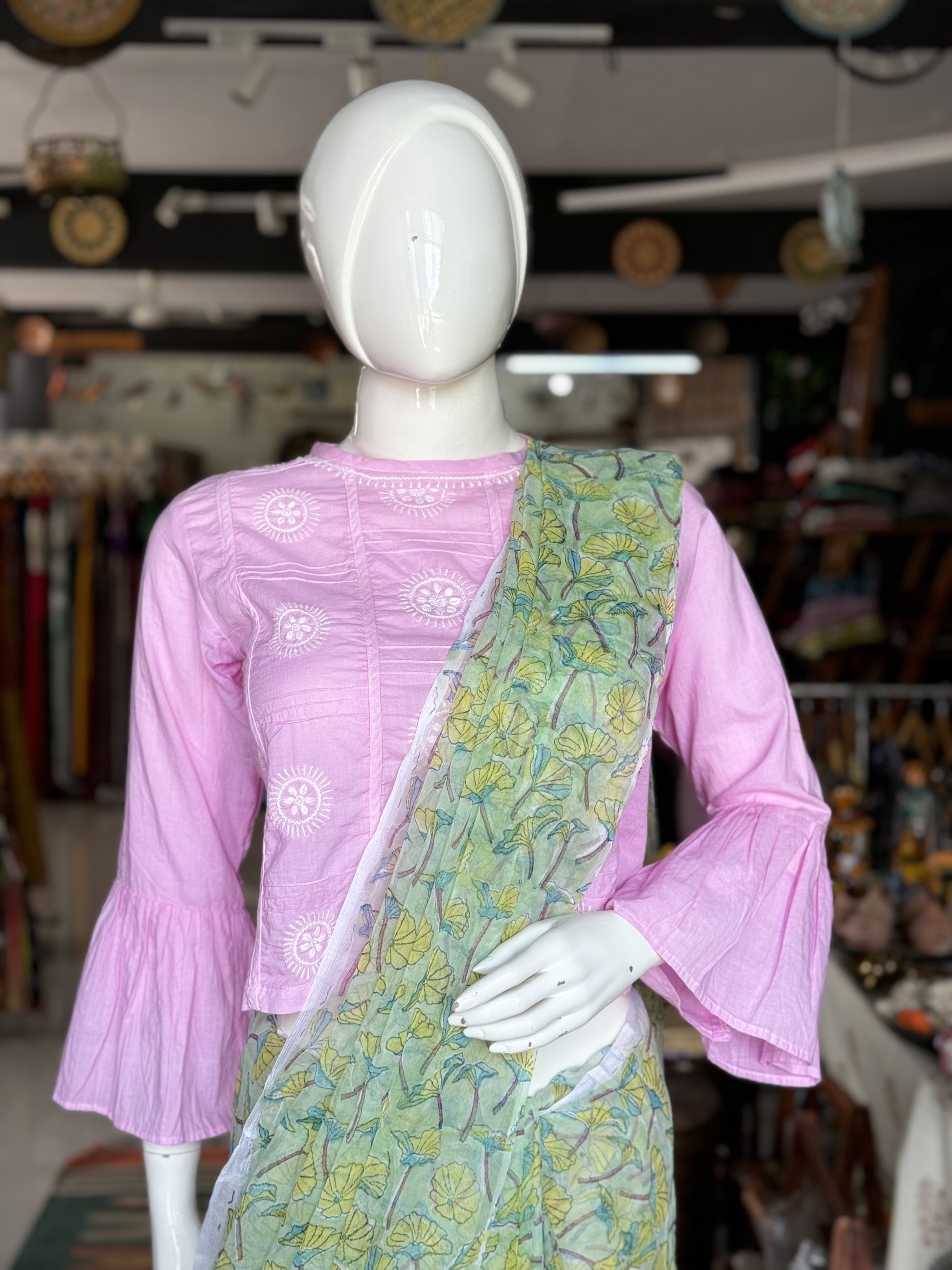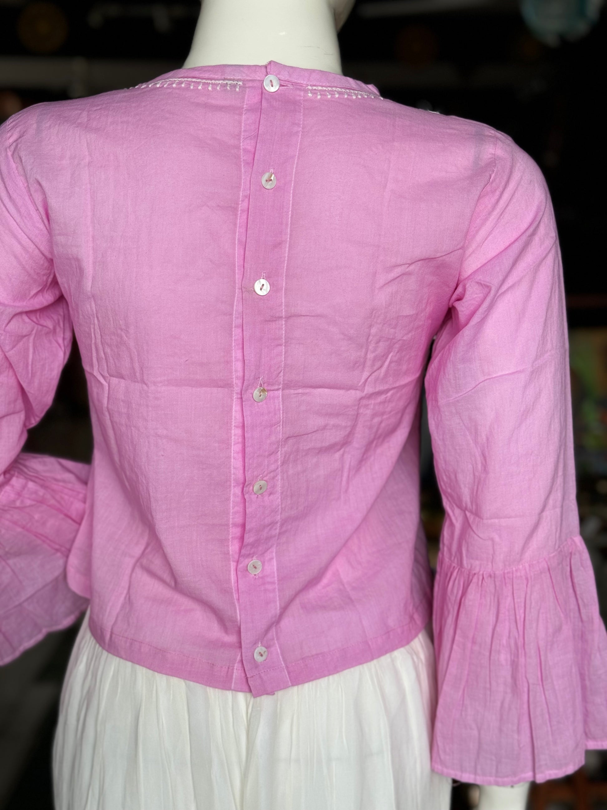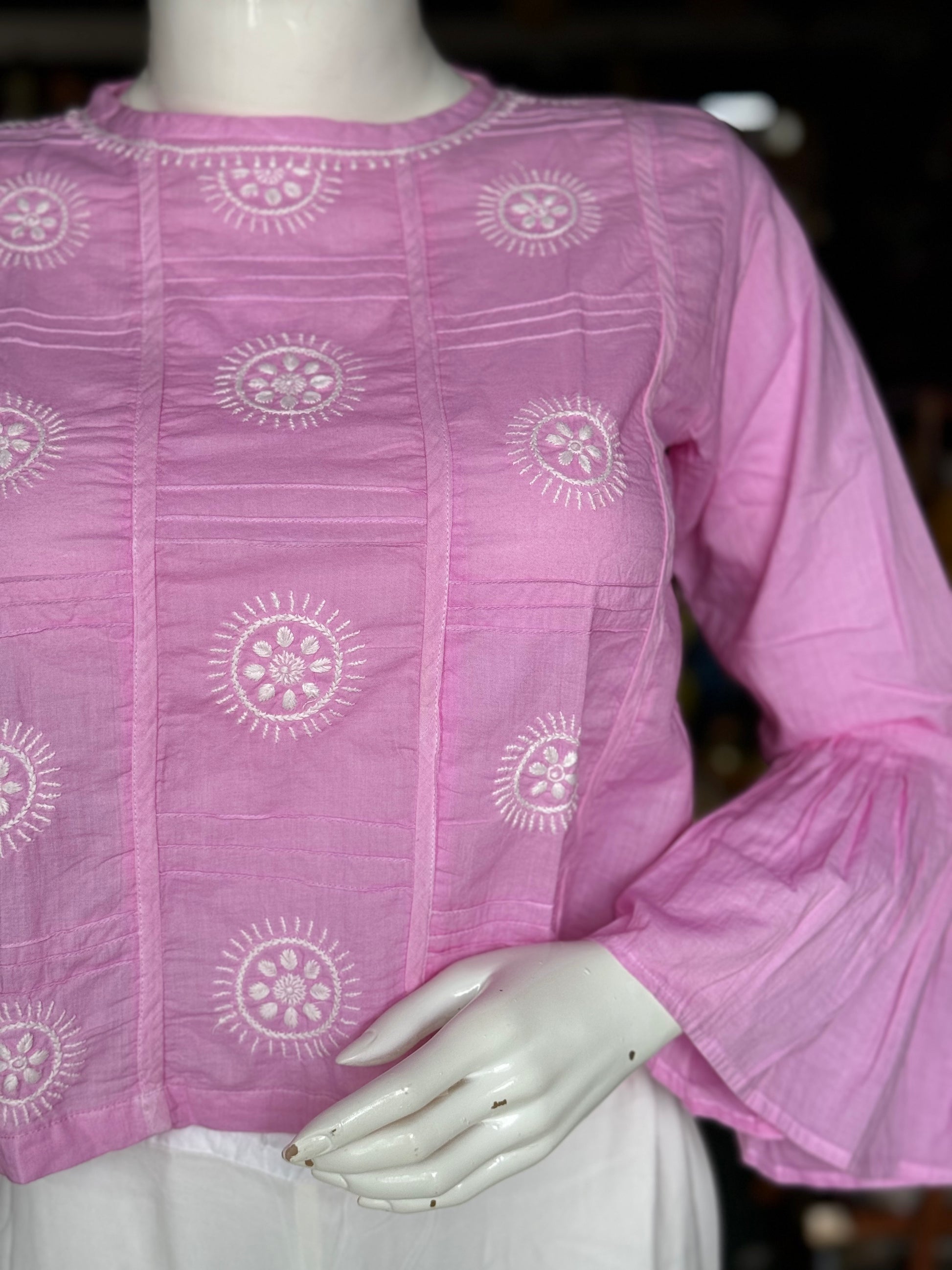 Pink cotton chikankari hand embroidered crop top with flared sleeves