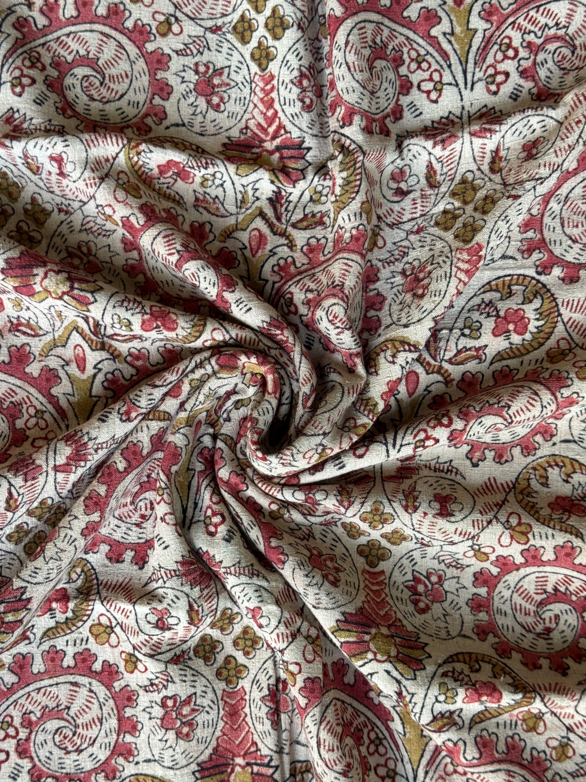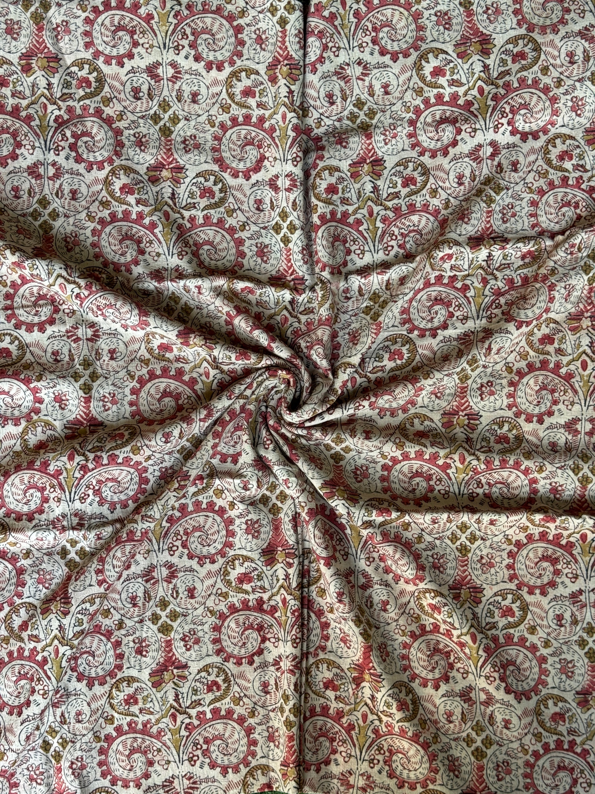 Pink, green, beige flowers pattern hand block printed natural dyed Kalamkari cotton fabric