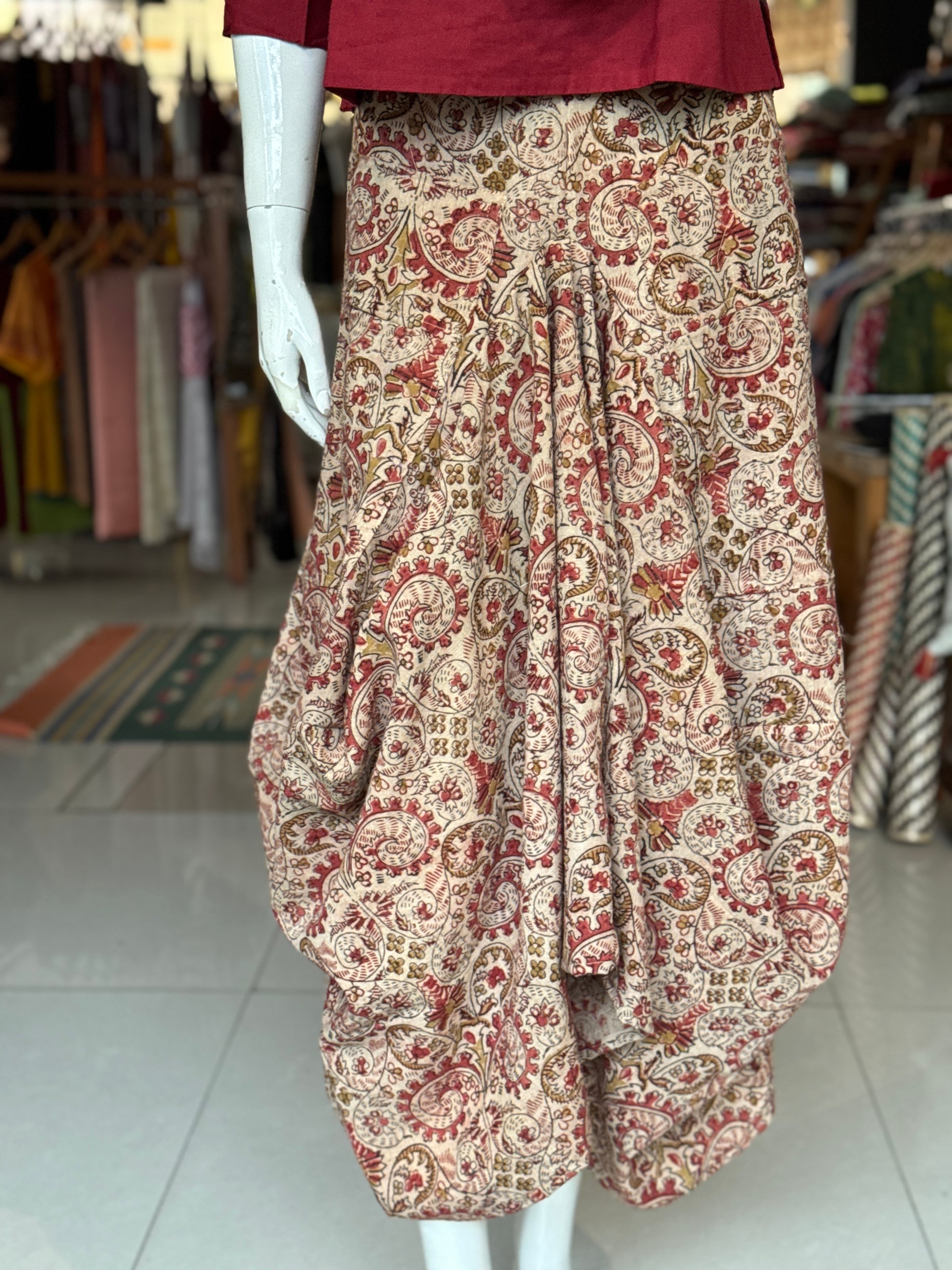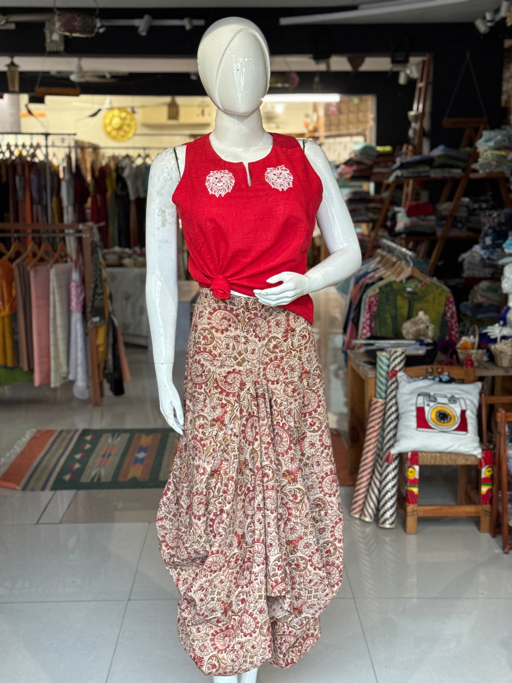 Pink, green, beige flowers pattern natural dyed, hand block printed cotton designer skirt - with pockets