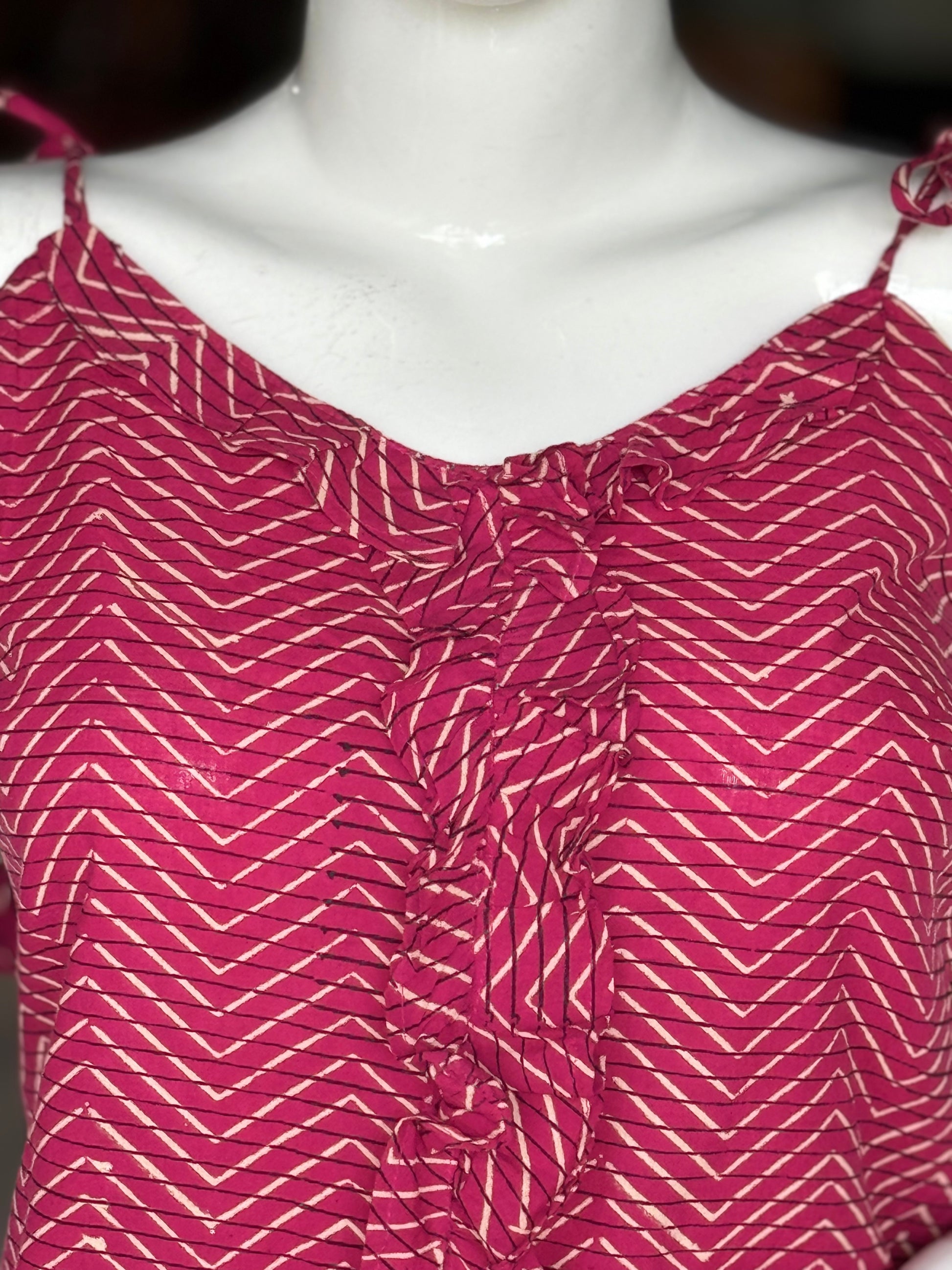 Pink zigzag stripes hand block printed cotton spaghetti tie up top with ruffles detailing
