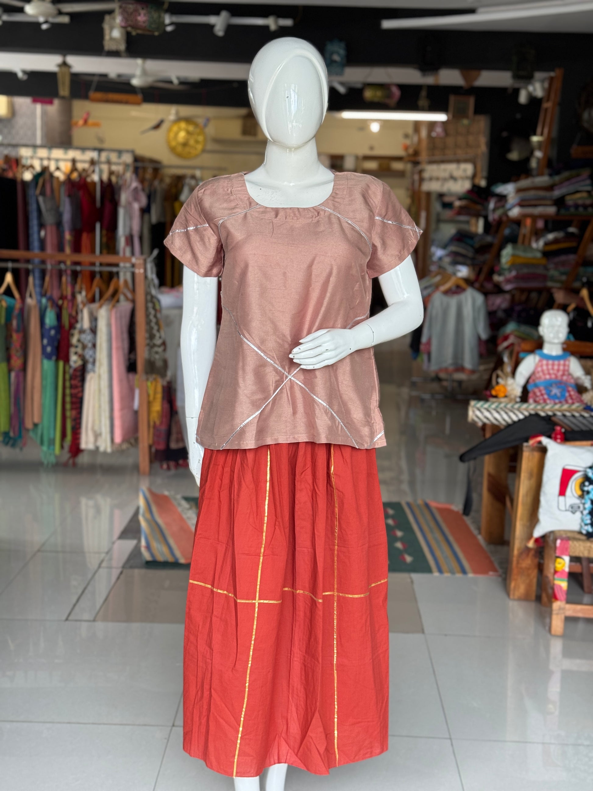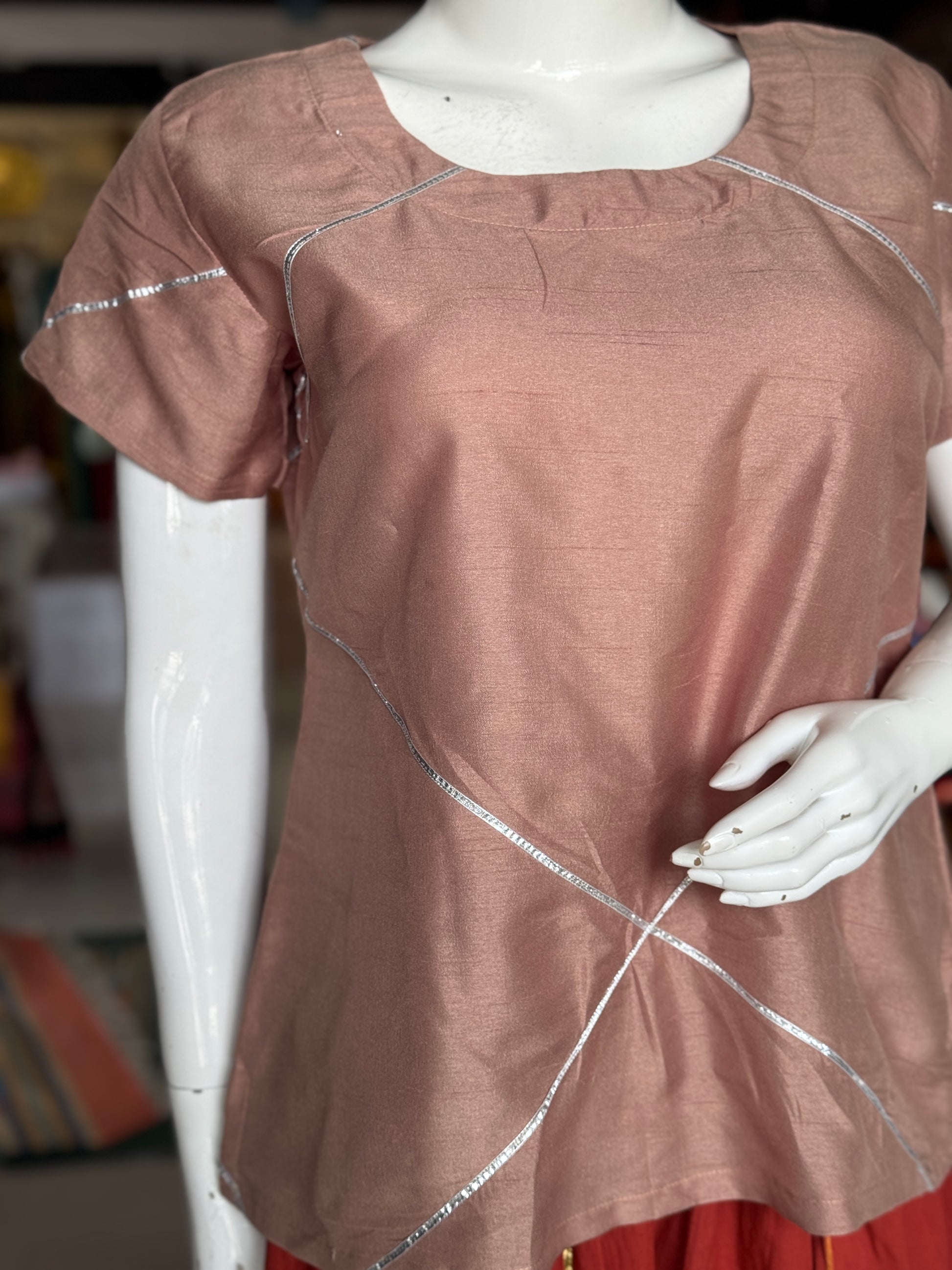 Pinkish brown art silk short top with silver gota