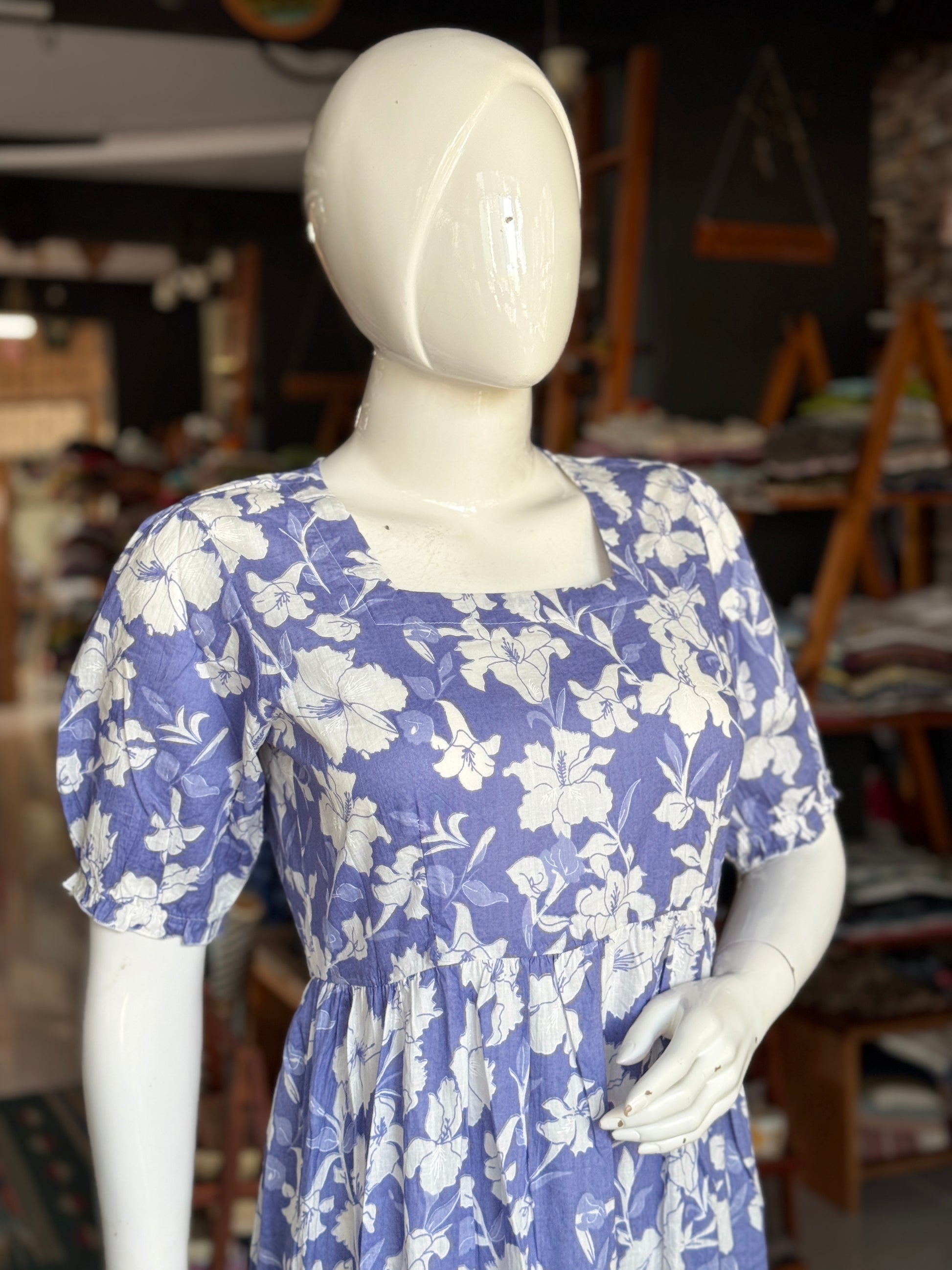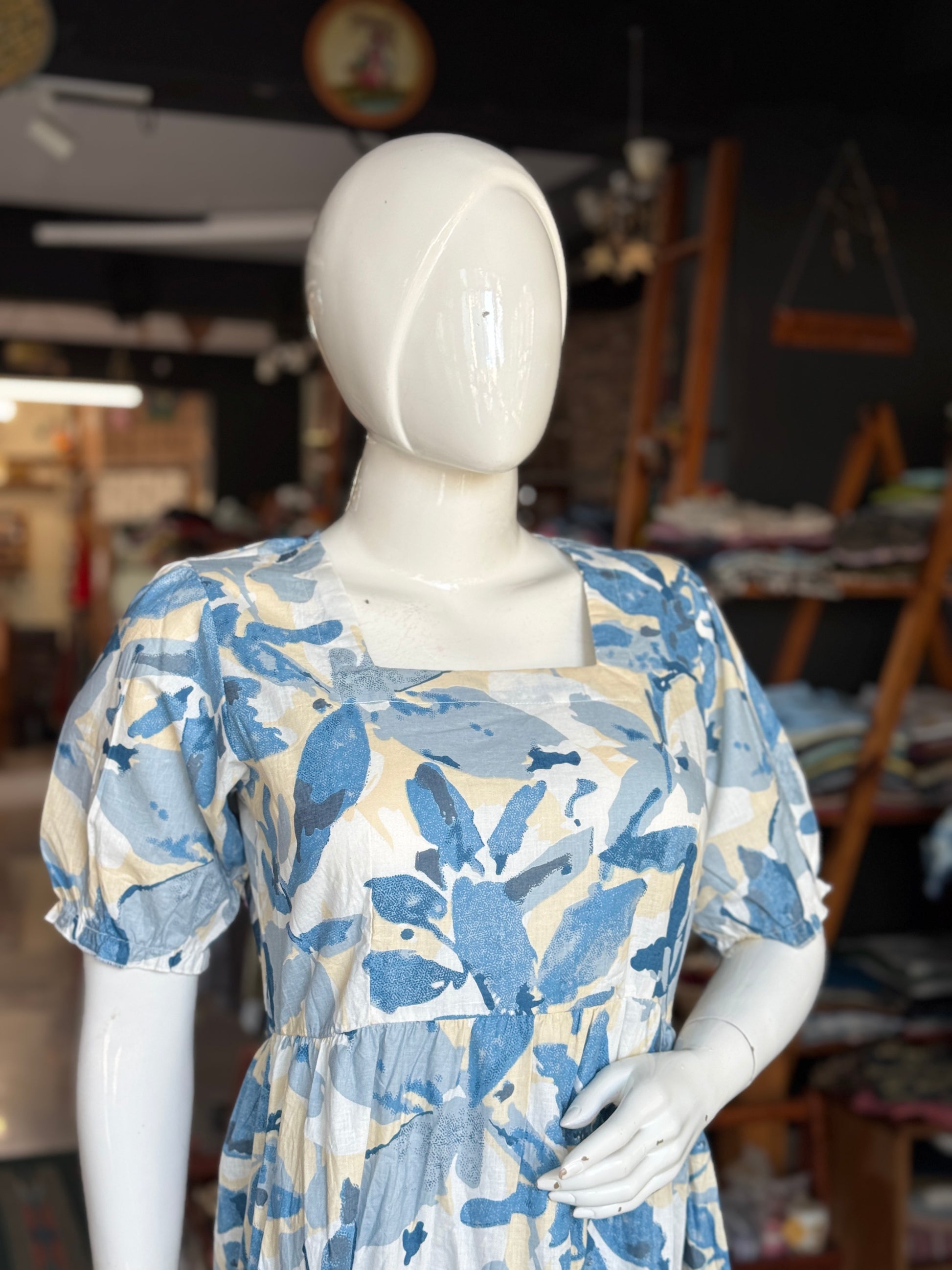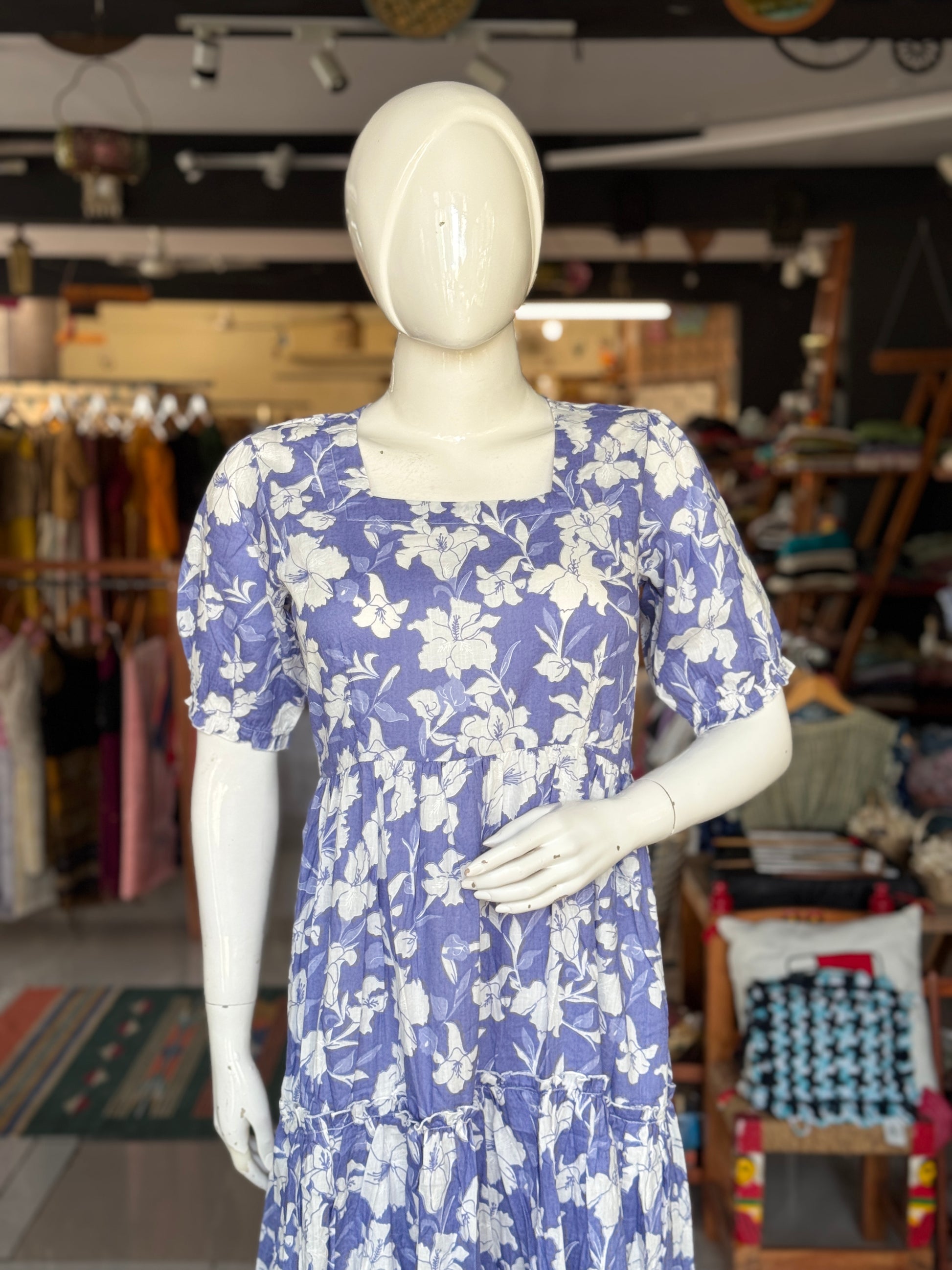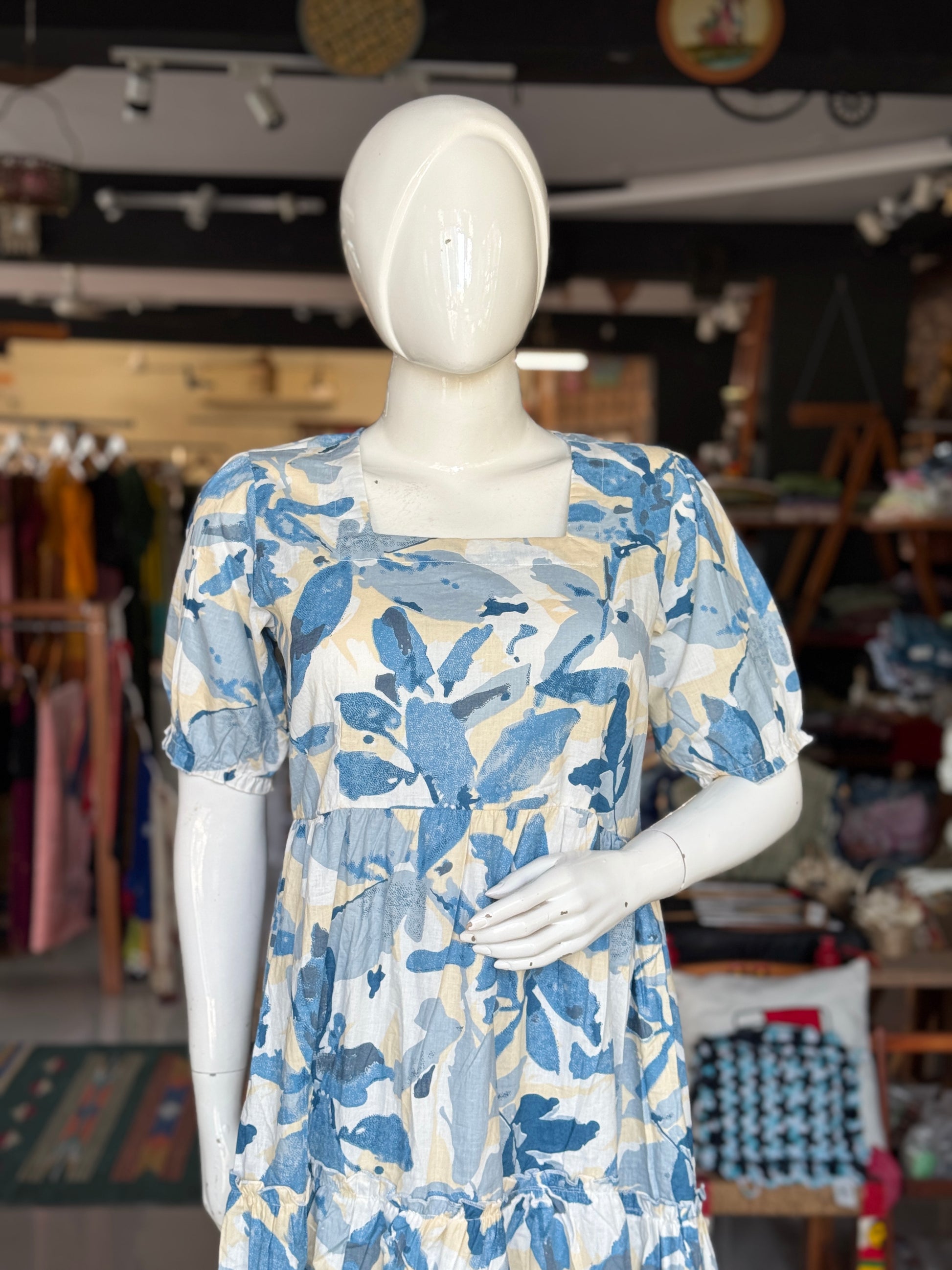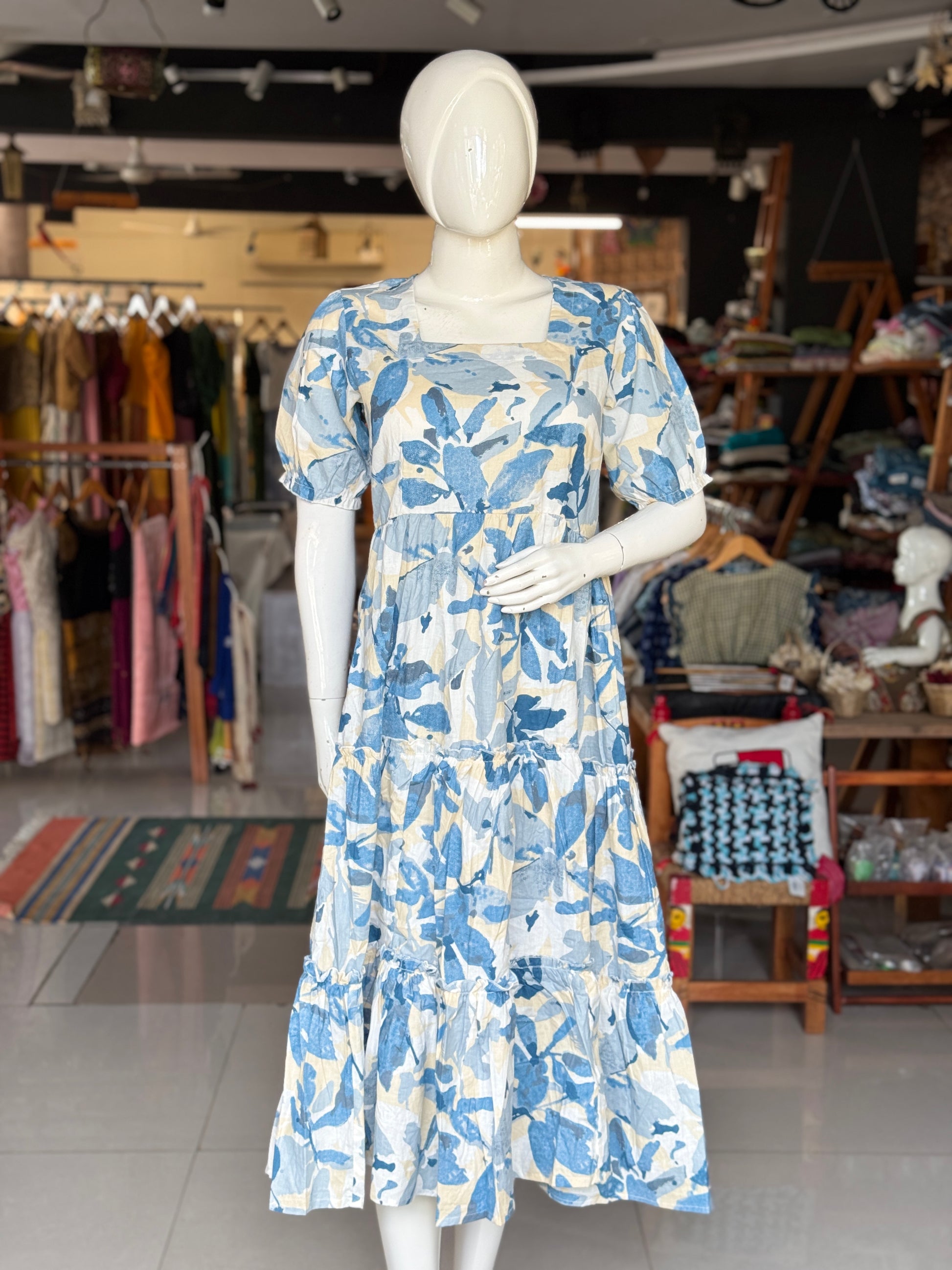 Printed tiered square neck cotton dress with elastic sleeves