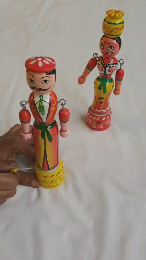 Pull out dancing dolls couple - Colourful handmade wooden hand painted set of male and female rotating doll