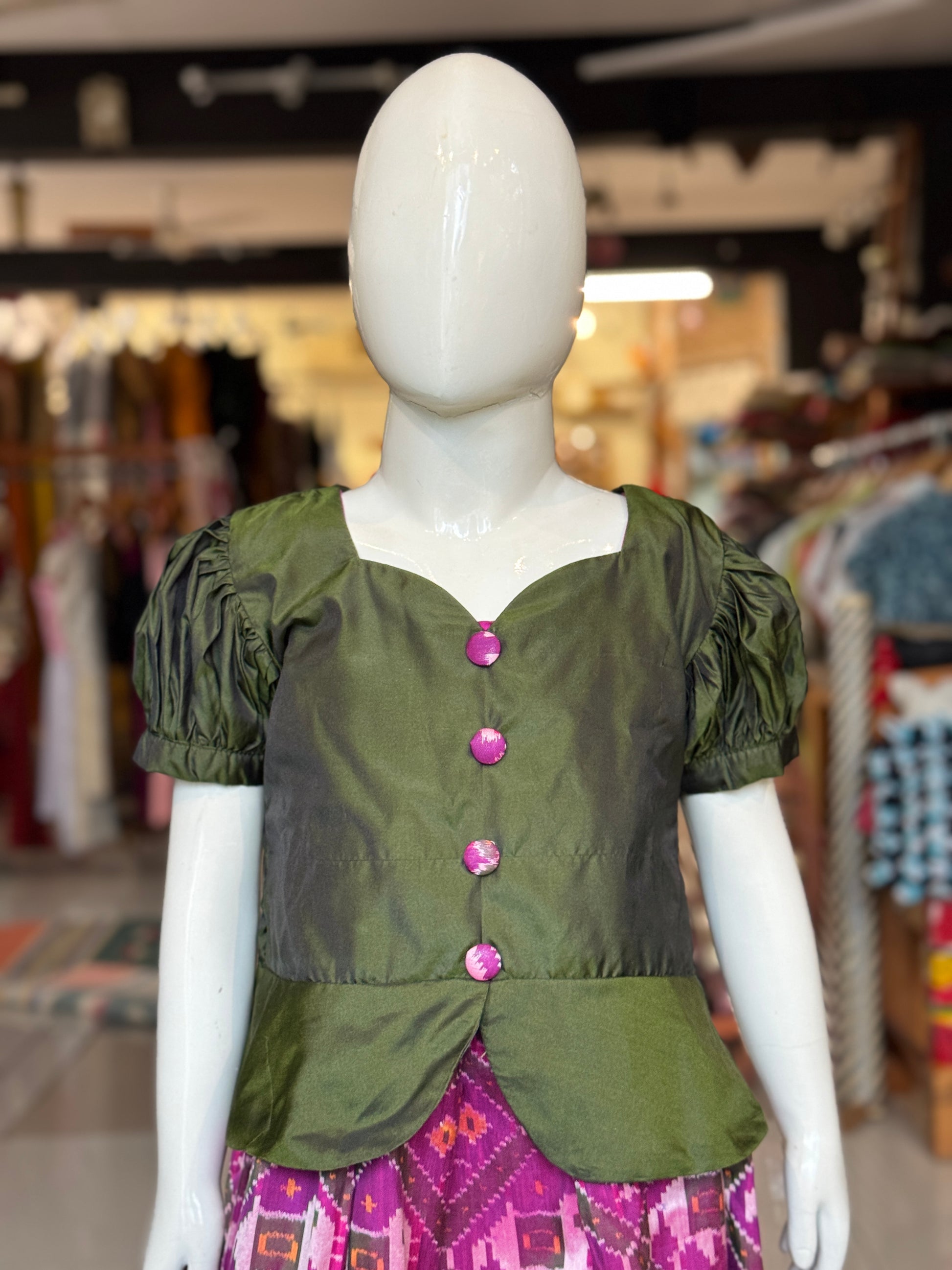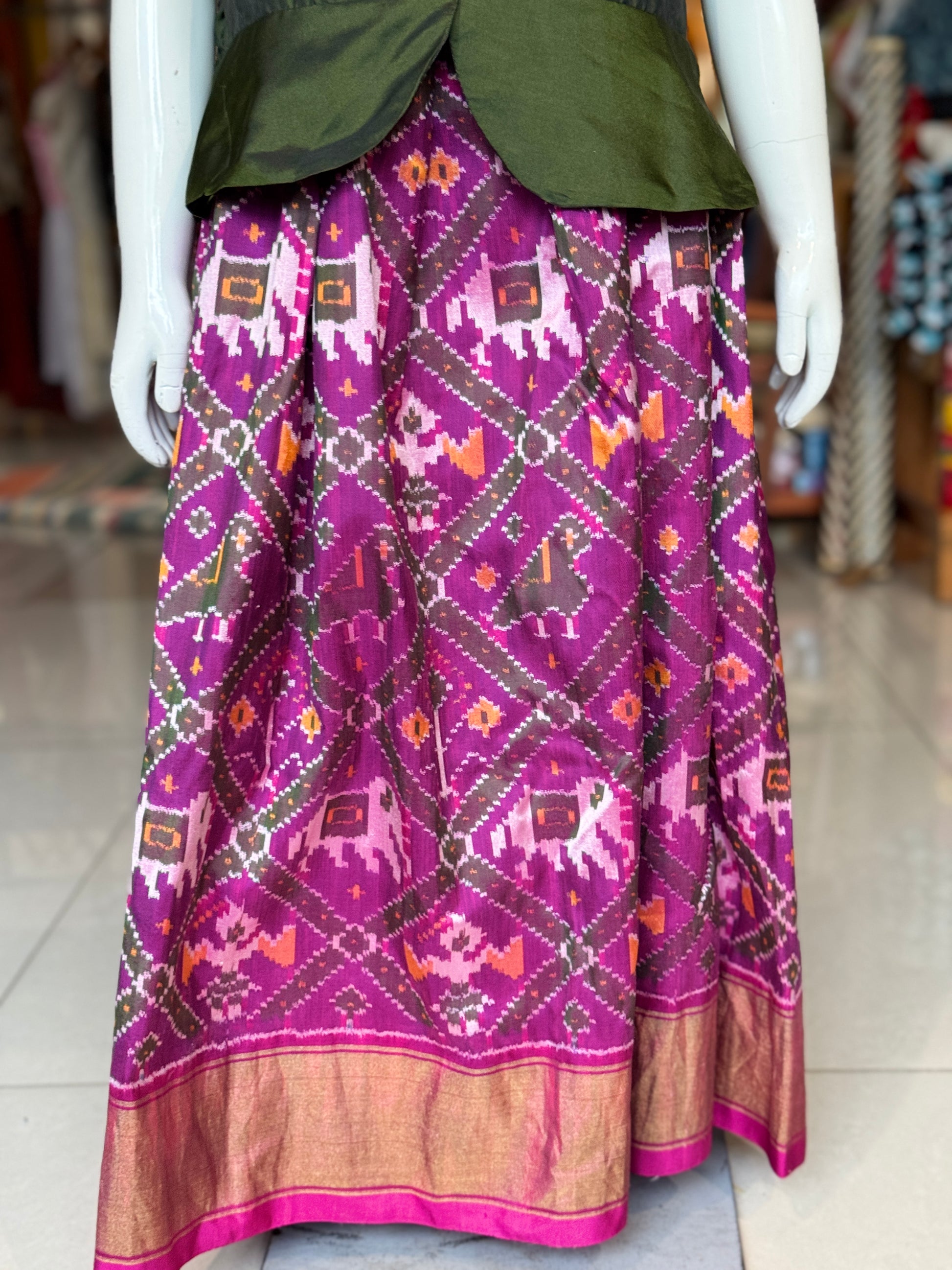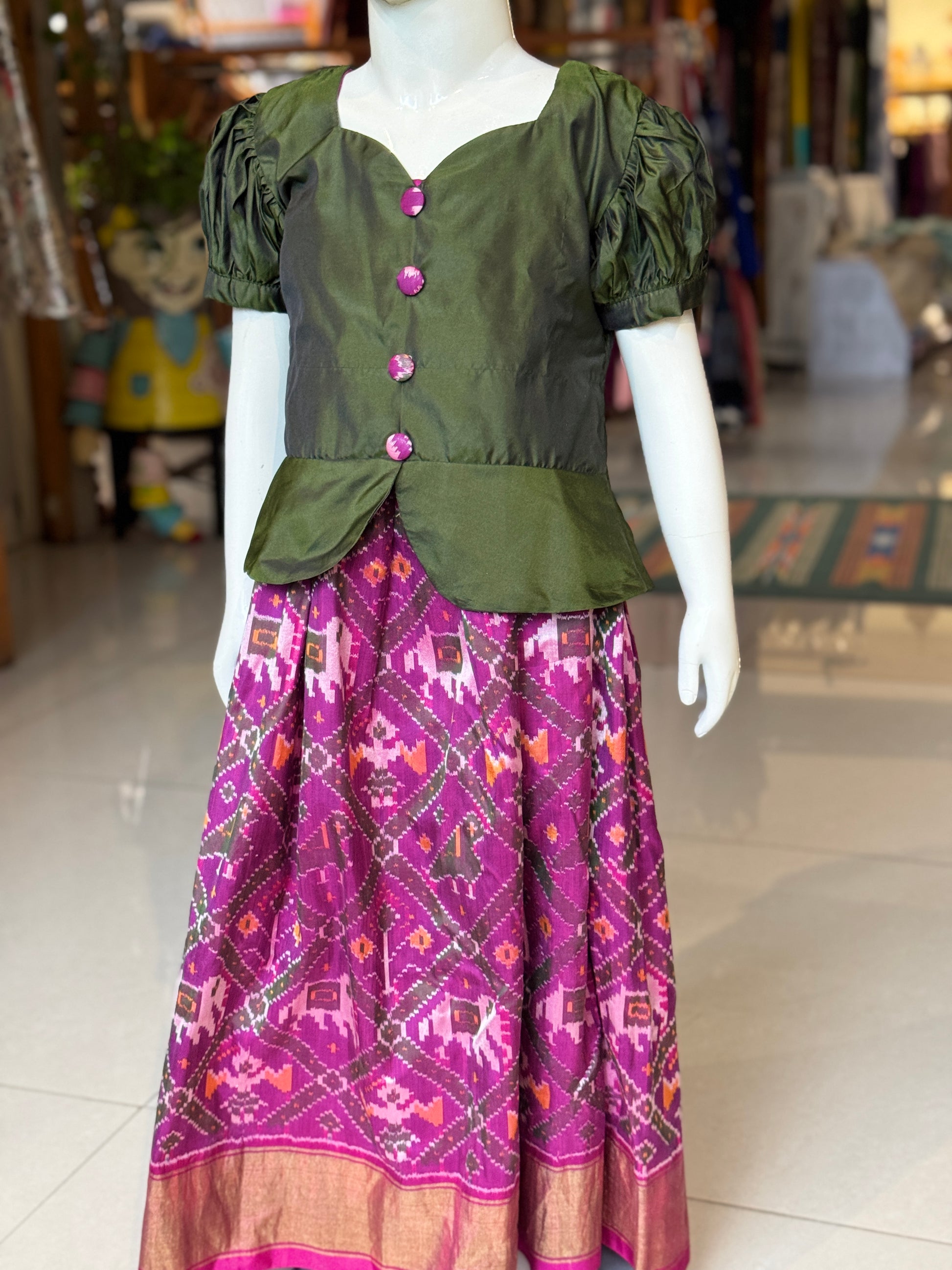Purple handwoven ikat pure silk lehenga (pattu langa) with green puff sleeves peplum top / blouse set
