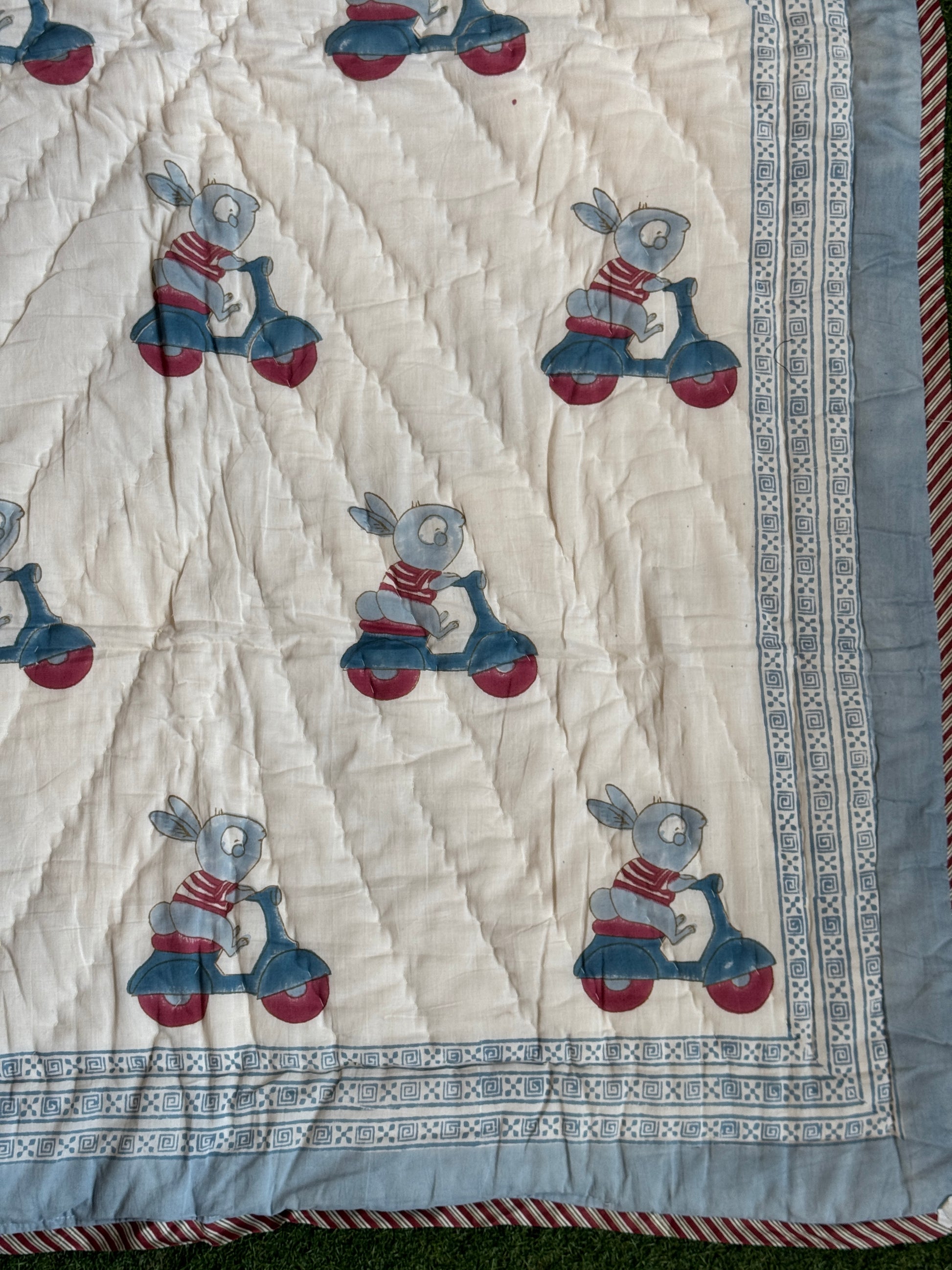Rabbit on a scooter cute hand block printed reversible cotton quilts / play mats for children