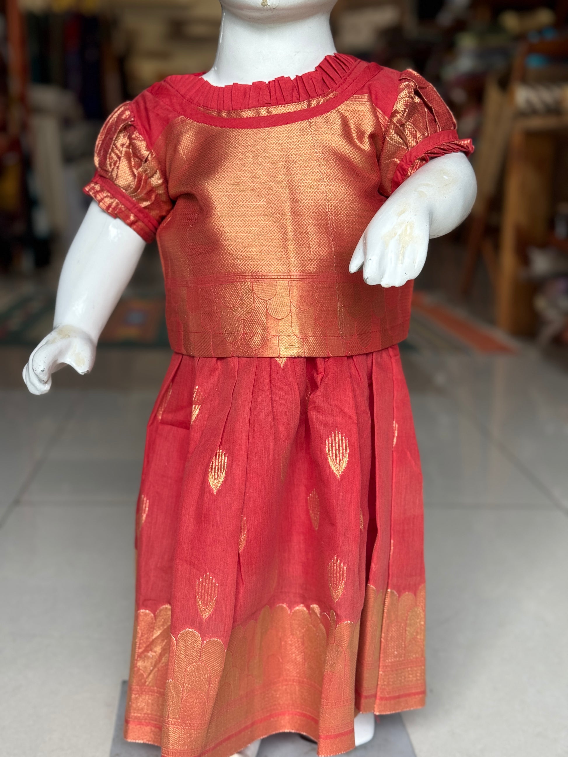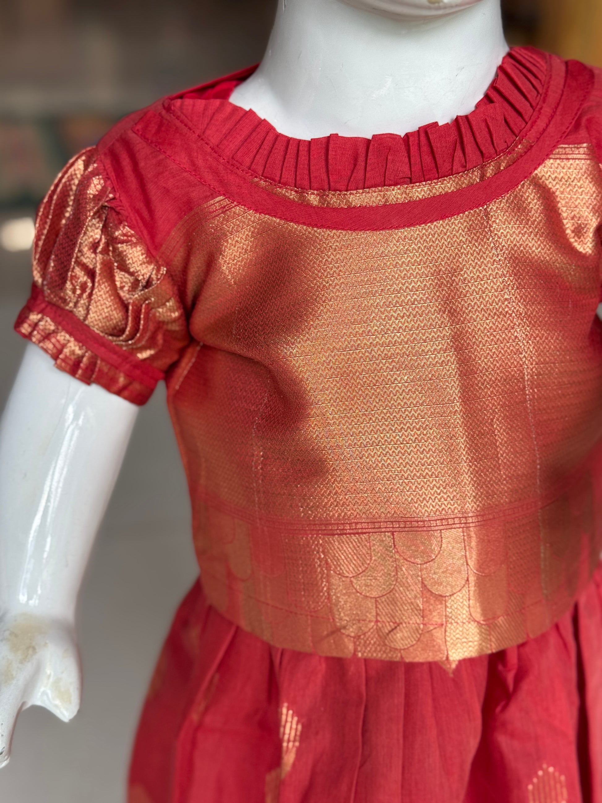 Red Banarasi cotton lehenga (langa jacket) with frill neckline blouse set