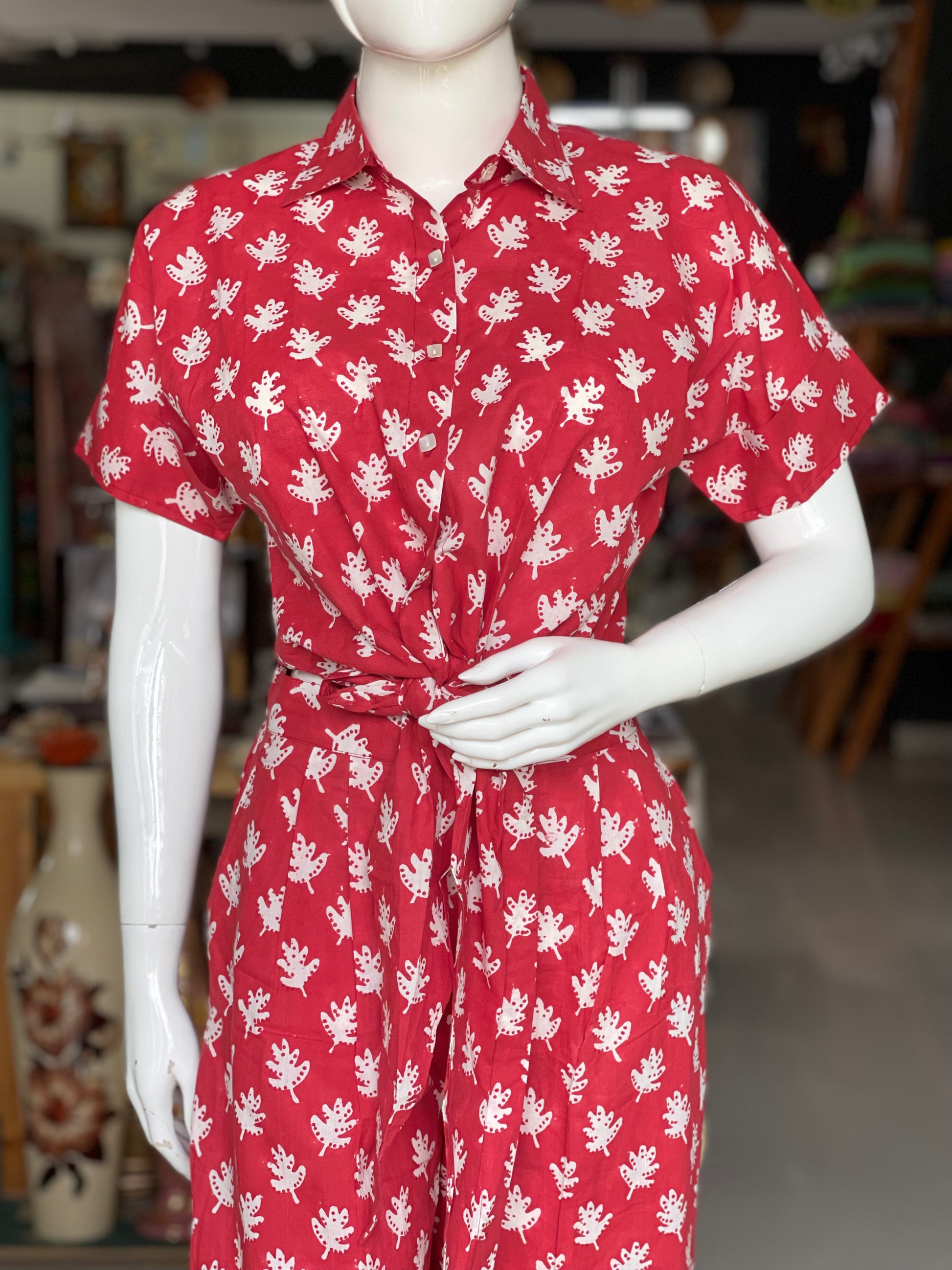Red hand block printed collared cotton top and pants coord set