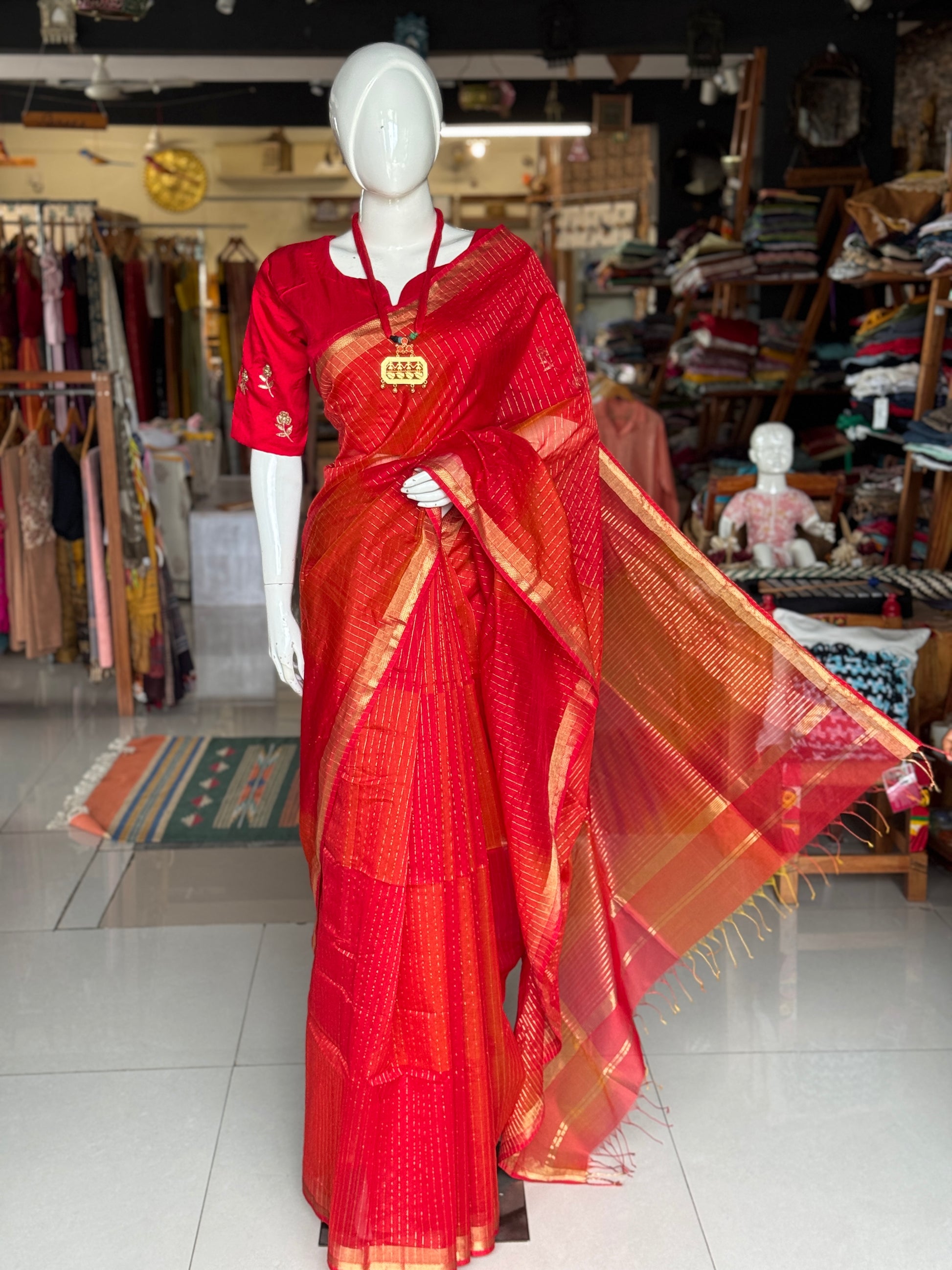 Red n orange all over stripes silk cotton Maheshwari handloom saree