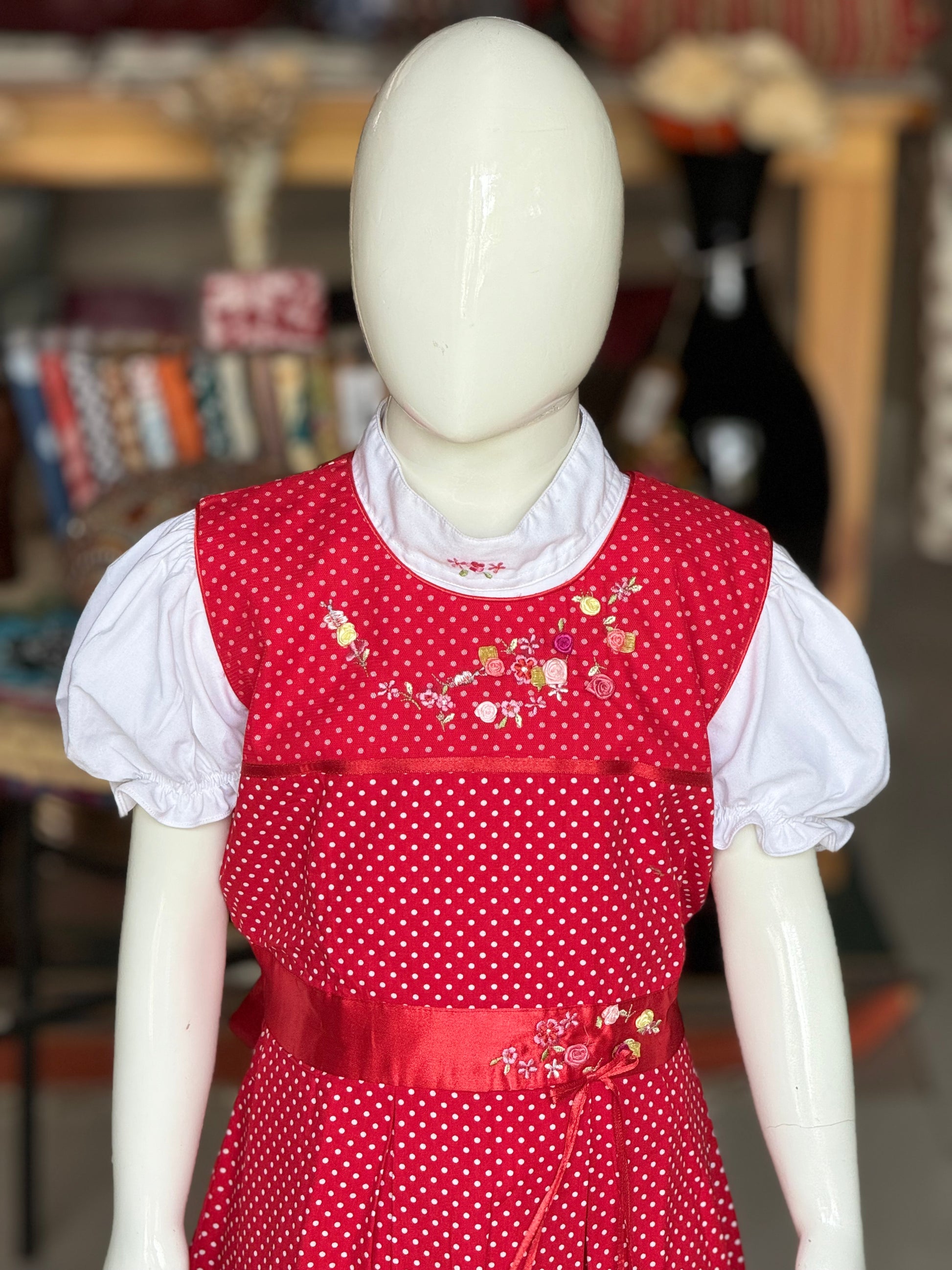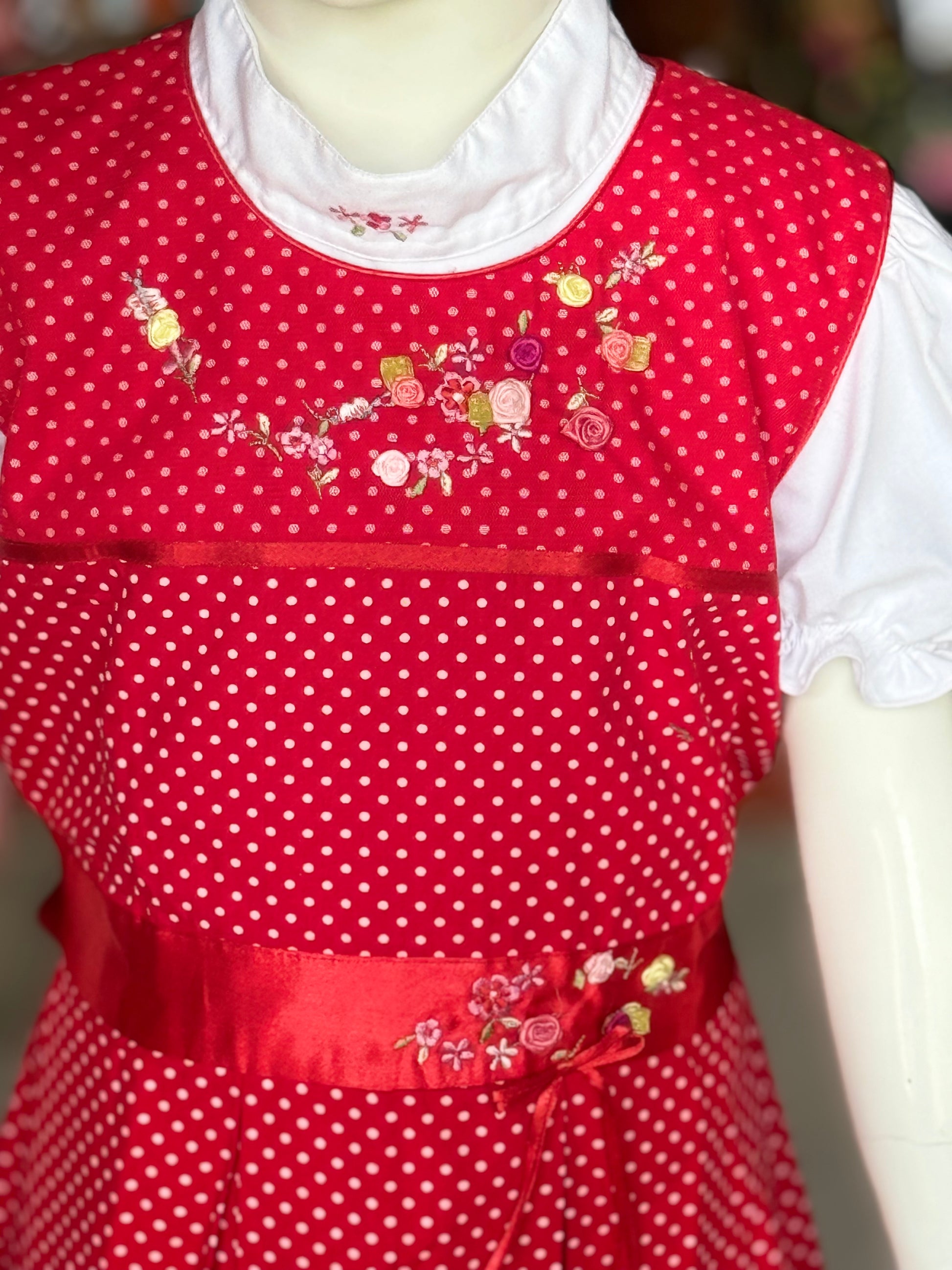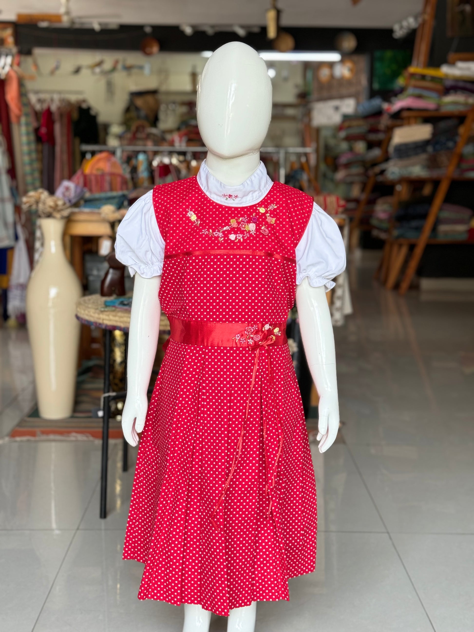 Red polka dots sleeveless cotton embroidered frock with embroidered white puff sleeves inner top for little girls