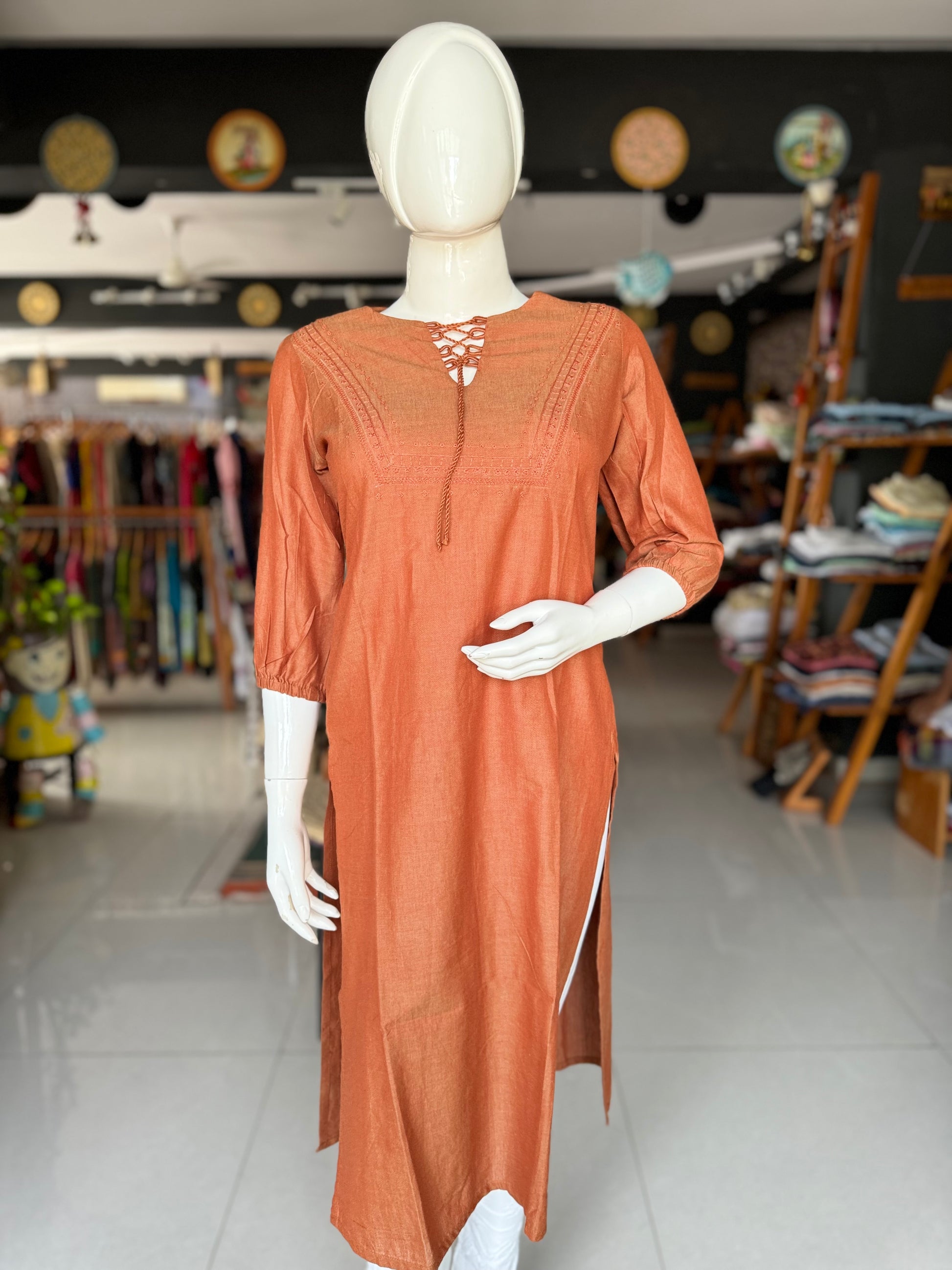 Rust brown cotton kurti with hand embroidery on yoke and tie up dori for neck placket