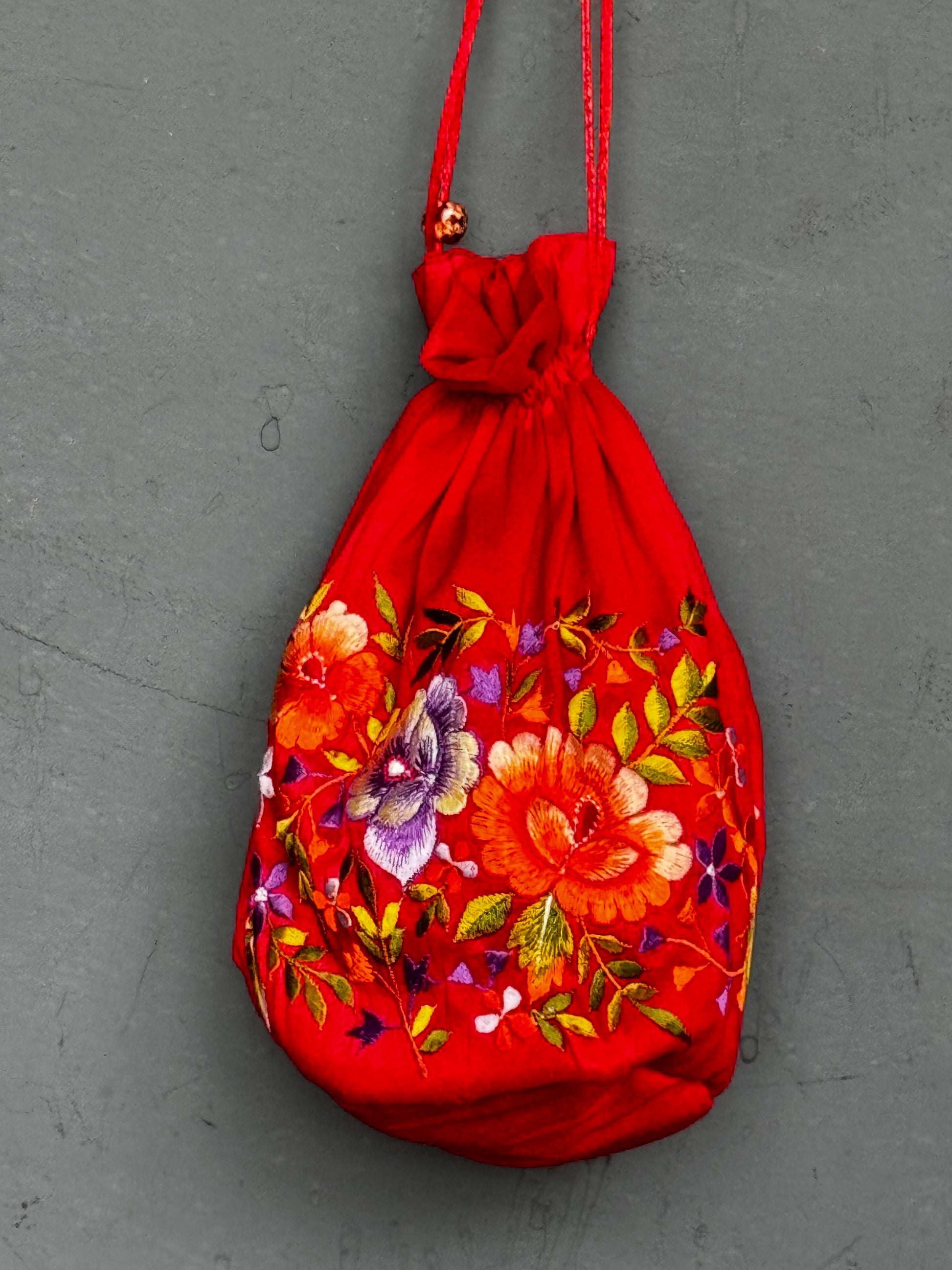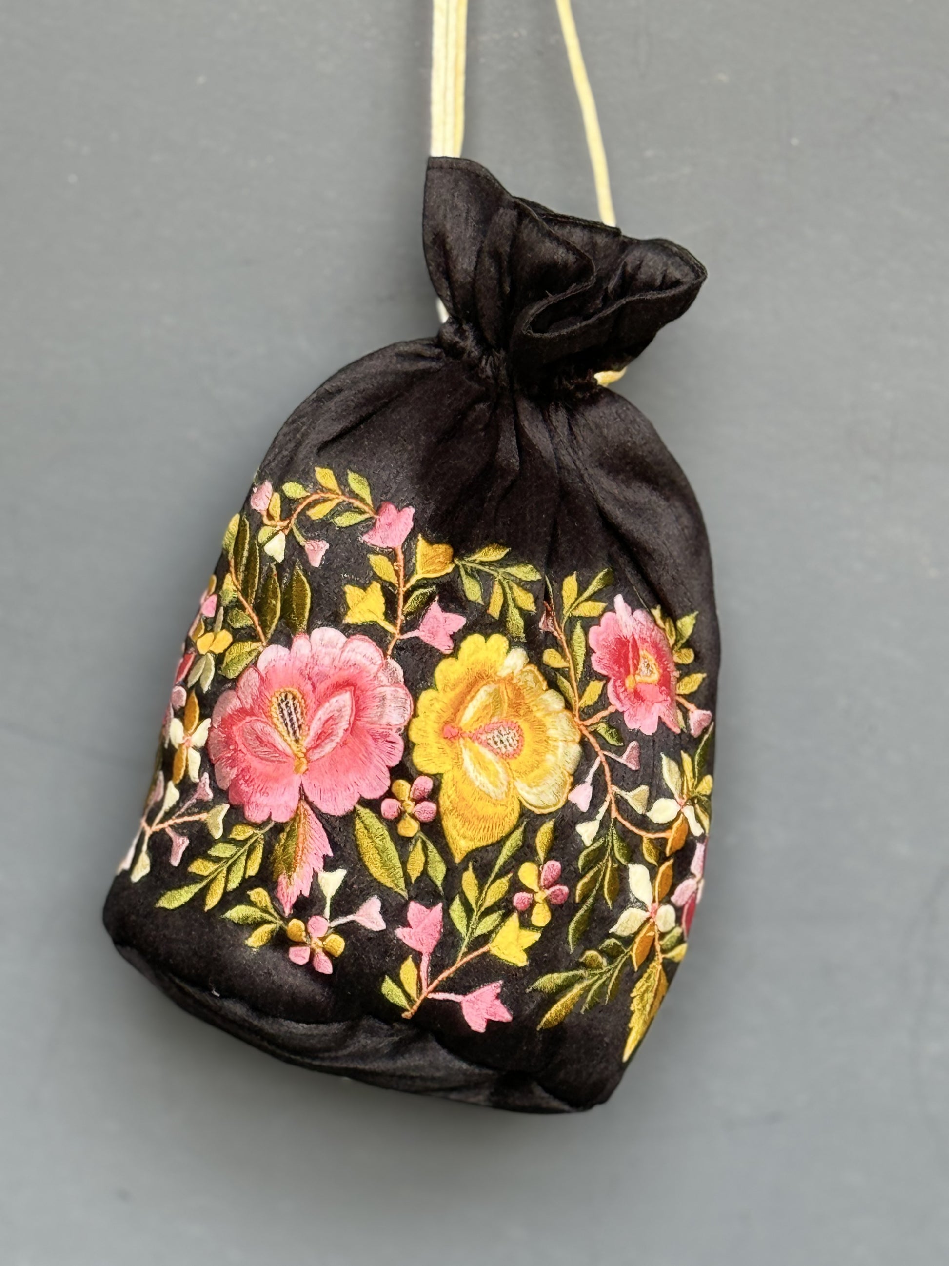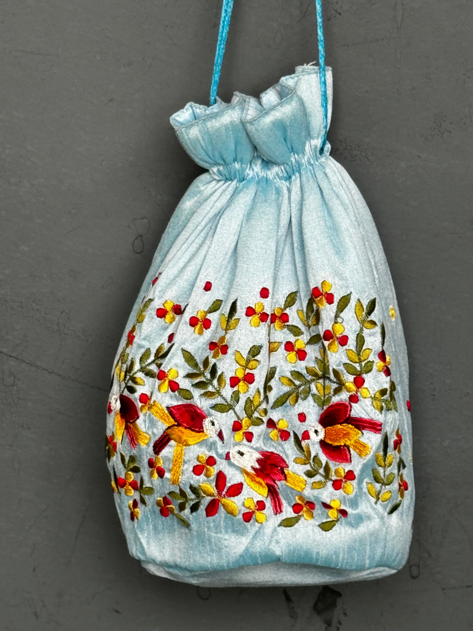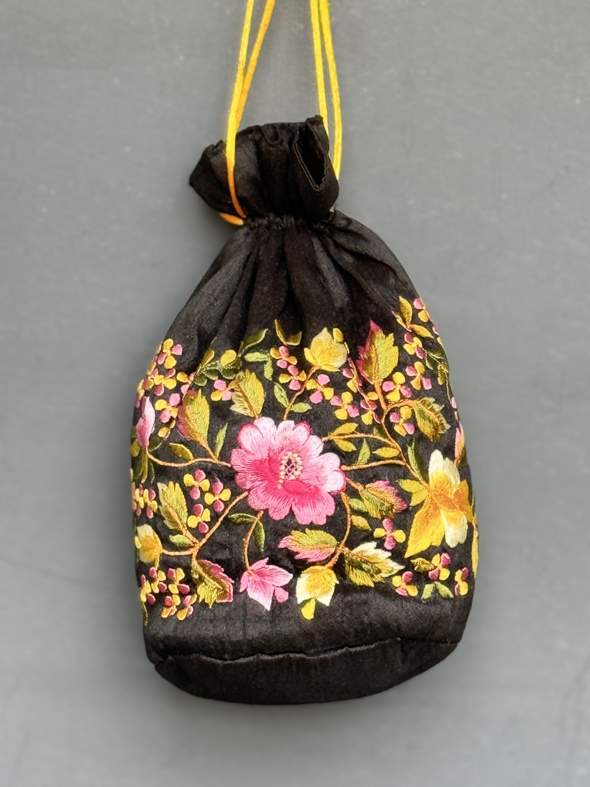 Round base potli 11 x 9 inches art silk with machine embroidery