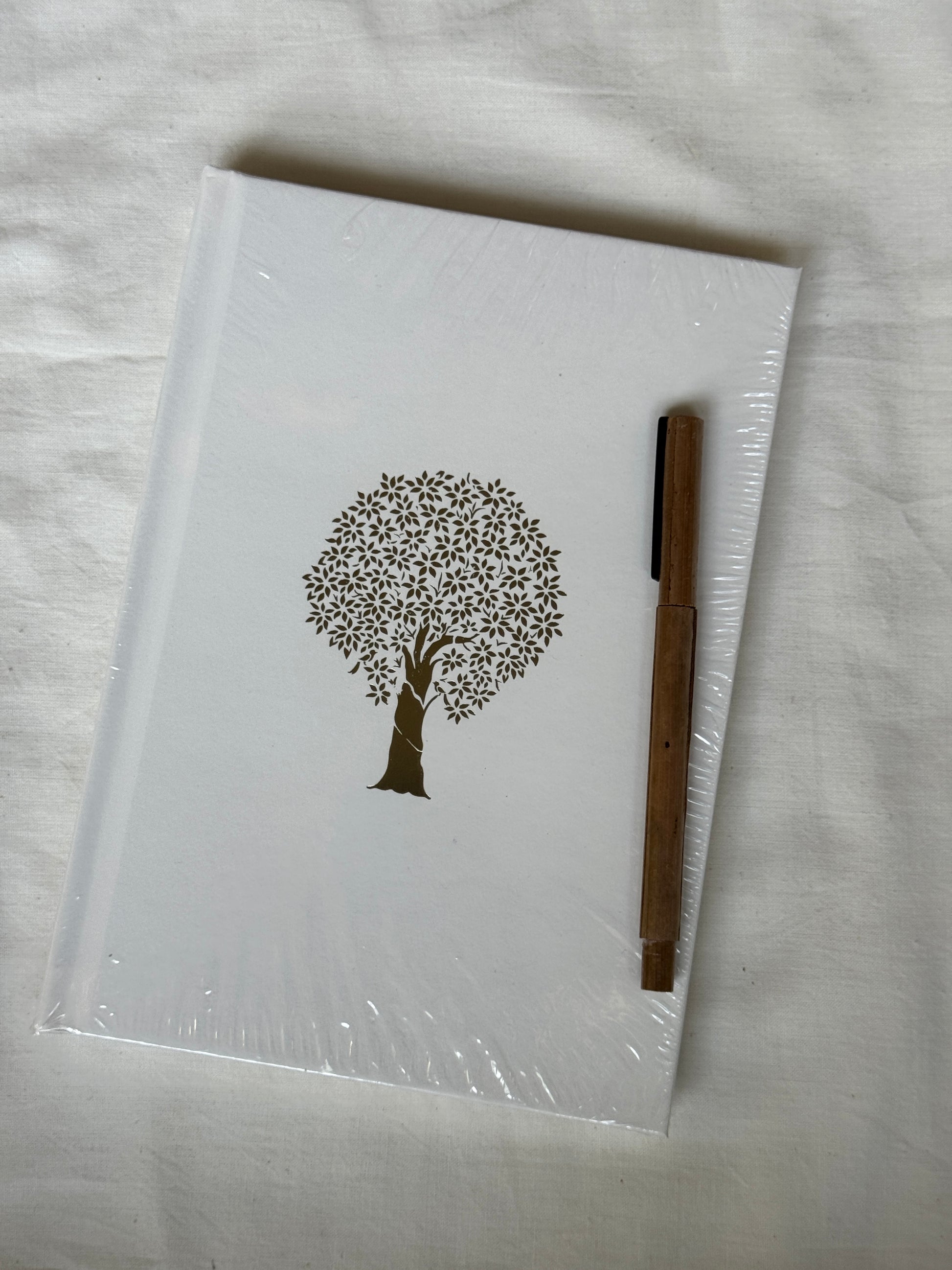 Ruled paper notebook journal / diary with gold foiled cover and handwoven pouch