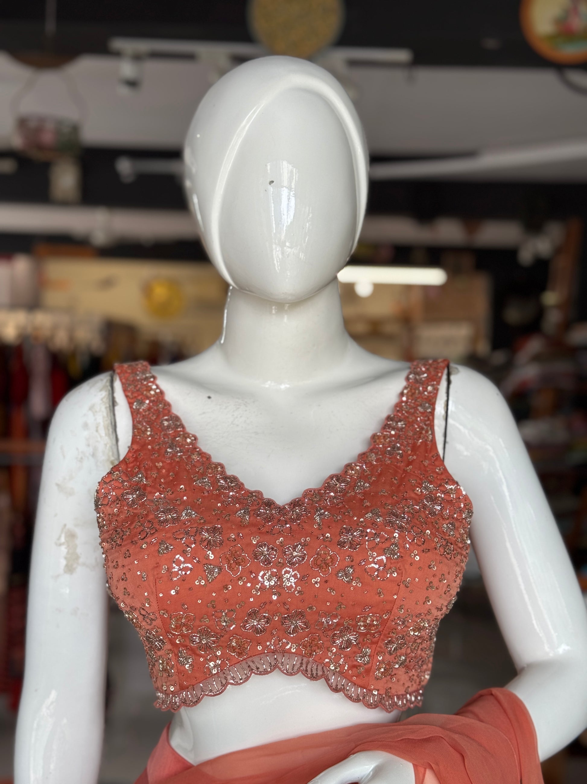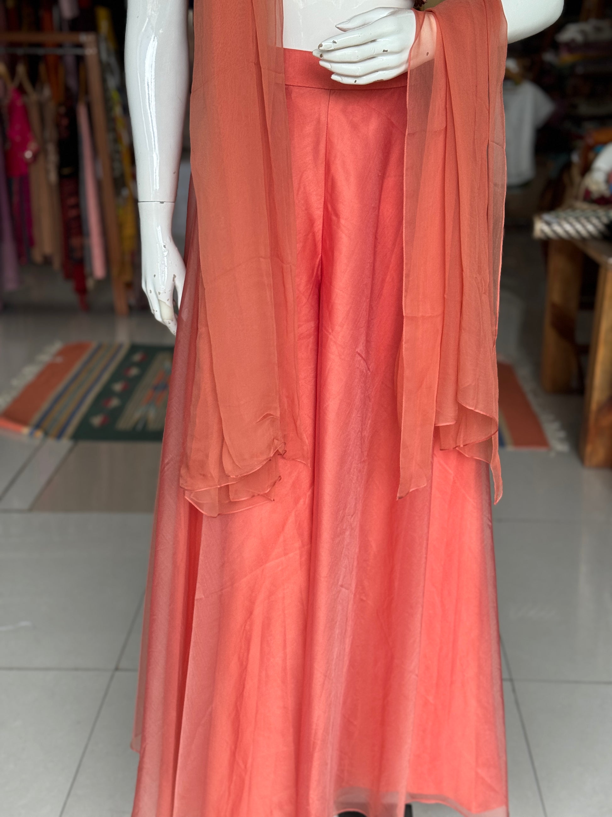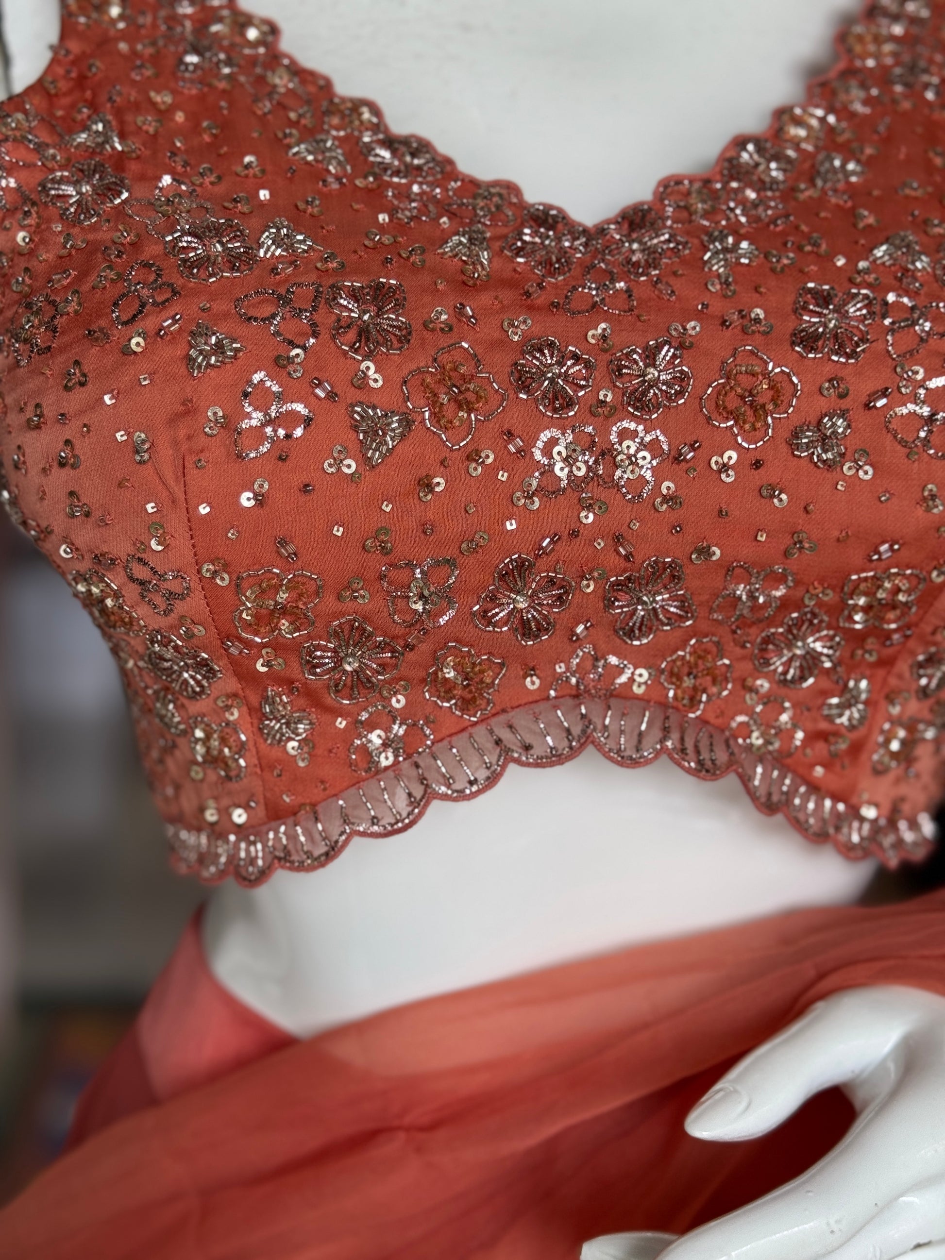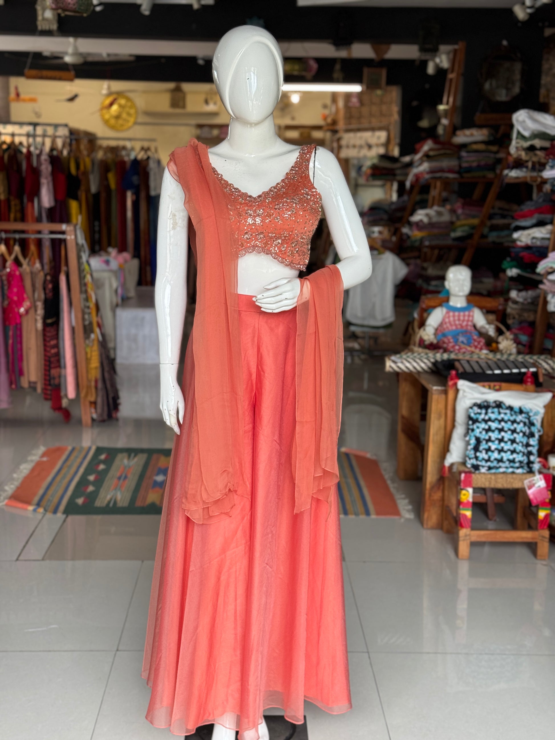 Rust orange hand embroidered georgette blouse top, organza plazo and georgette dupatta - 3 piece set