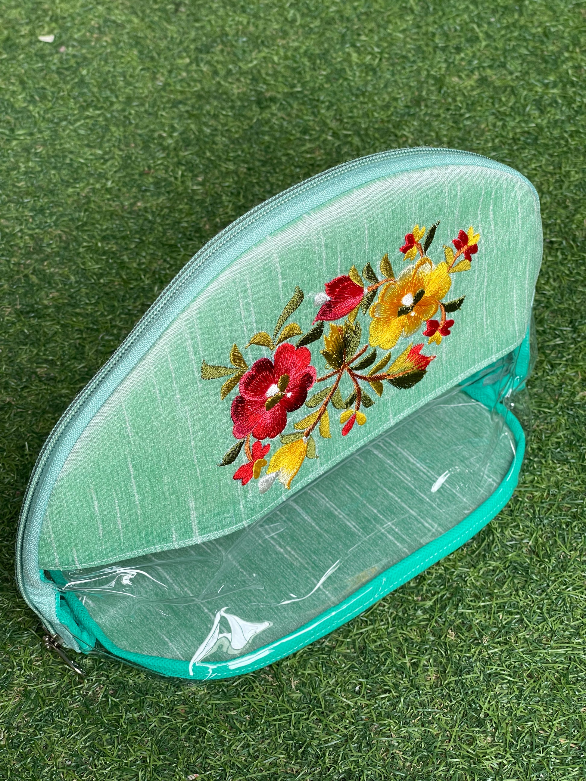 Sea green embroidered transparent toiletries / gifting pouch with zipper closure