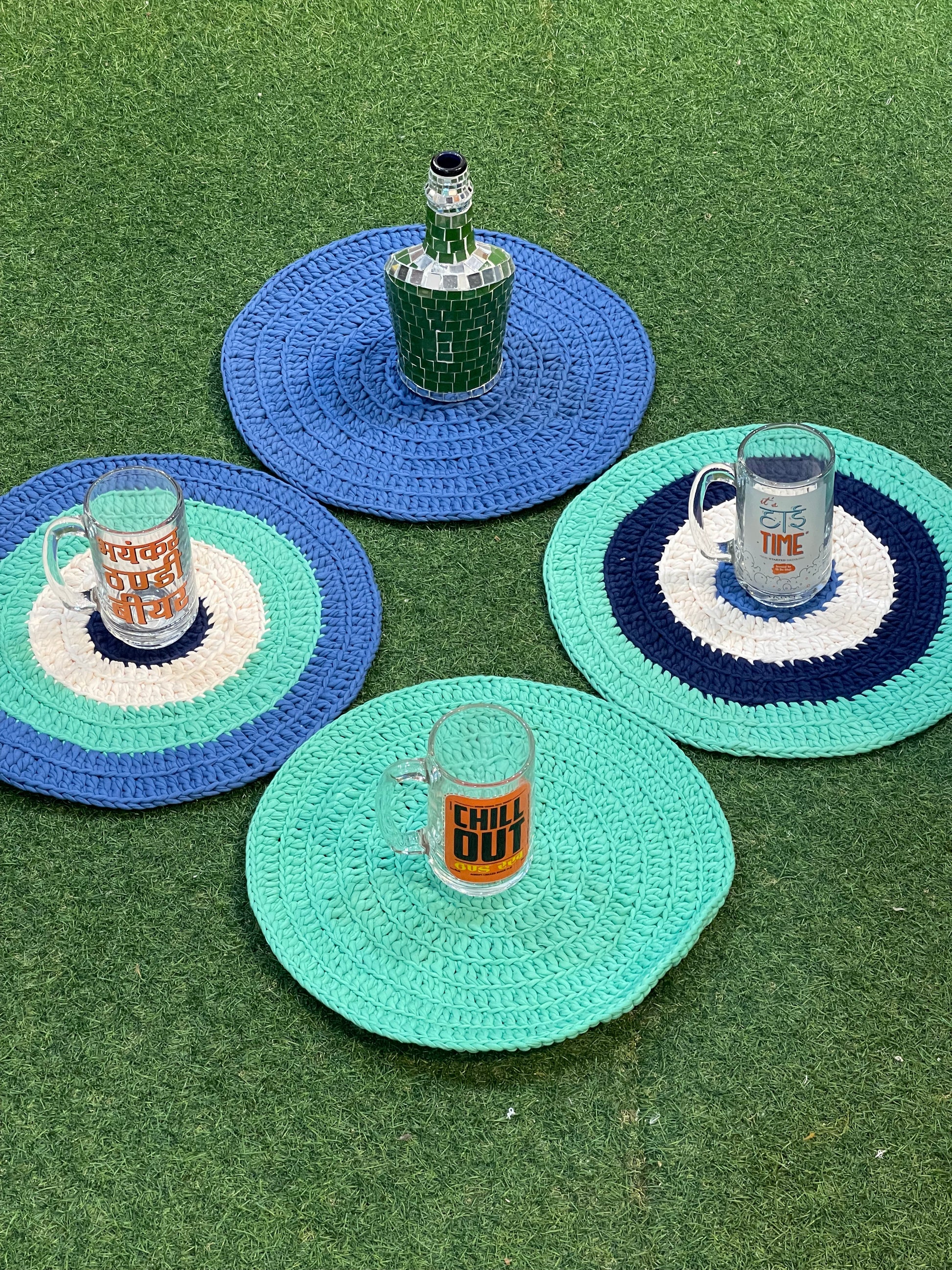 Set of 4 Green, blue and white handwoven upcycled knitted cotton place mats