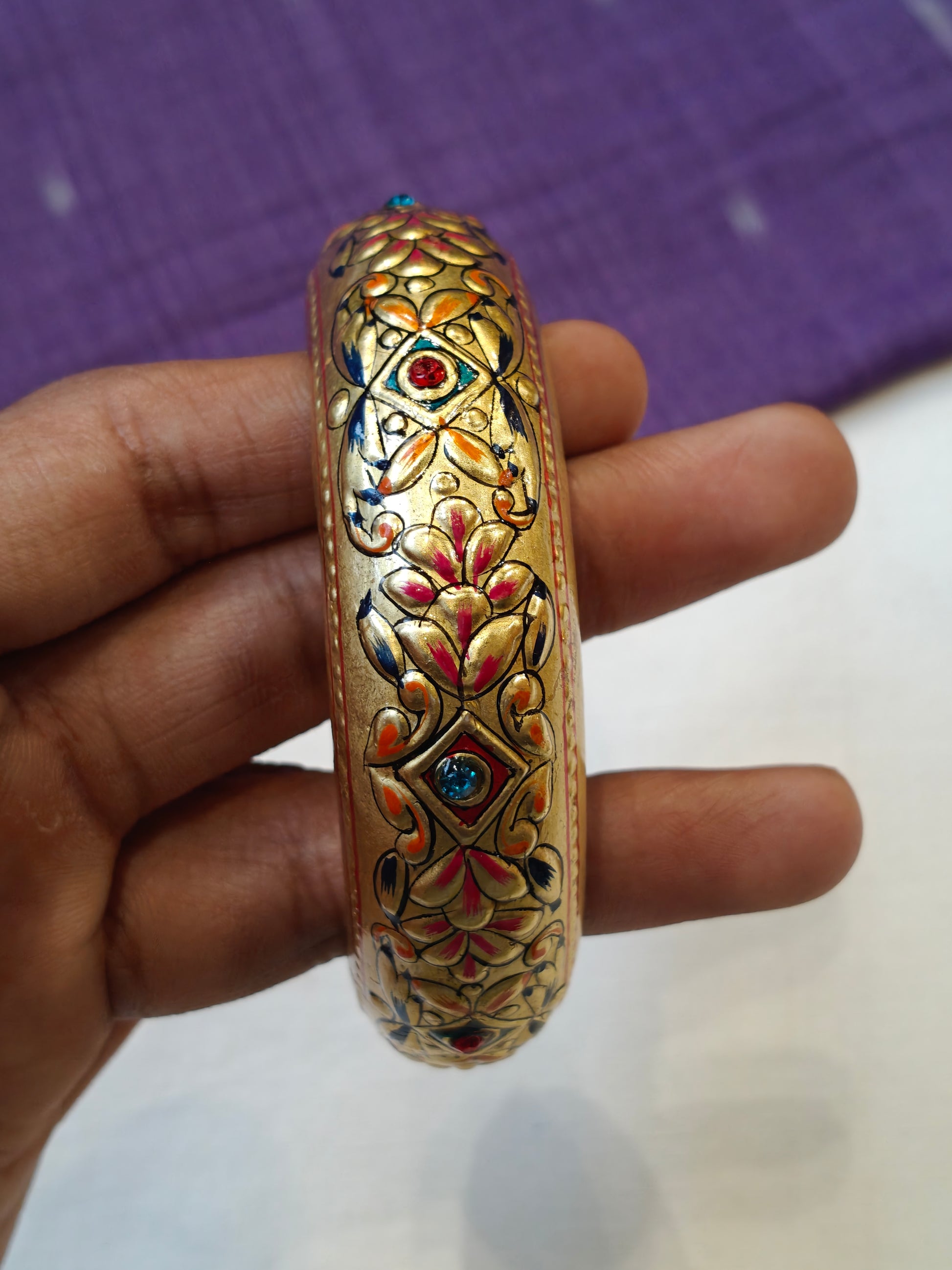Single gold embossed wide bangle with blue and red stones
