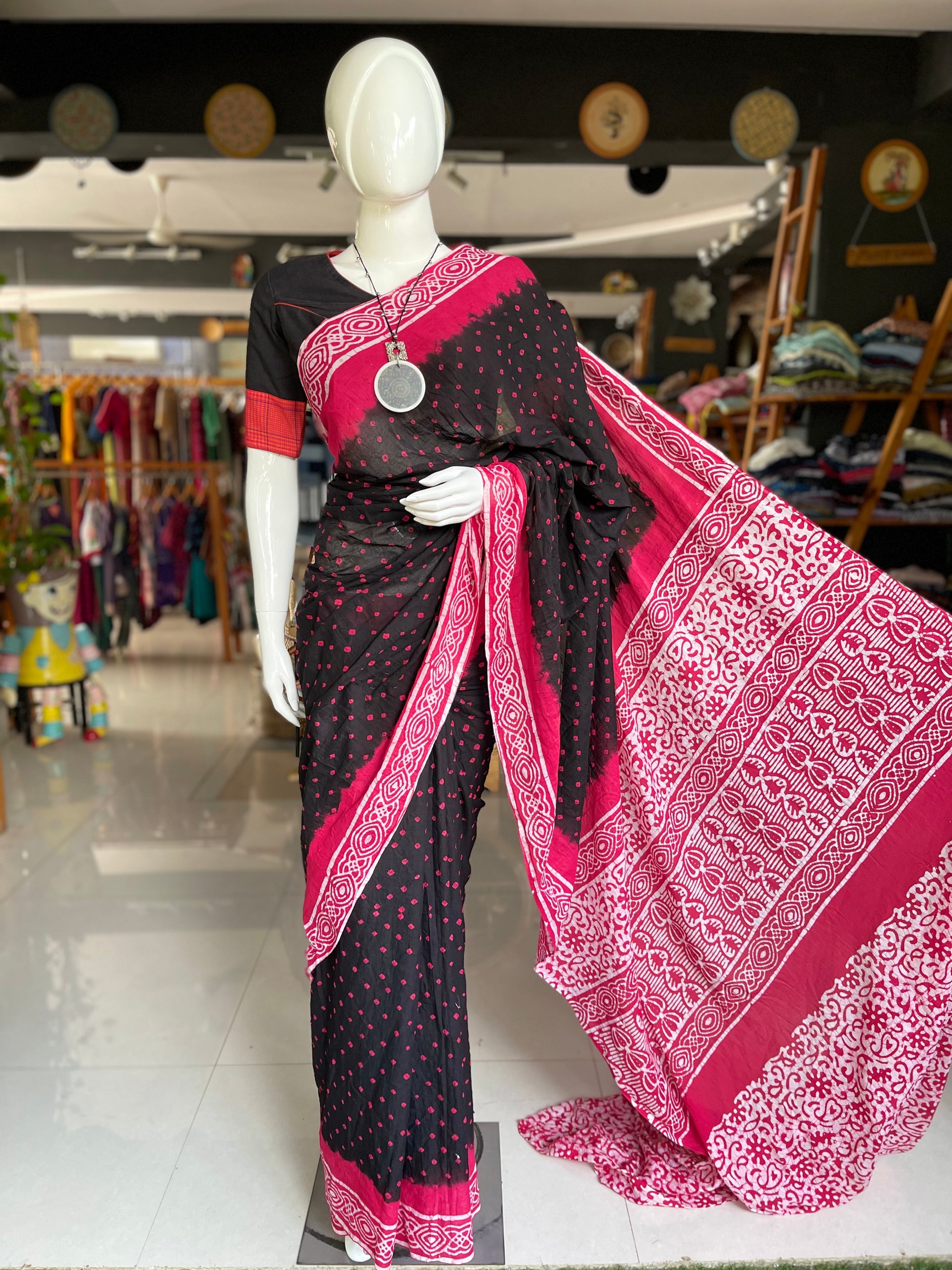 Two art forms of batik and bandini combined to make one stunning saree.