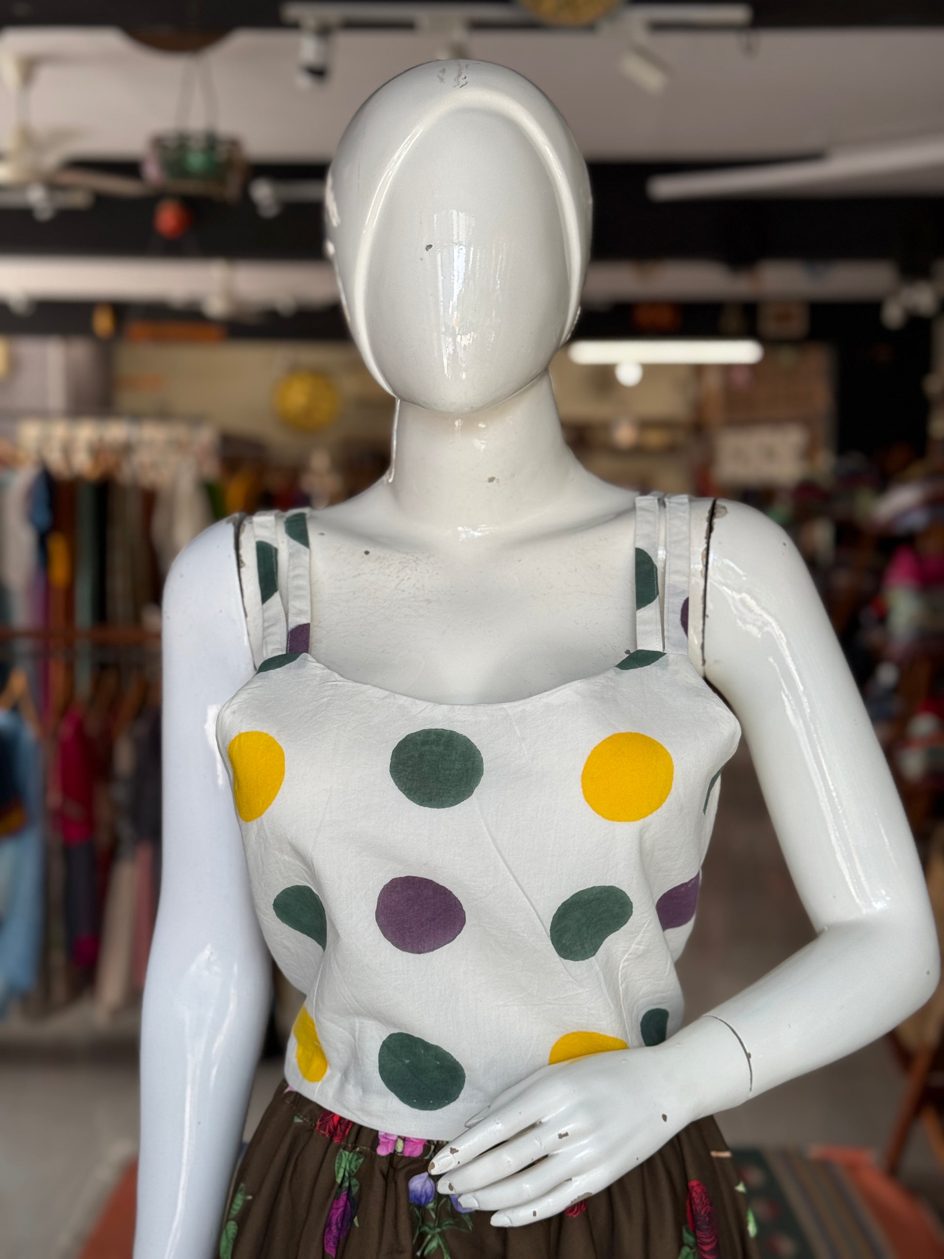Strappy crop top with colorful circles on white base - cotton hand block printed