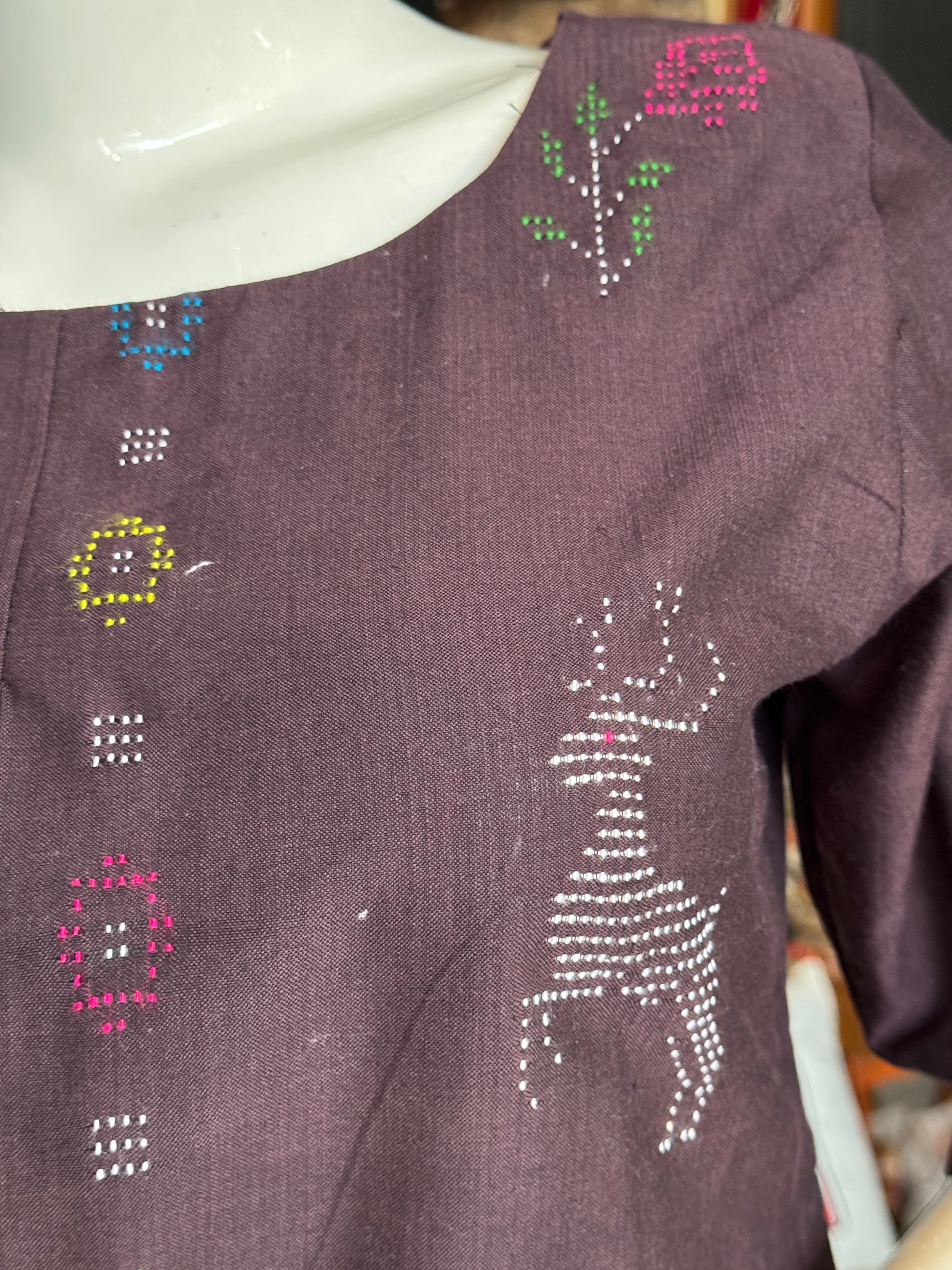 Tangaliya handloom brown cotton top with rose n deer motifs