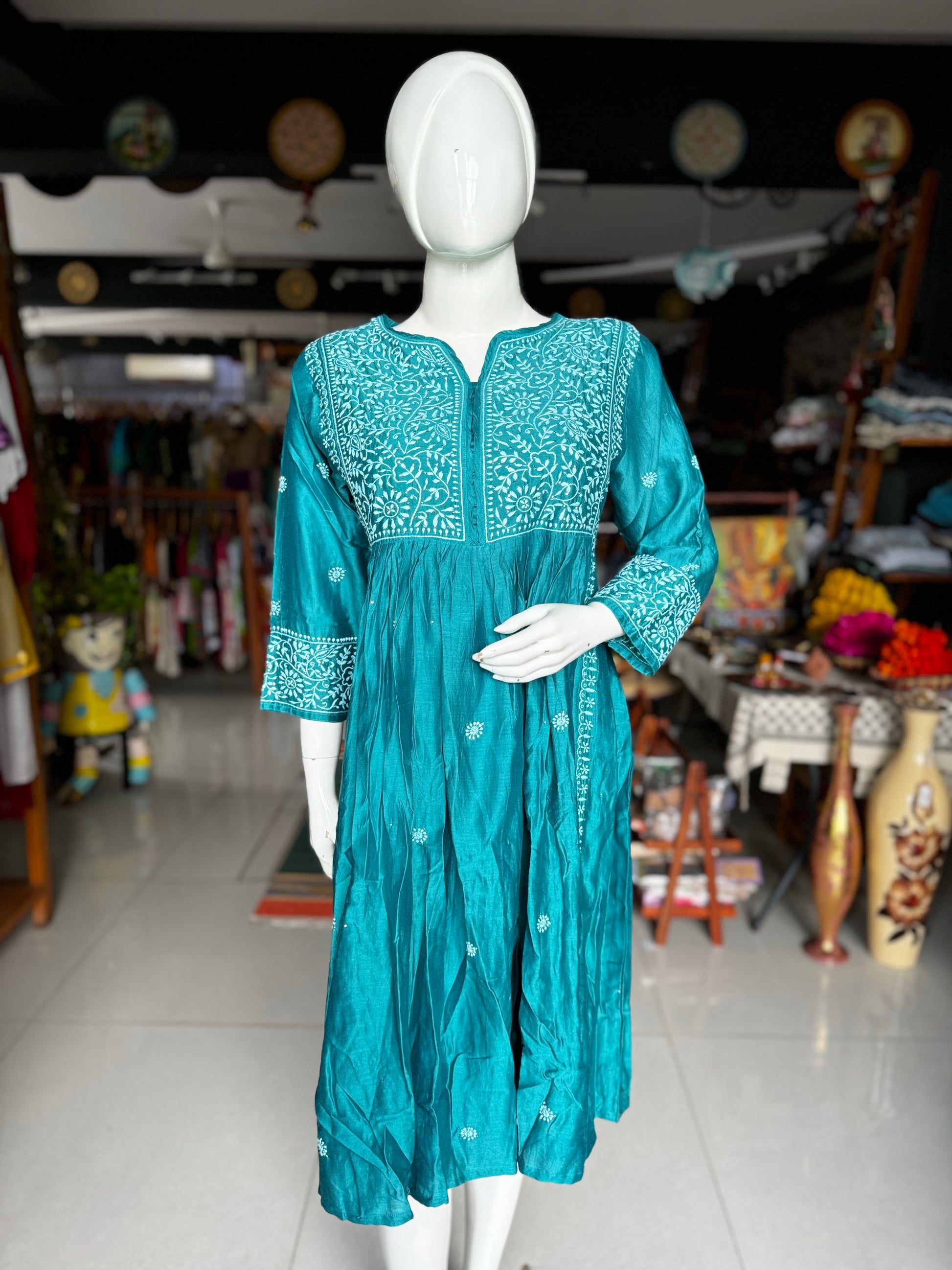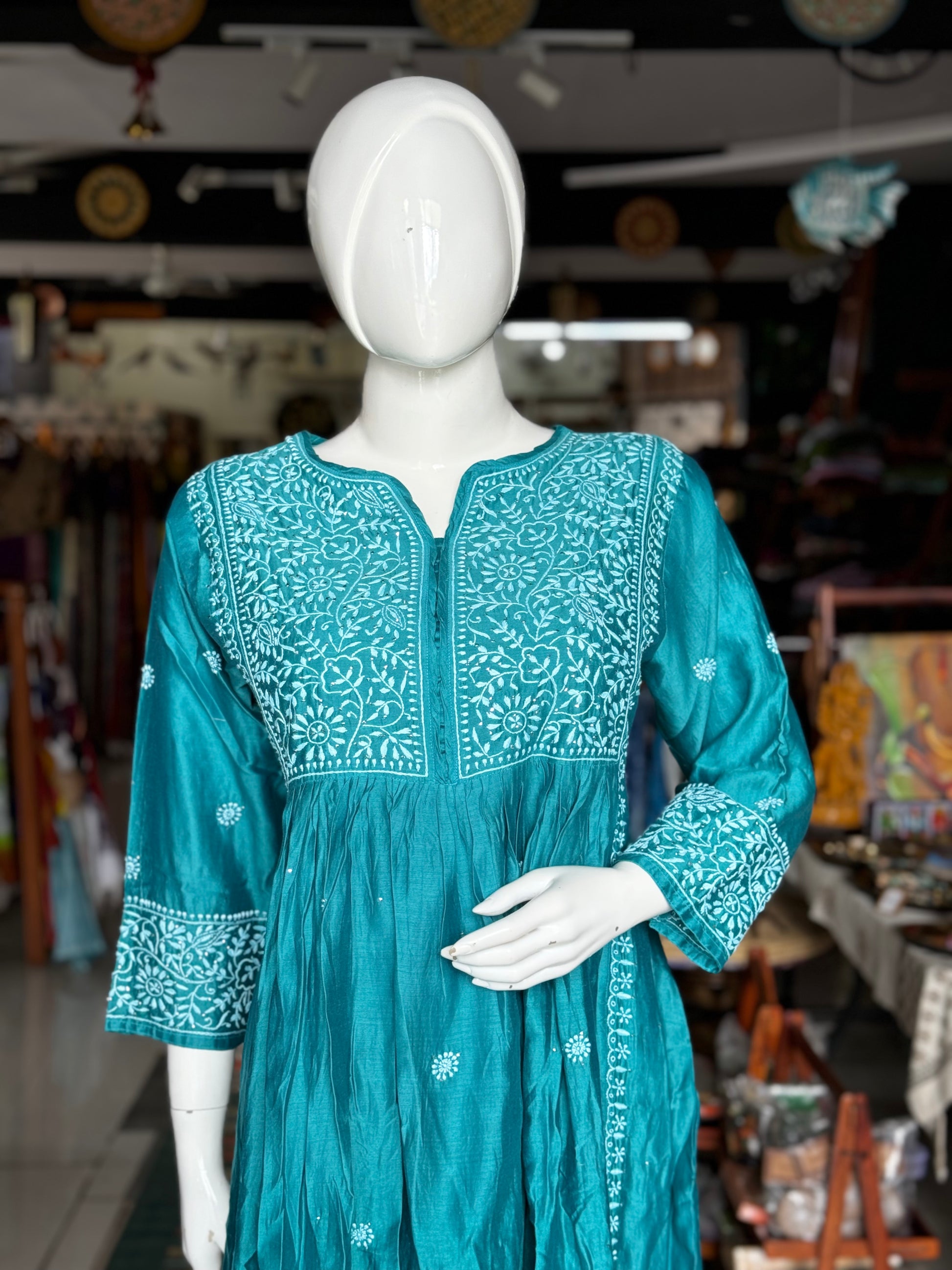 Teal green chikankari mukaish hand embroidered Chanderi kurta / dress