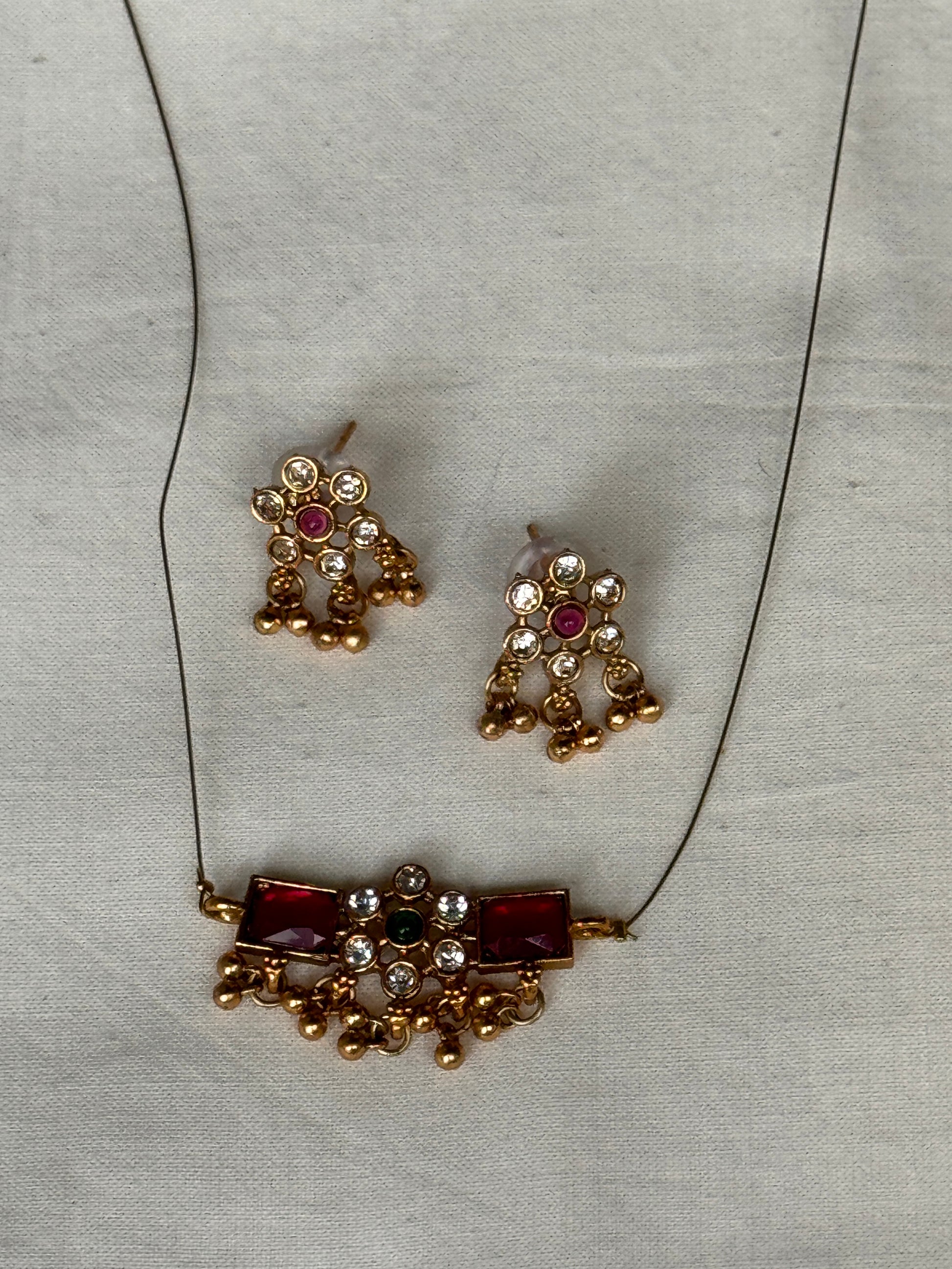 Thin wire with pendant - neckpiece earrings set - pink and white stones