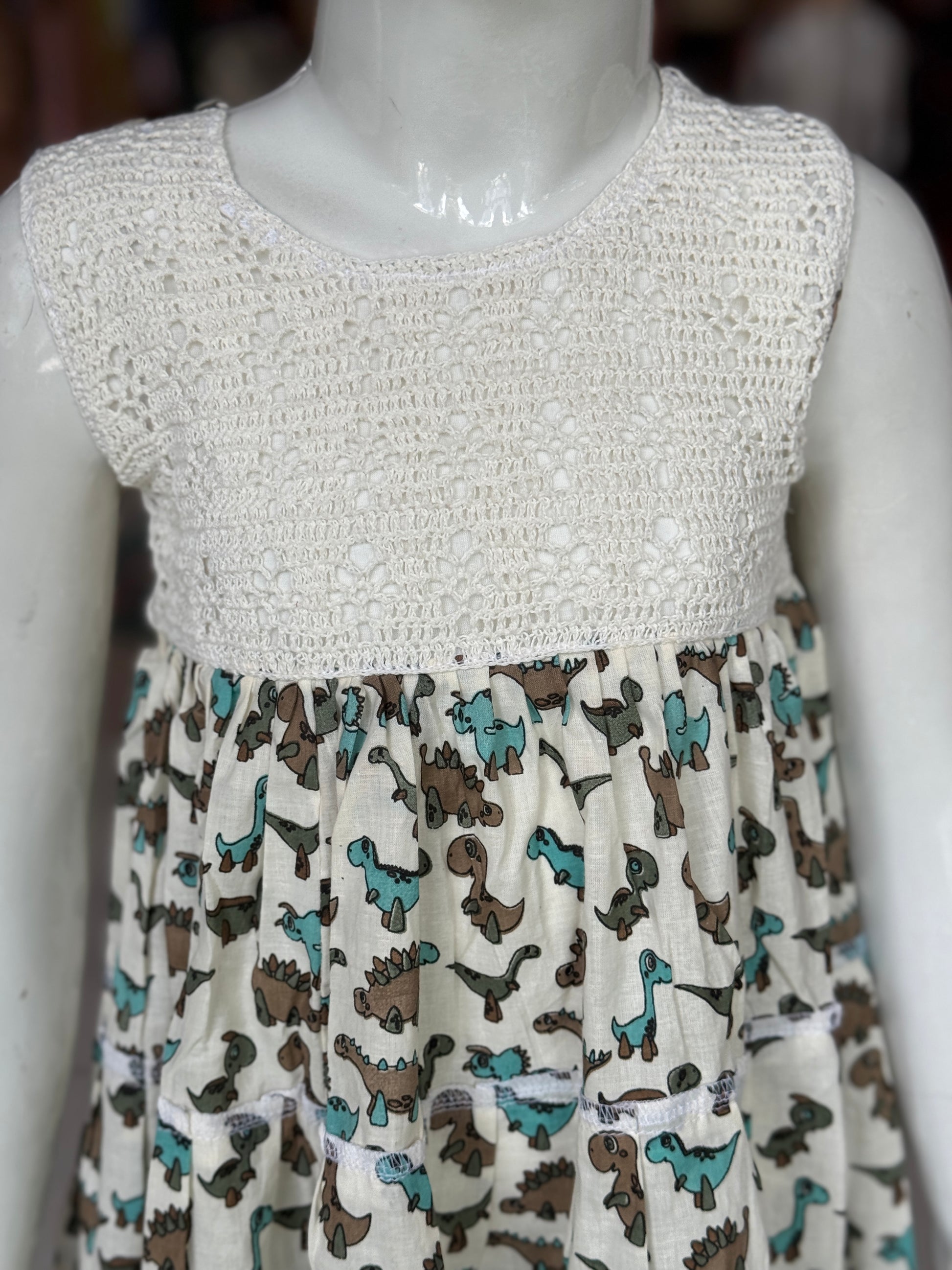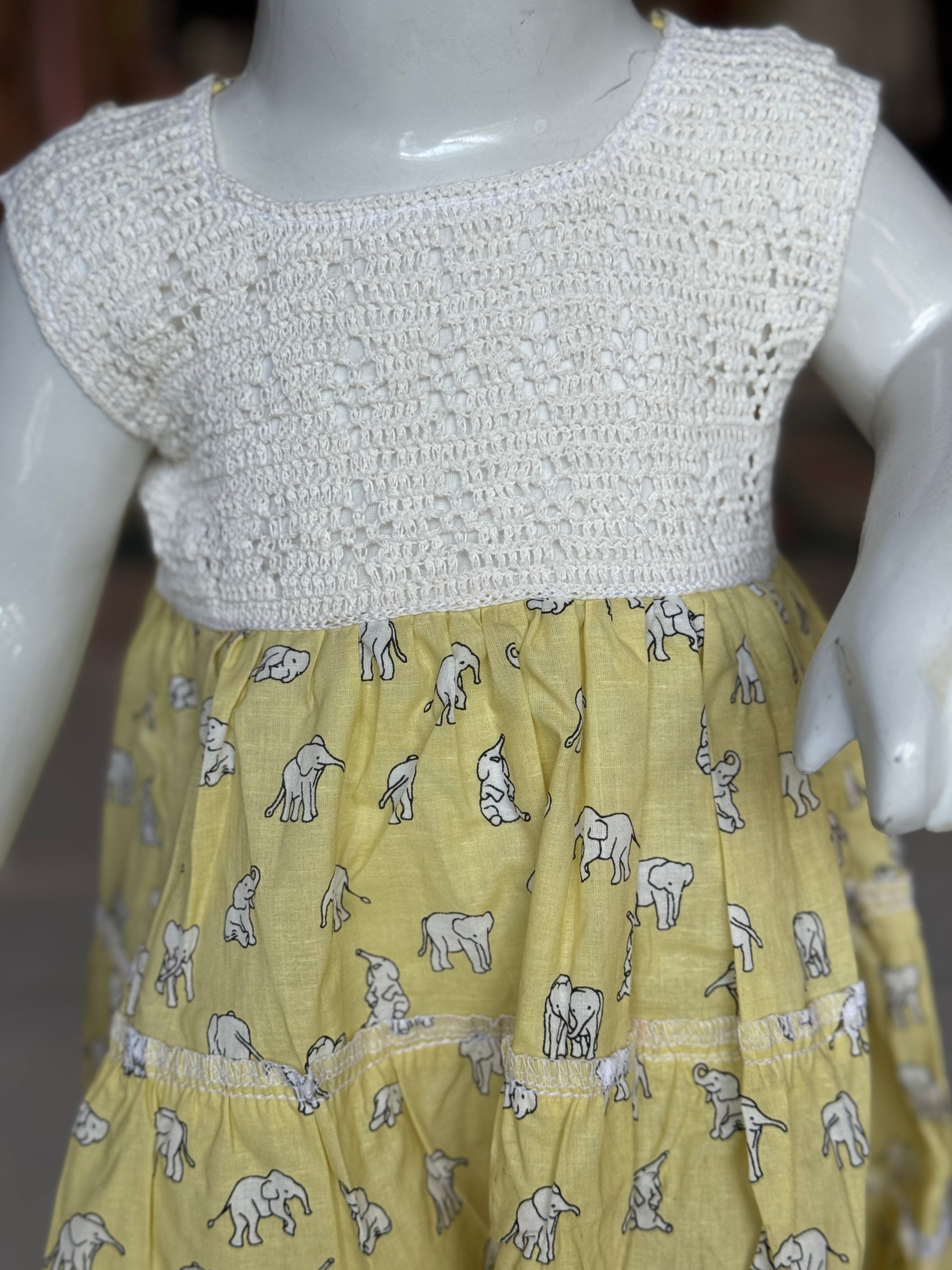 Tiered hand block printed cotton frock with crochet yoke for girls