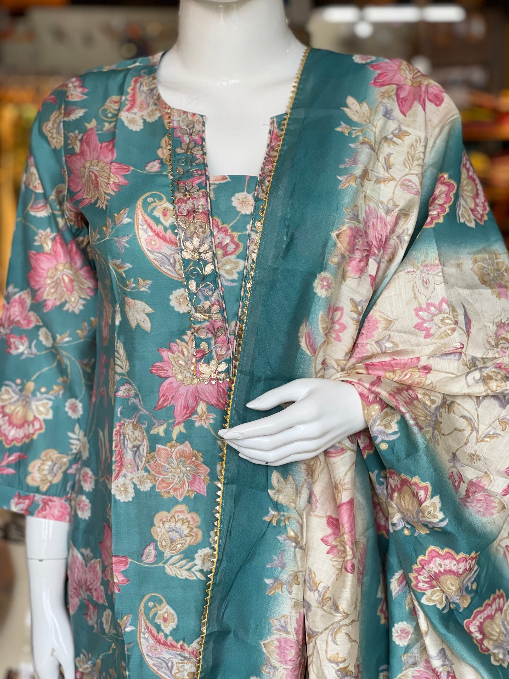 Turquoise floral modal suit set with matching straight pants and dupatta - 3 piece set