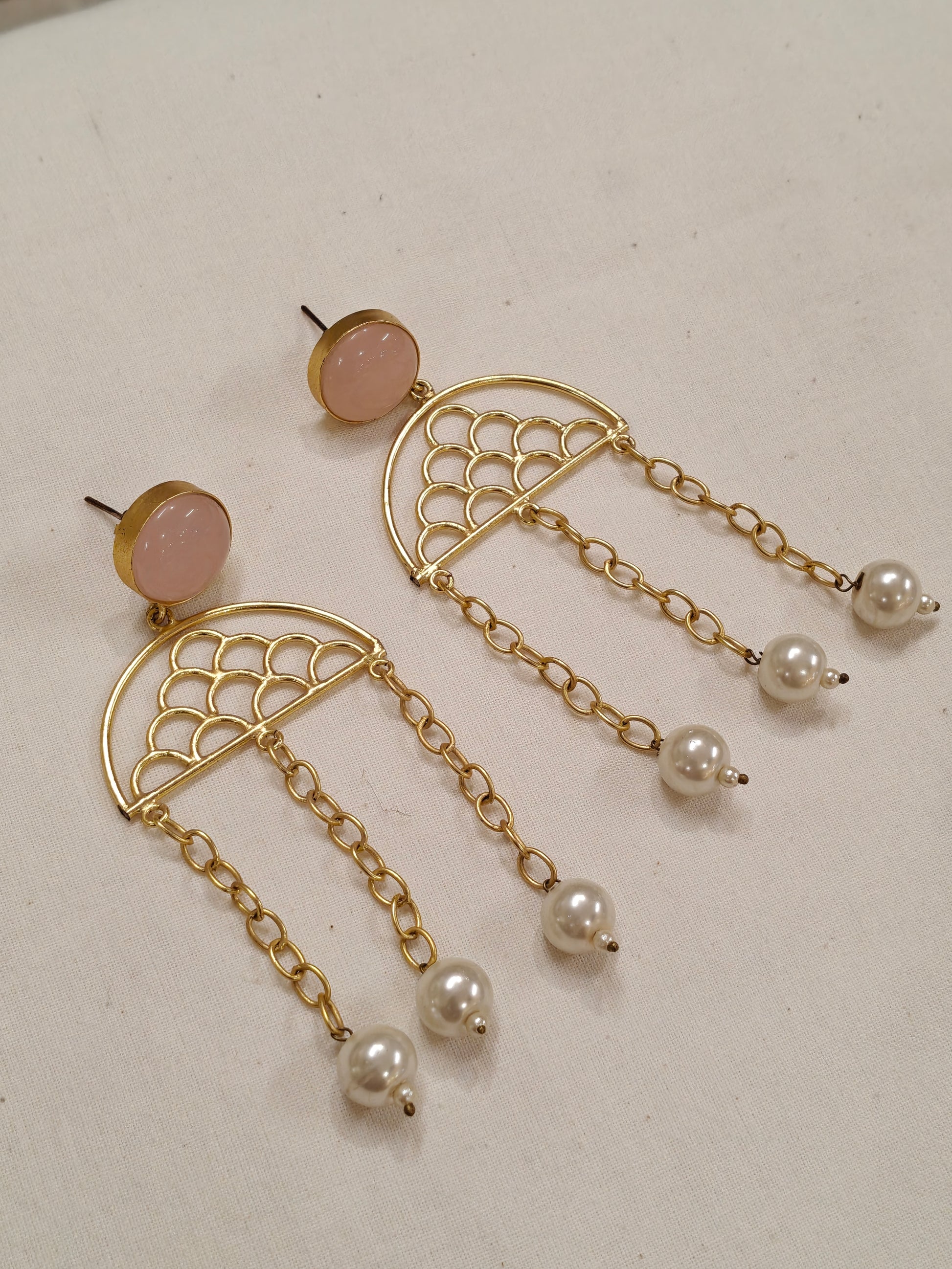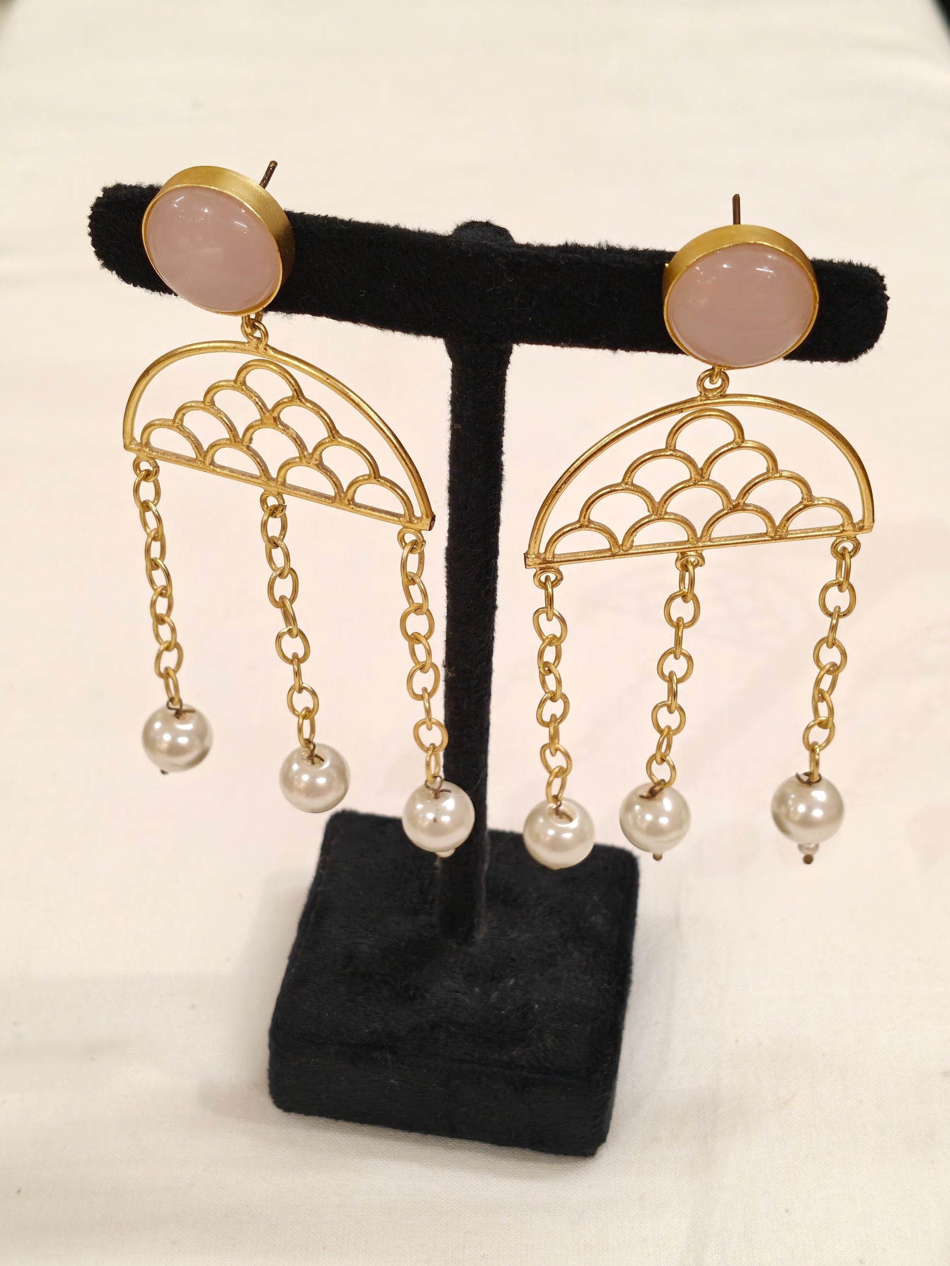 Umbrella shaped with baby pink stone and 3 pearl chain drops - earrings