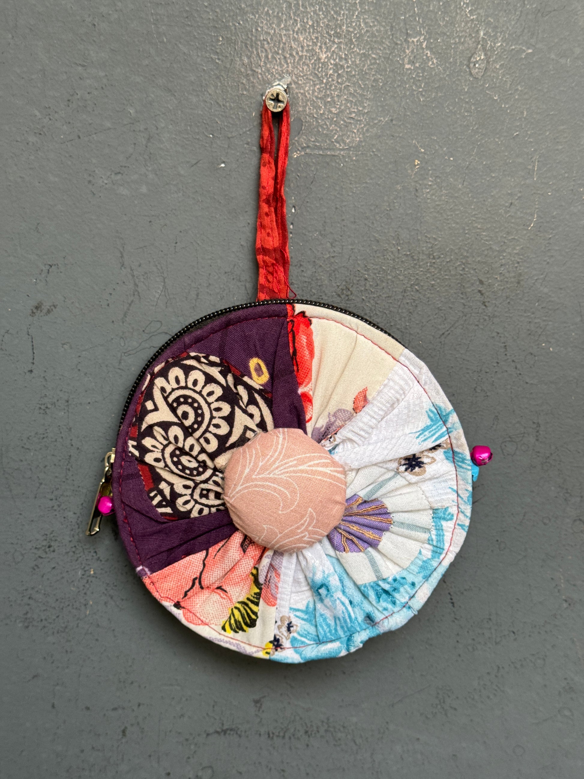 Upcycled handwoven fabric patch work round gifting / coin pouch with zipper closure