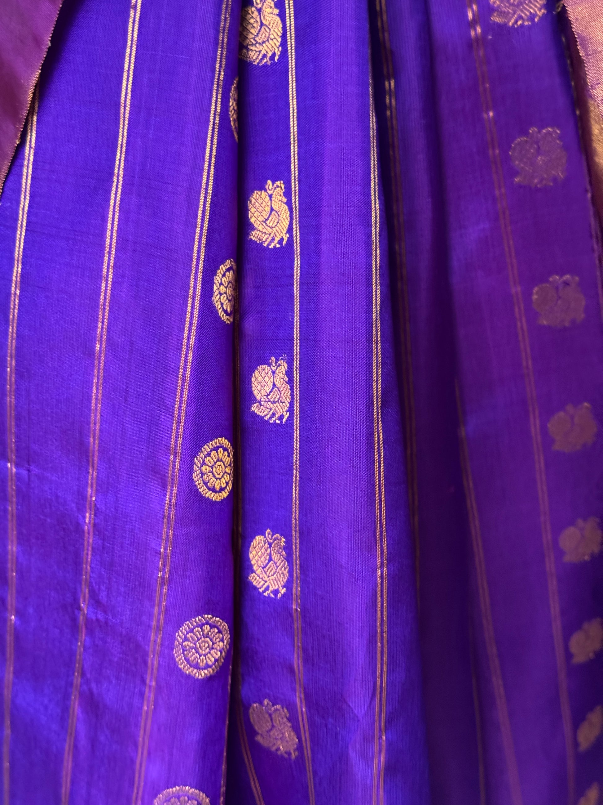 Violet stripes n butis pure silk handwoven Gadwal saree with kuttu temple border, rich palla