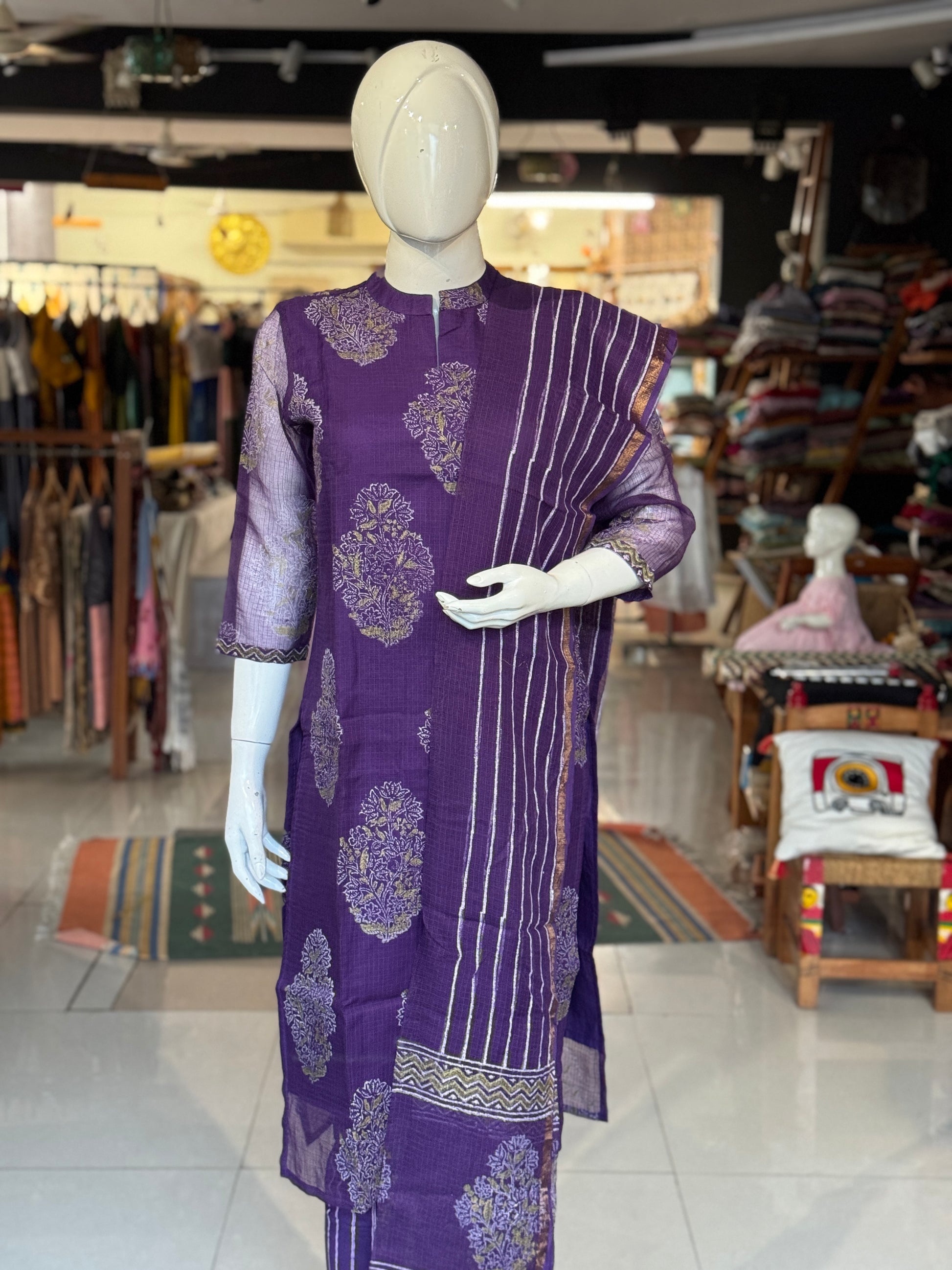 Violet hand block printed kota cotton straight kurti, pants and dupatta set - with hand embroidery