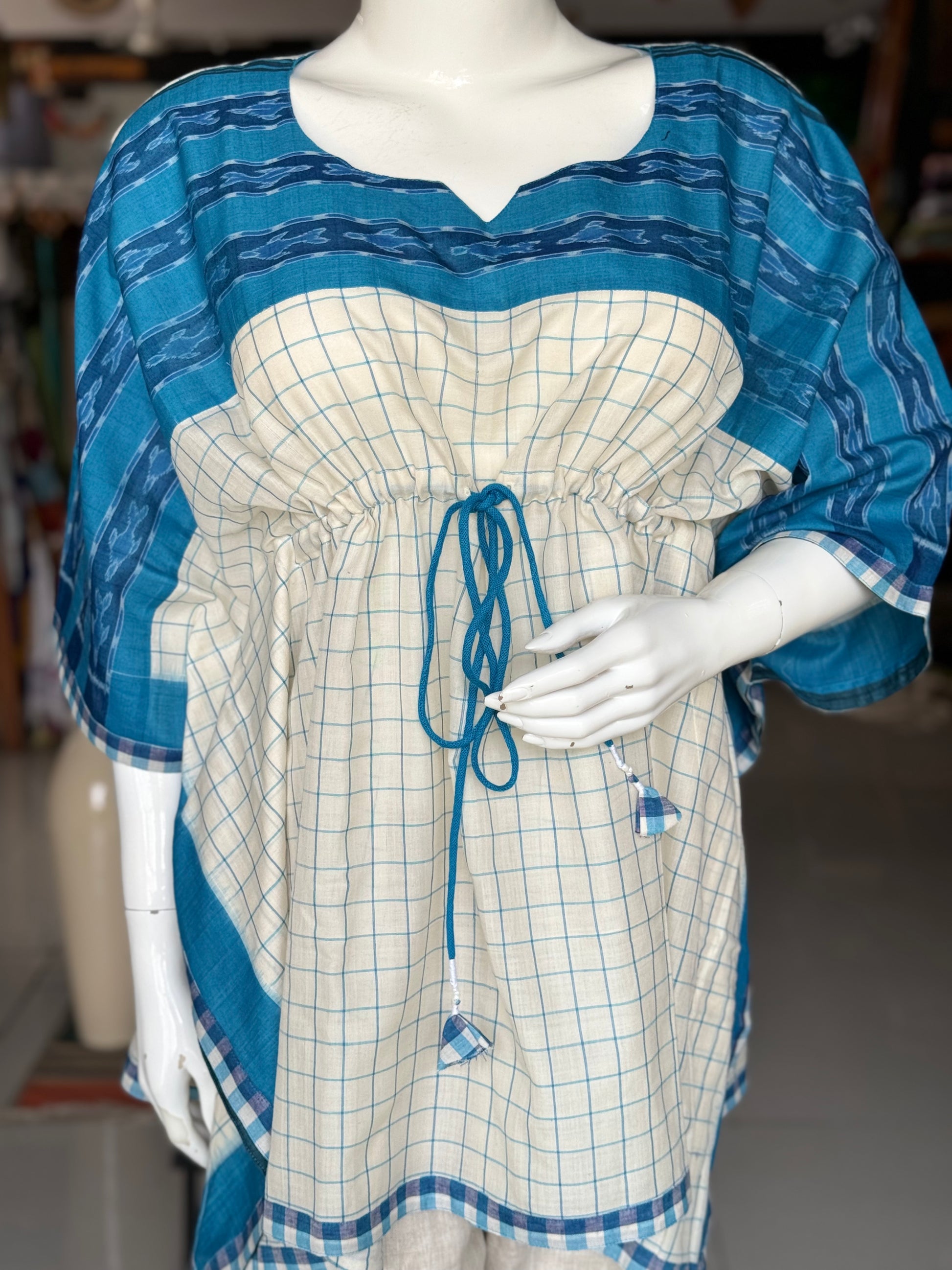 White and blue checks cotton handloom soft ikat kaftan top with draw string at waist
