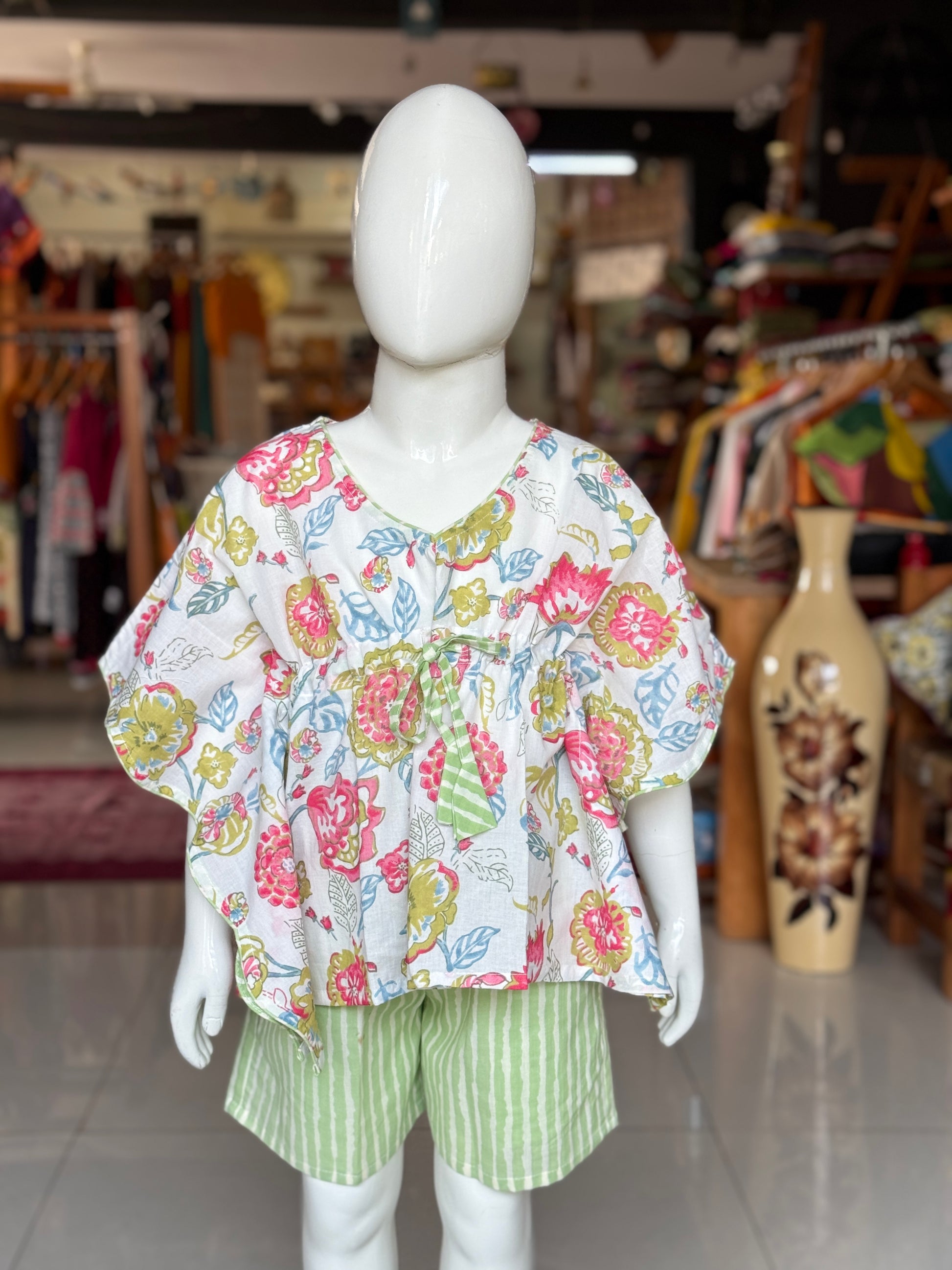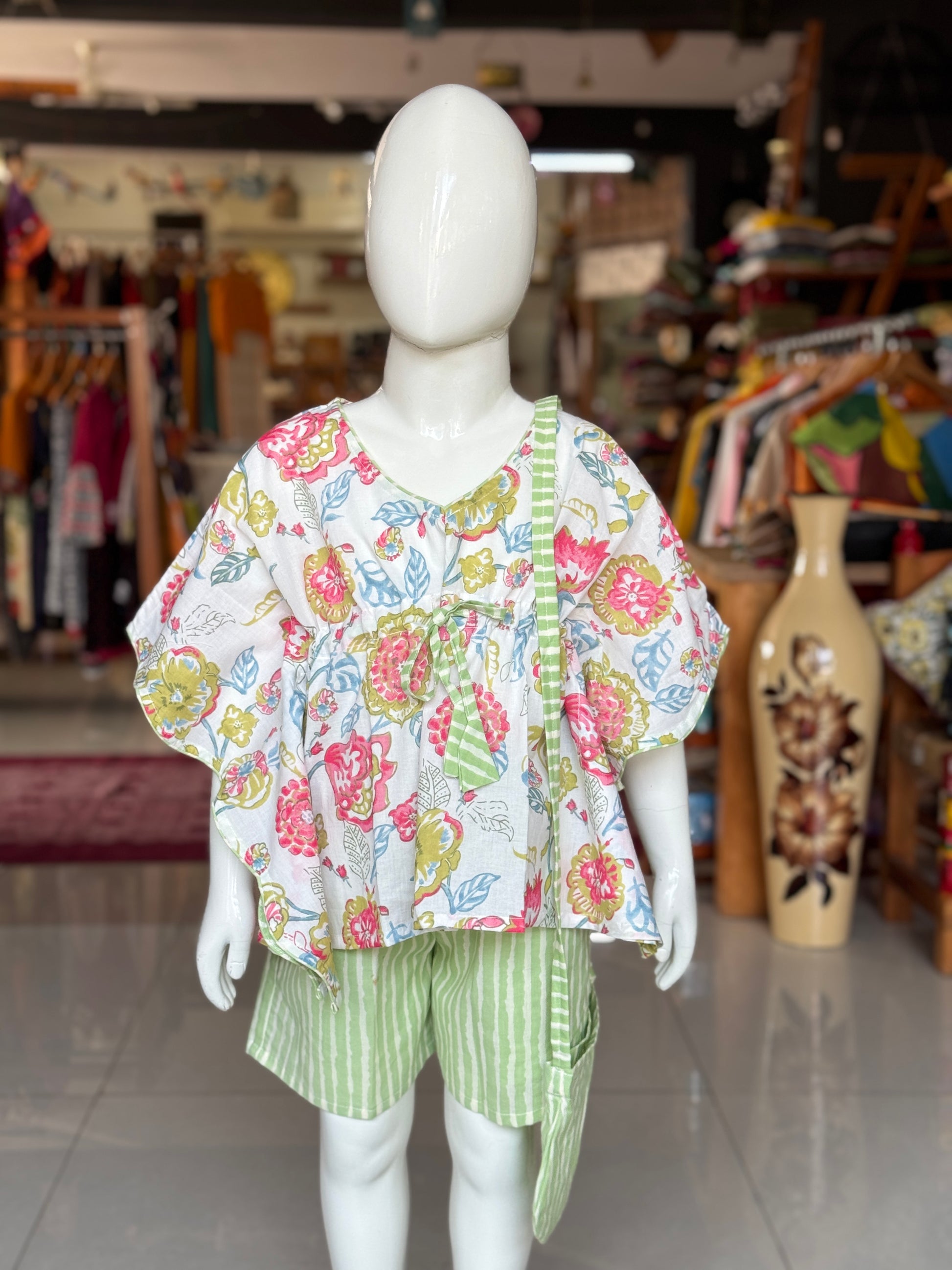 White and green floral hand block printed kaftan top with block printed stripes shorts and a matching bag - all in cotton