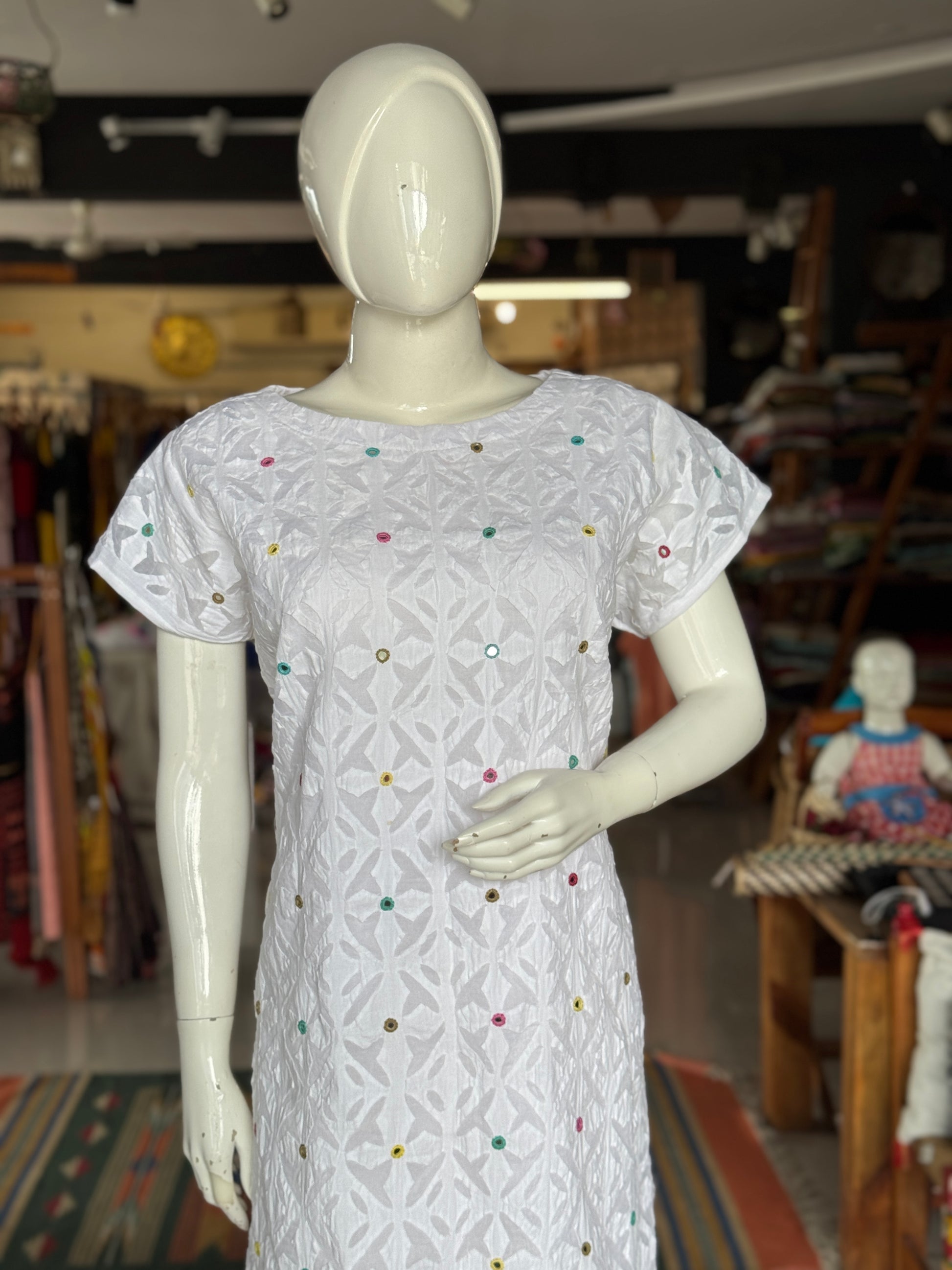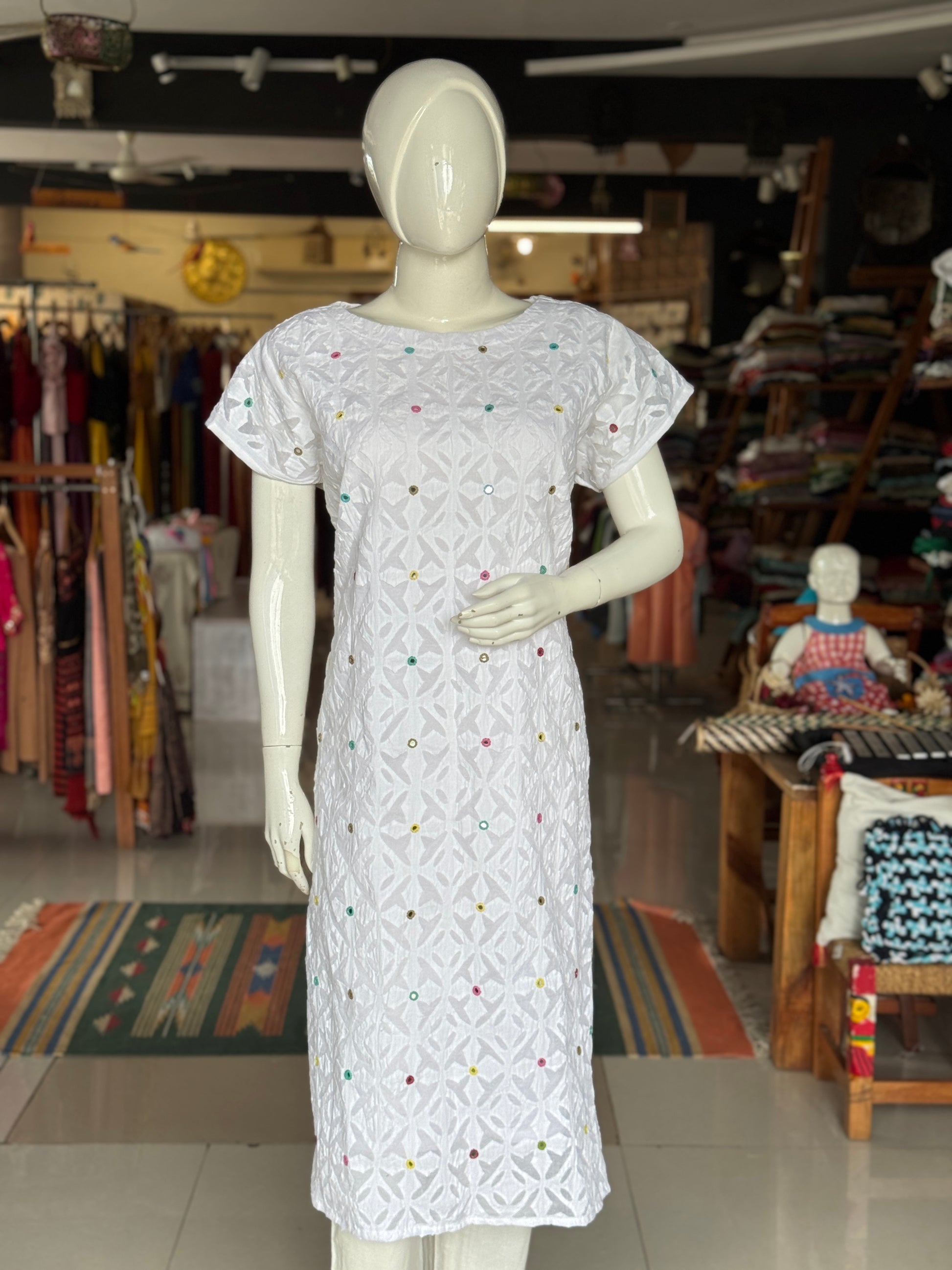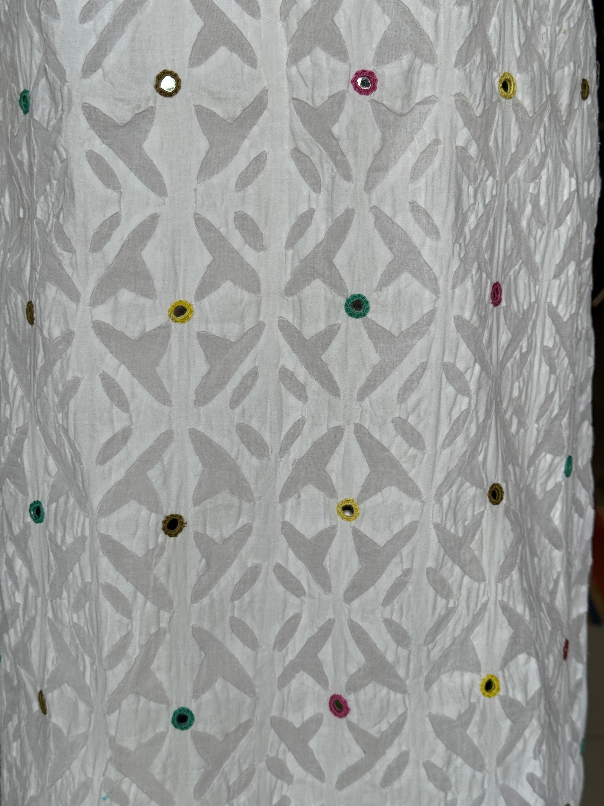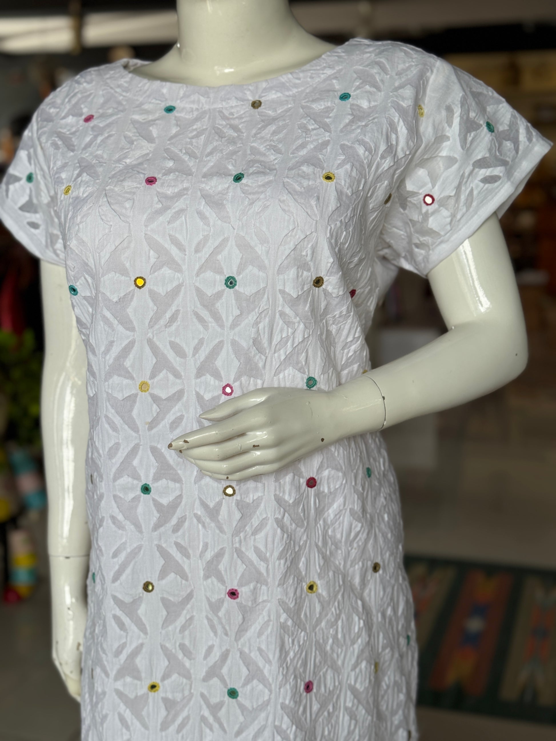 White appliq and hand embroidered mirror work cotton straight kurti with plain back