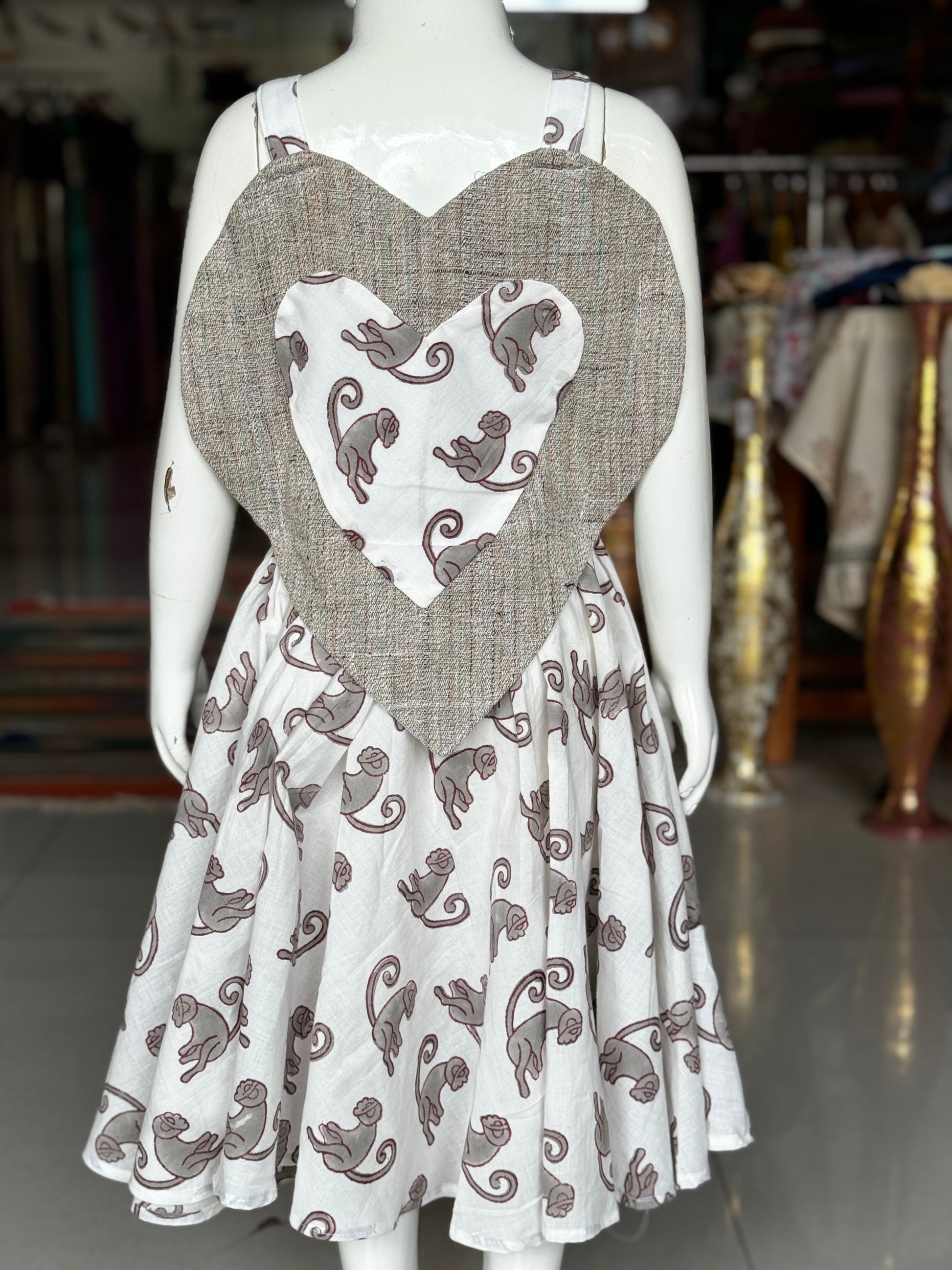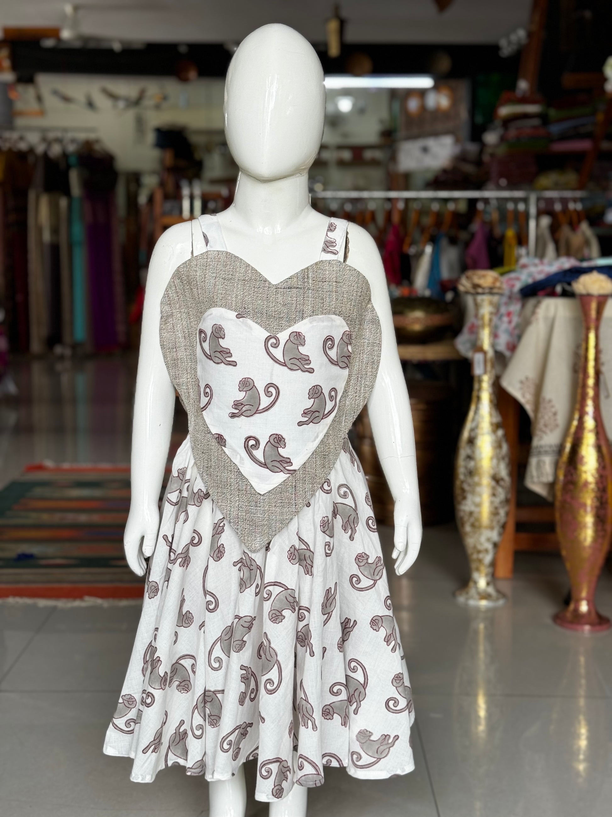 White monkeys hand block printed flared umbrella designer frock with handwoven grey heart yoke