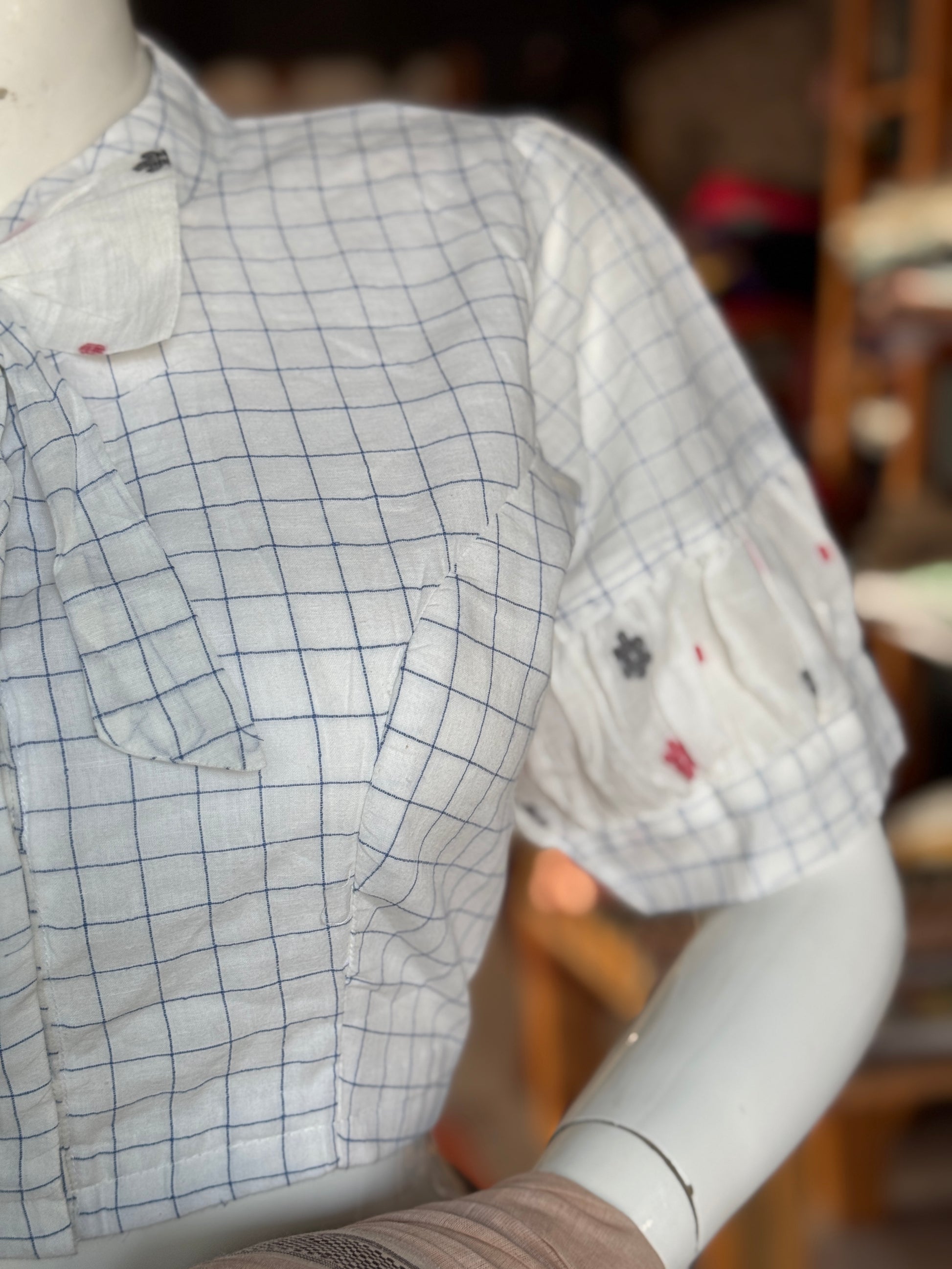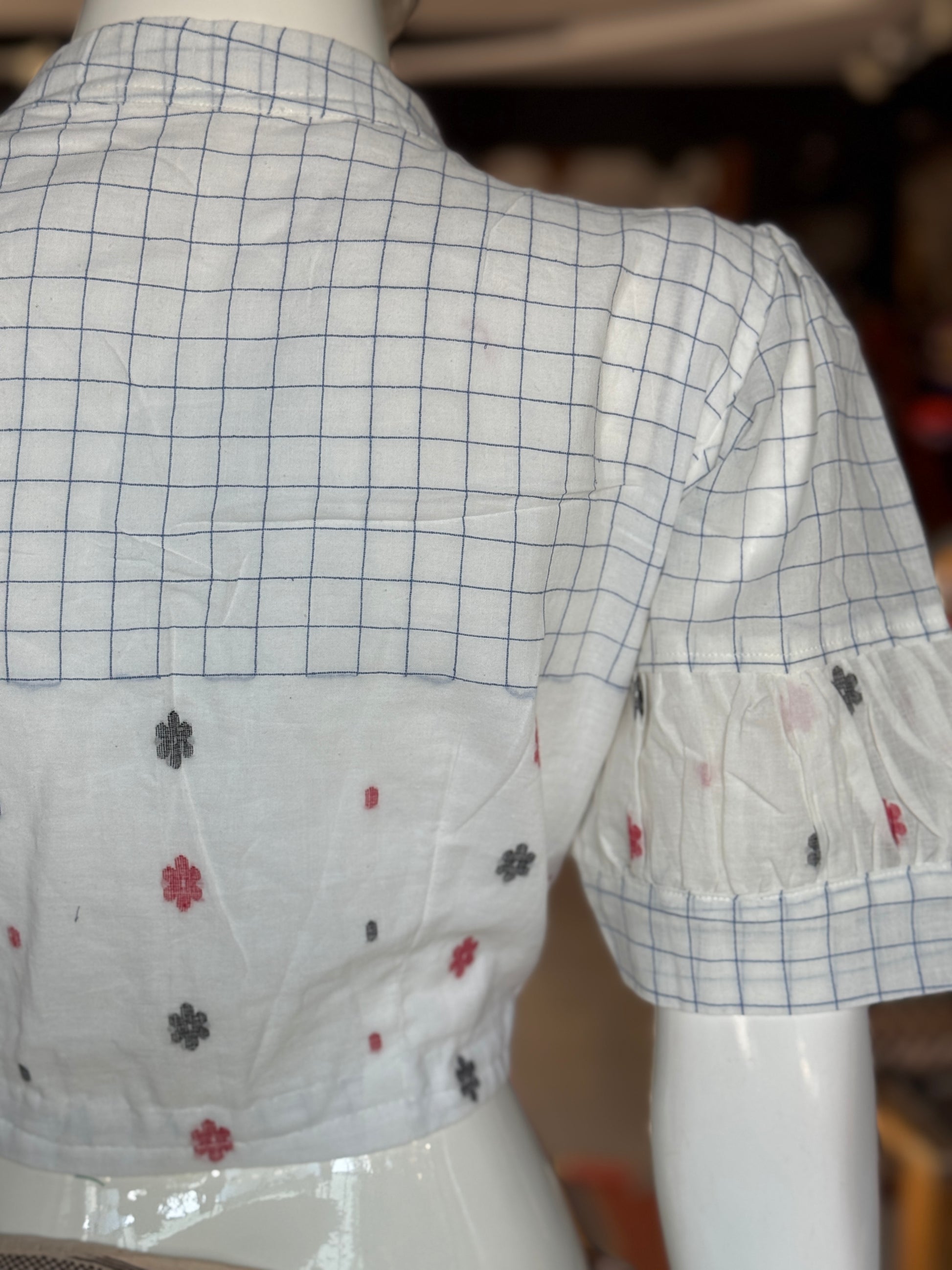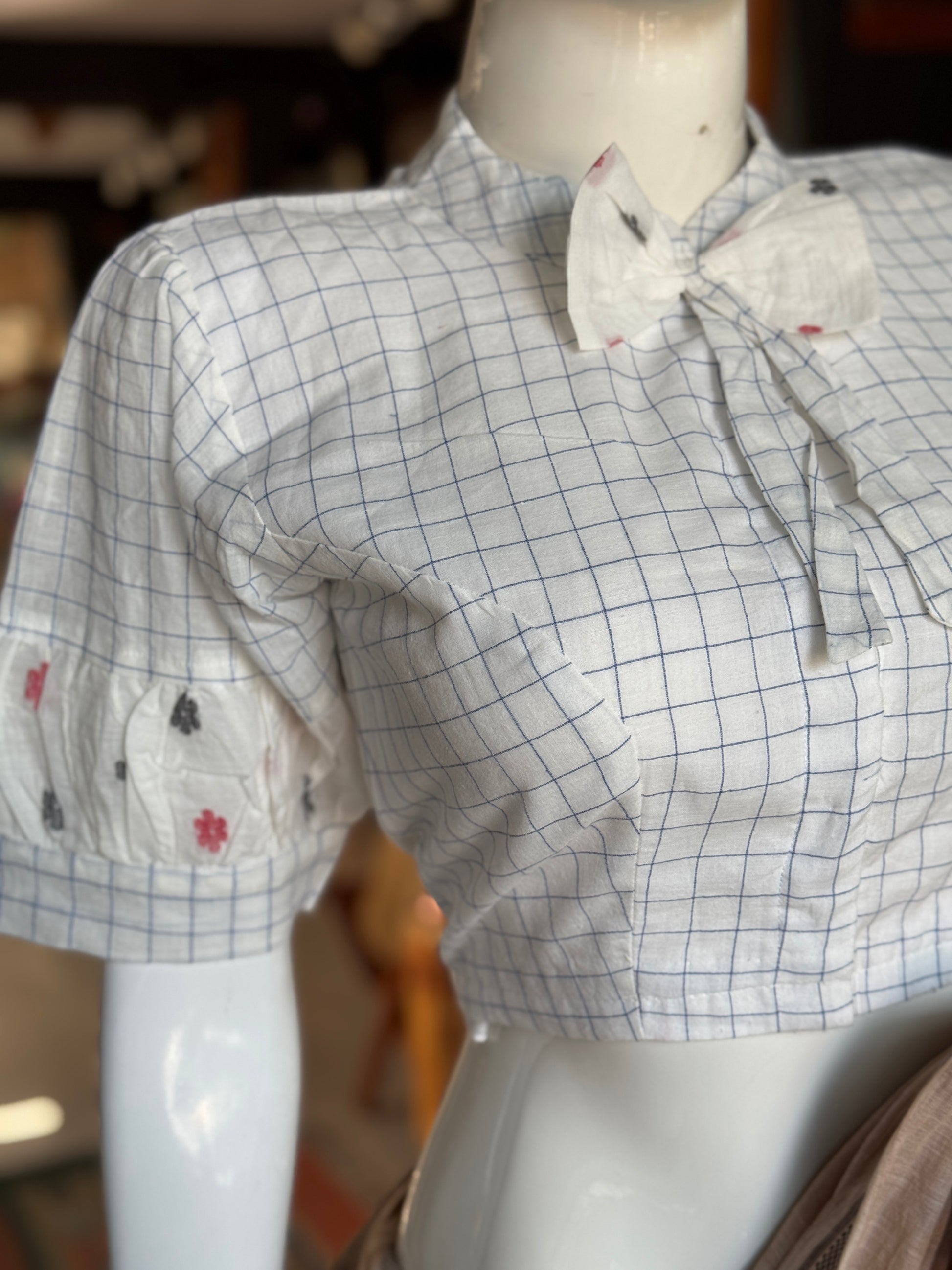 White n blue checks hand woven cotton Jamdani blouse with elbow length balloon sleeves and bow neck
