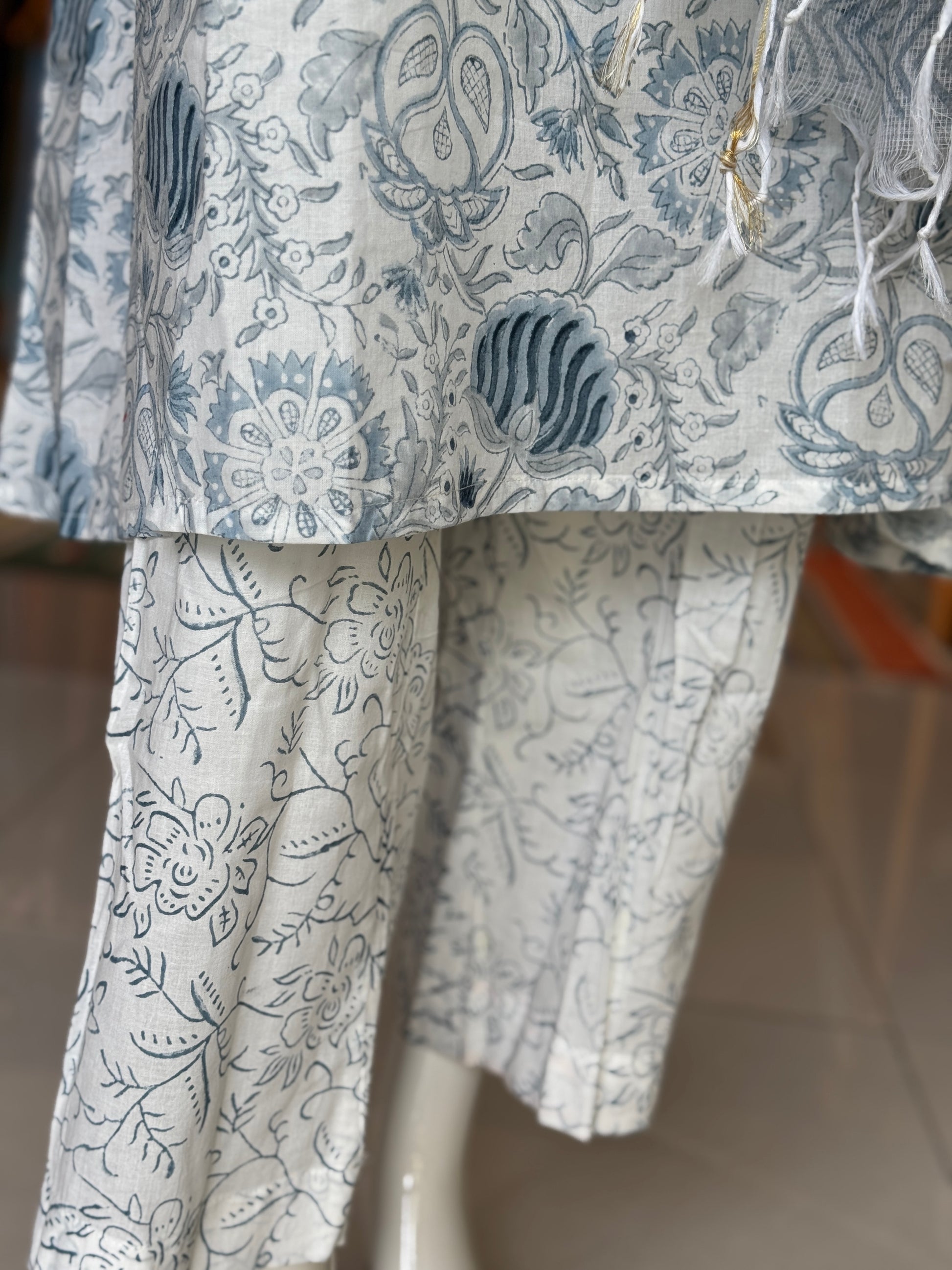 White n blue hand block printed cotton 3 piece a-line kurta suit set with kota doria dupatta