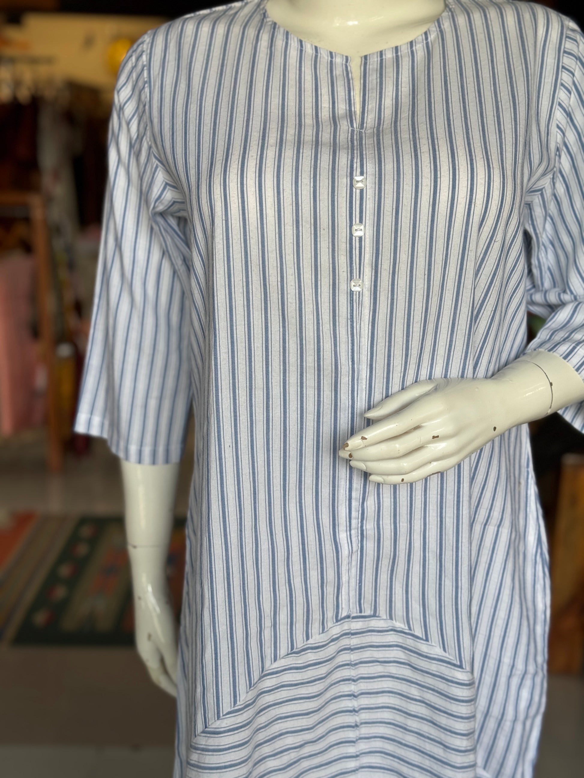 White n blue stripes dress with horizontal and vertical stripes