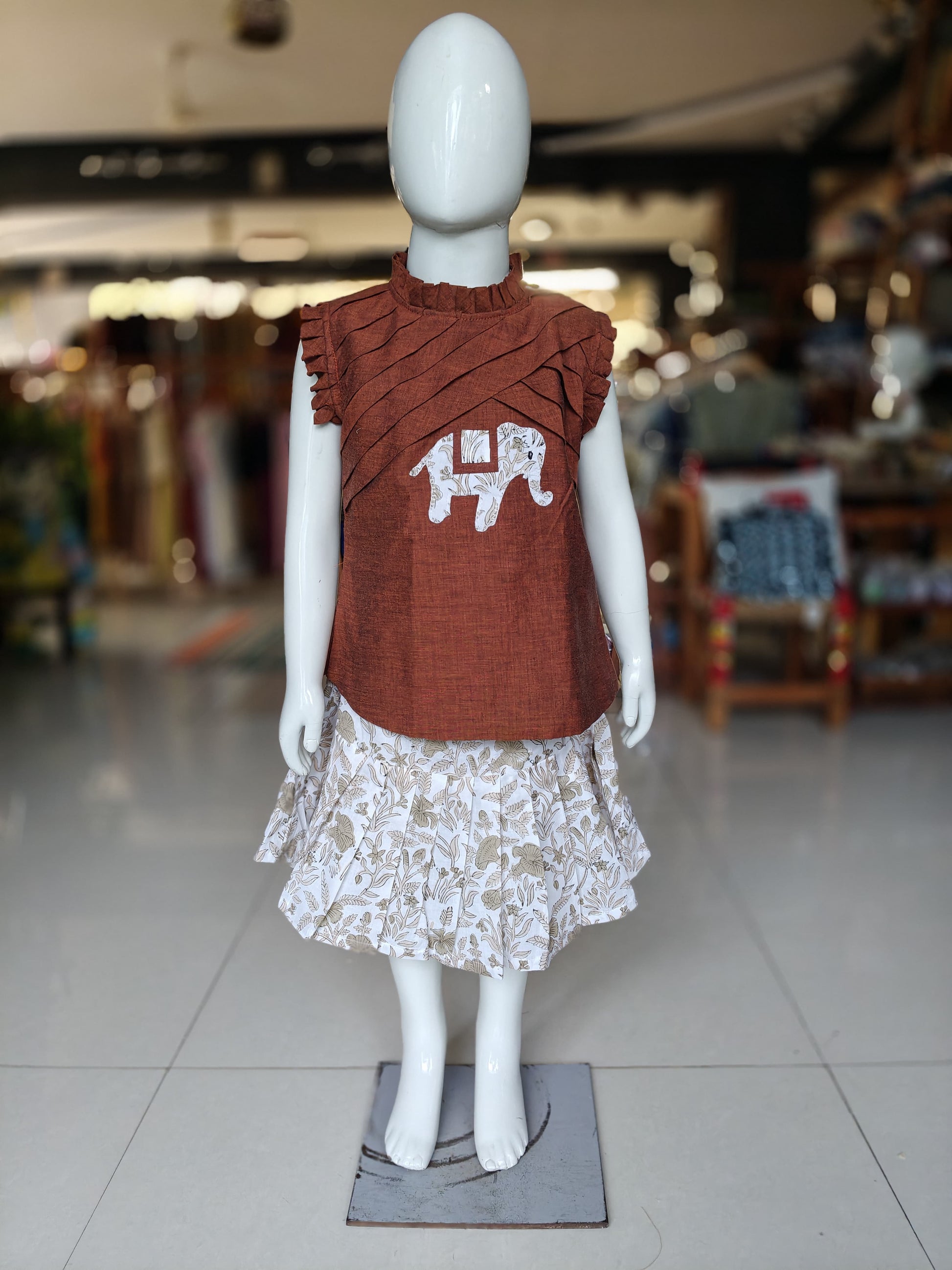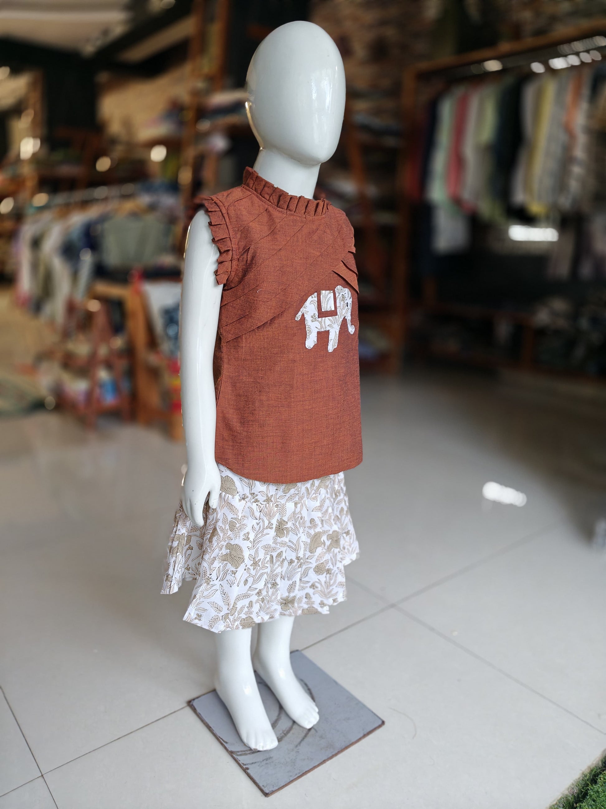 White n Brown hand block printed cotton skirt with inner shorts attached for little girls