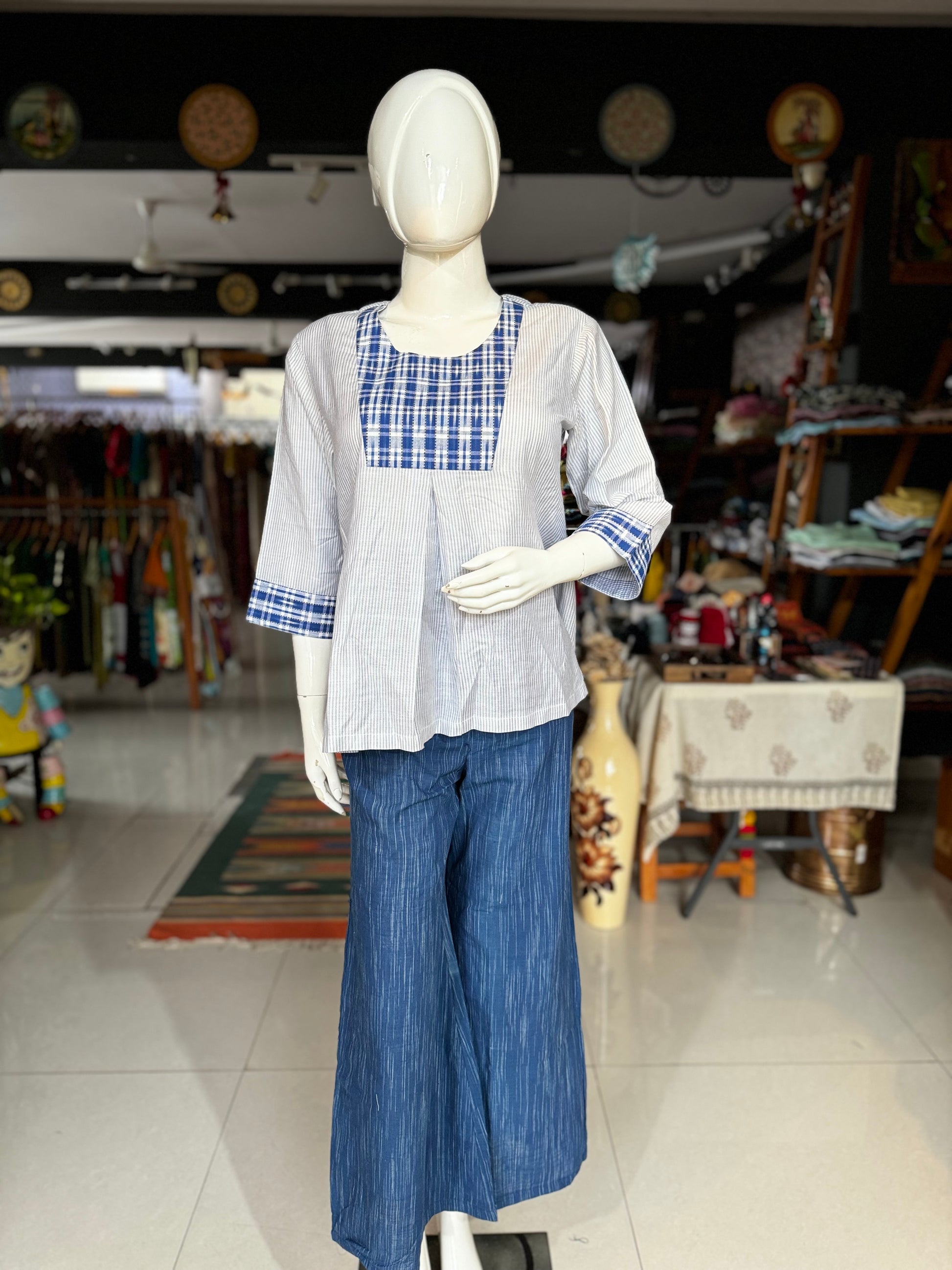 White stripes and blue ikat handloom cotton long sleeves tunic top for women