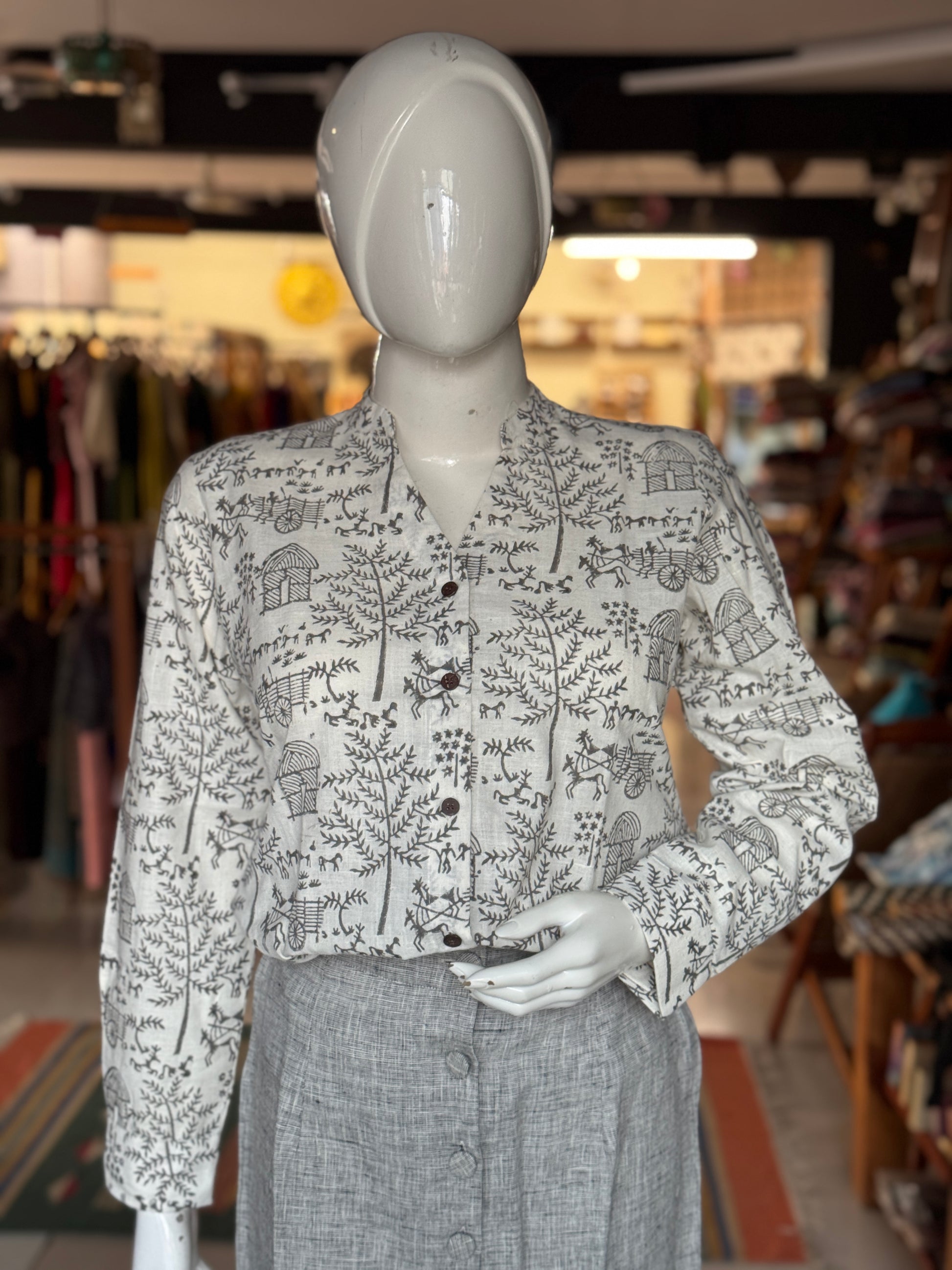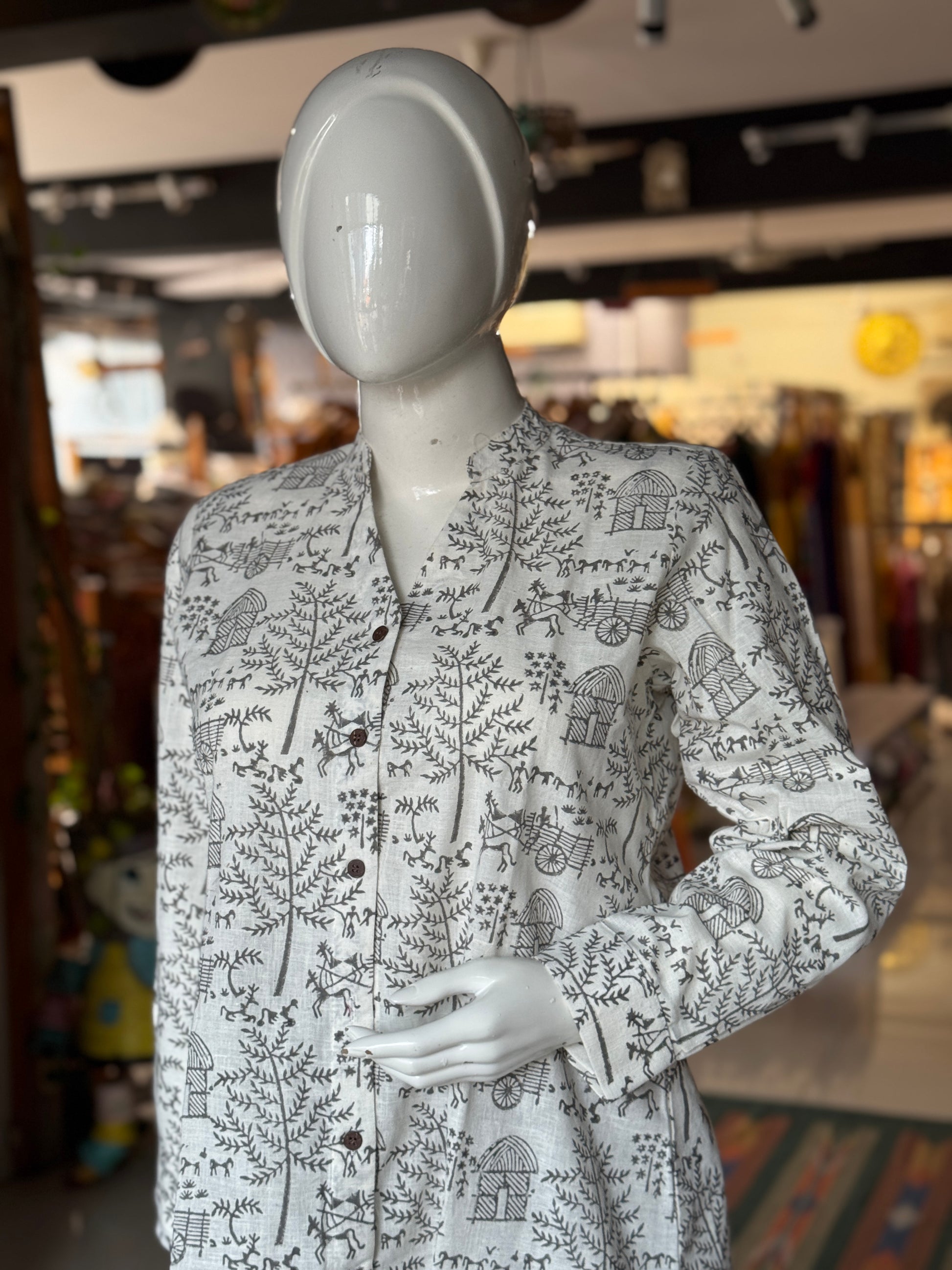 White, village theme print Chinese collared top with V-neckline - hand block printed, Hand spun, hand woven cotton