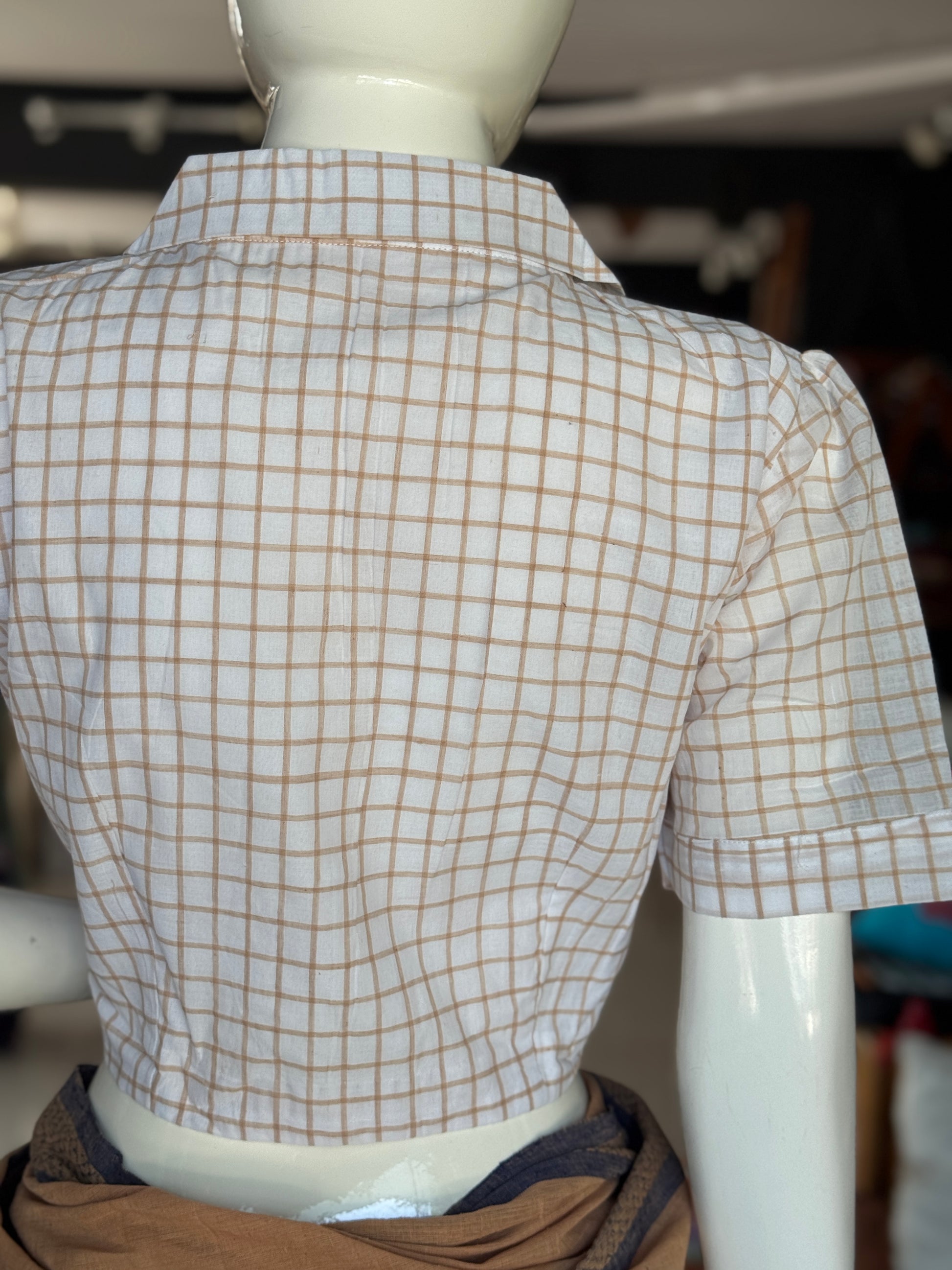 White with brown checks collared handloom cotton front open blouse